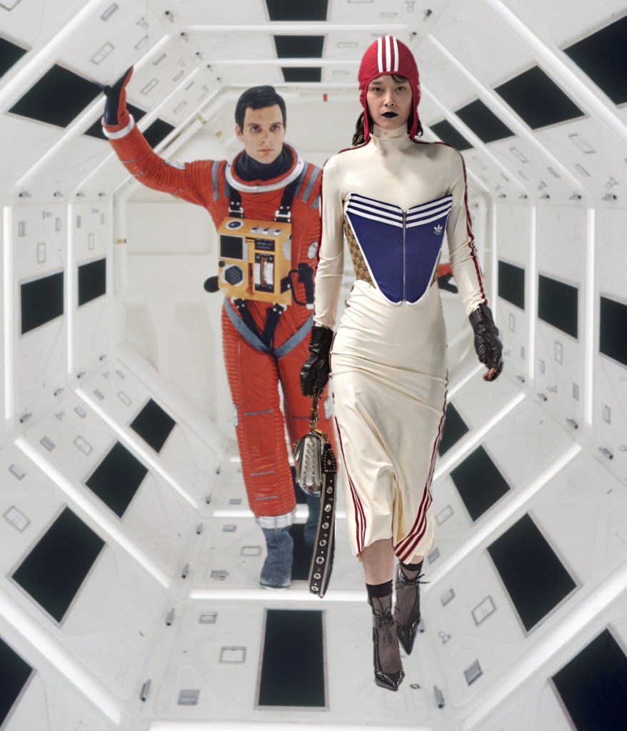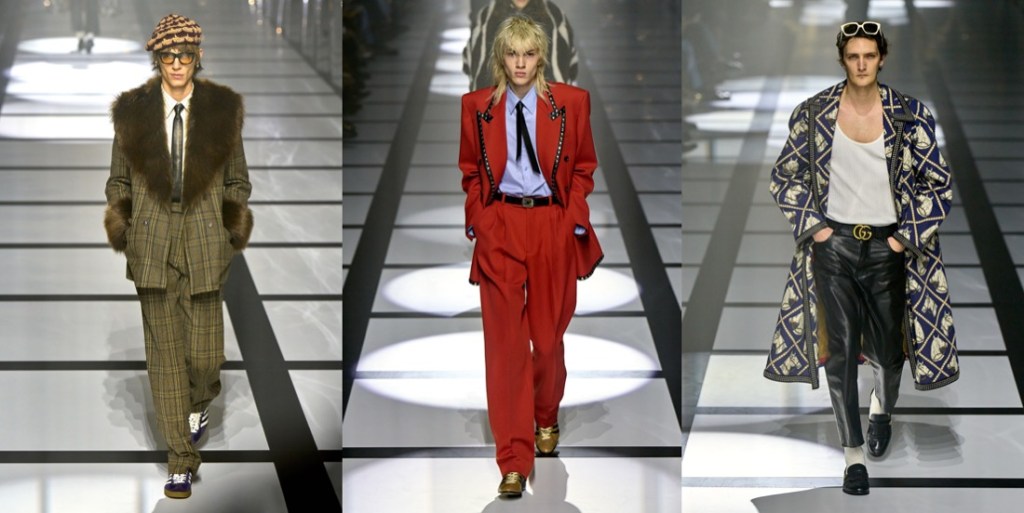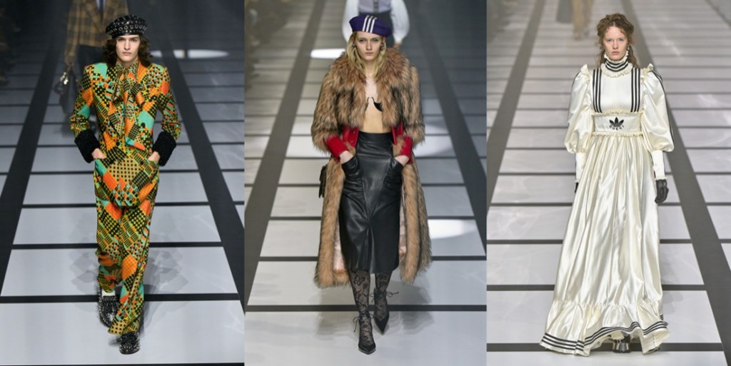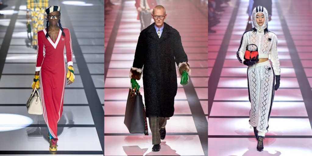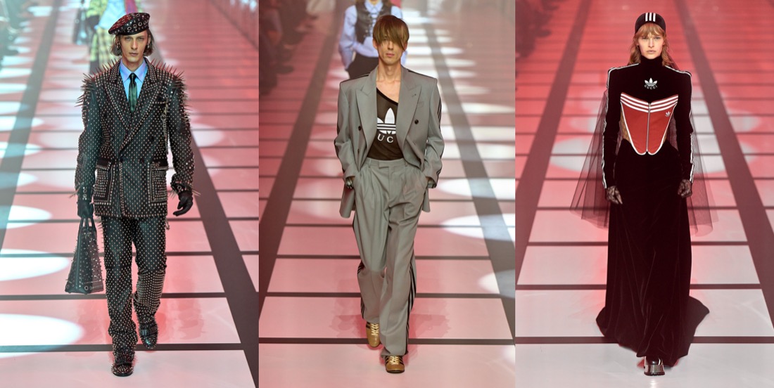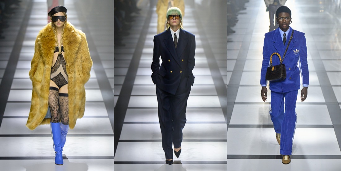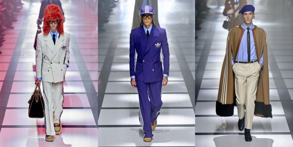 Alessandro Michele‘s autumn-winter 2022 fashion show failed to share any gesture of solidarity with Ukrainians, even though I thought he would be the first to do that in the industry. Possibly, his good intentions might have been tamed by the upper company structures. The distaste caused by the tone-deafness is one thing. In general, this line-up was one of the most mediocre collections coming from the designer in a while. The message for this collection, entitled “Exquisite Gucci“, was suits for all, with male and female models wearing versions of the Gucci sartorial two-piece. Alongside this focus on tailoring was a collaboration with Addidas Originals, which saw the sportswear brand’s iconic three stripes splashed over sharp cut suits, on leather gloves and baseball caps, or forming a dramatic V down the front of a corset dress. To be honest, most of the looks felt uninspiring, and I feel like we’ve seen enough of fashion collabs with Adidas in the last couple of years.