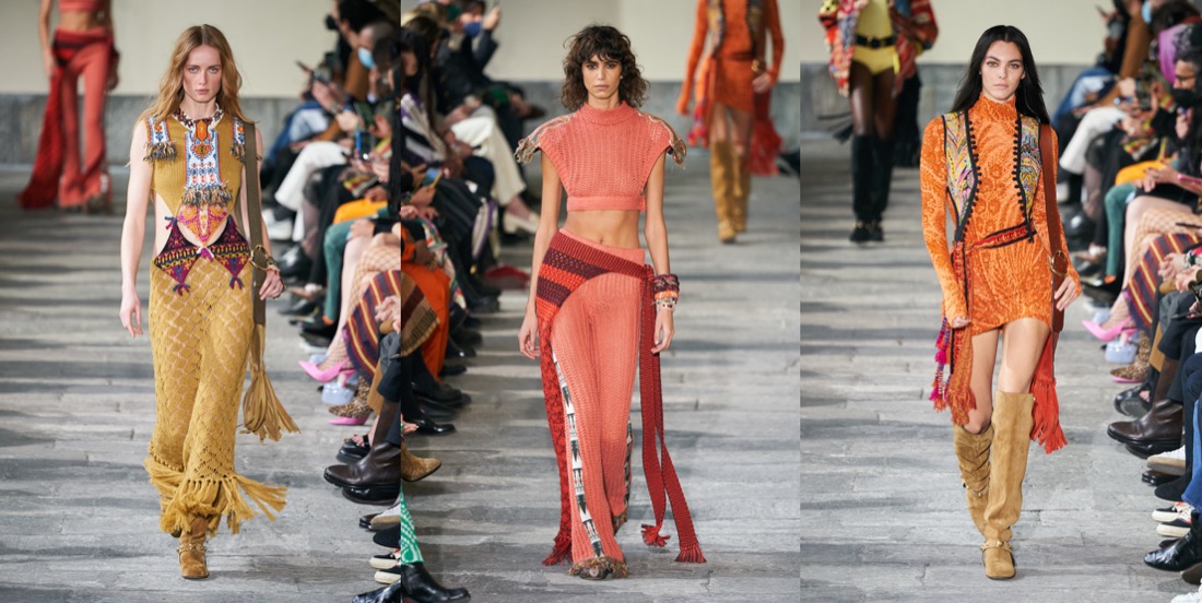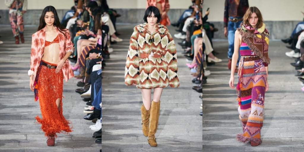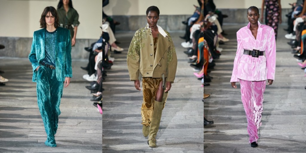 “The question I asked myself is: How can I deal with the prints in a totally new way? I wanted to go out of my body and see things from a completely different angle,” Veronica Etro explained backstage of her autumn-winter 2022 fashion show. “So I imagined aliens coming across our archive in 200 years and looking at them with micro-lenses that are sort of zooming in and blowing everything up. So it’s like zoomed heritage!” With Etro’s heritage looping back via its family-founded roots in Italy during the hippie late 1960s, to a style of shawl named after a Scottish mill town that made a massive 19th-century British Colonial fashion business out of appropriating a precious fabric whose culture belongs to Kashmir, on the border of India and Pakistan – the paisley pattern is always the given medium. Veronica Etro’s conundrum has been to contemporize and reconfigure all of that, expanding the range of what her brand can be without losing its character. “You know, Etro was a lifestyle brand,” she observed backstage. “I think the strength is that it has a strong identity, but at the same time it leaves women open to interpret and to be individual and to personalize. It’s about how we can embrace different personalities – I never wanted to make it homogeneous, to make uniforms.” This time she traveled through boho, arty-crafty knitwear to ’80s puffy-silhouetted patchwork bomber jackets to end up with suave, ’70s crushed-velvet trouser suits and slinky bias-cut black satin dresses. Some of it looked like an Italian version of Isabel Marant – and this isn’t something bad. The paisley registered in various graphic forms – super enlarged to look like an animal-print lining on a shearling aviator jacket, or deconstructed down to its “harlequin” elements, stamped in repeat on a vibrant pink velvet jacket and a semisheer, diaphanous chiffon dress.