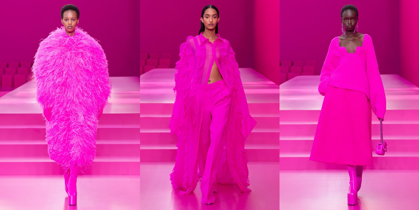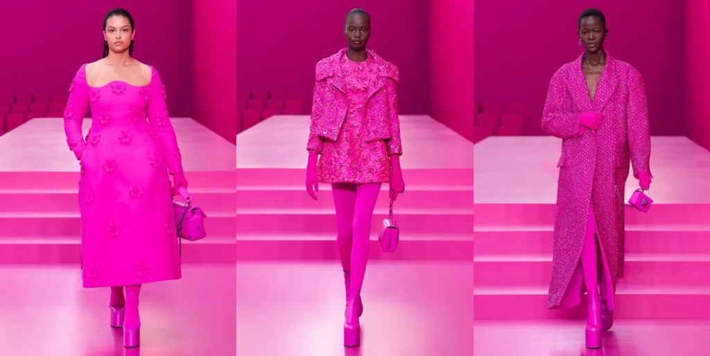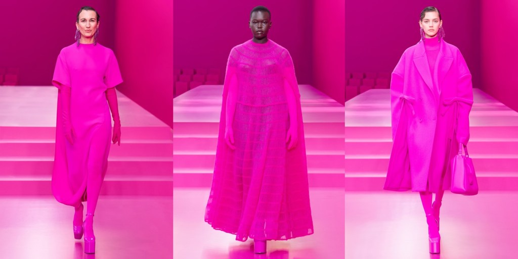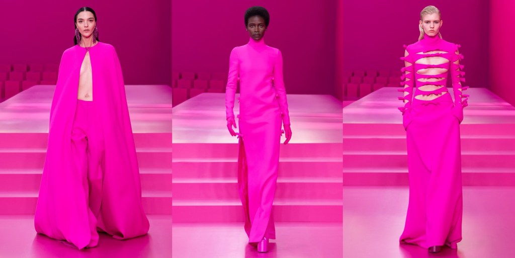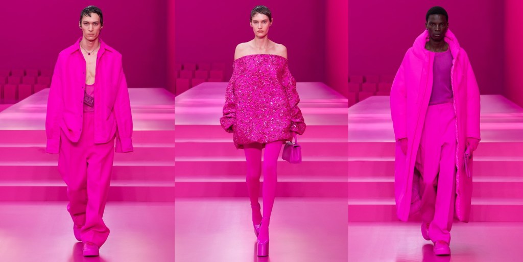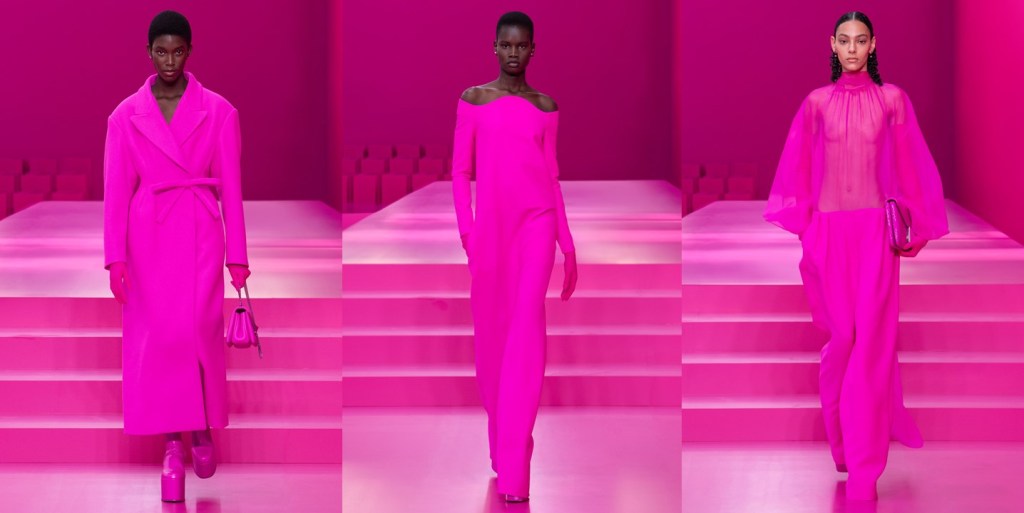 This season’s Valentino collection was entirely pink and black, which at first might sound like a banal thing to do. “I was fascinated by the idea of having this moment of reflection and digging deeper,” Pierpaolo Piccioli said during a preview. Presented in a huge space painted to match the exact pink of the collection, his idea was to intensify the senses and make us look at the details of each garment – the silhouette, the neckline, the surface decoration – rather than focusing on “looks”. Ultimately, he said, he wanted the character of each model to stand out, rather than what their appearance represented. “I was reading a book about Fontana [the Italian artist and Spatialist], who used to cut up his work – not in order to destroy it but to build new opportunities; new dimensions,” the designer went on. “You know when you see a book of black and white portraits, after two or three pages you know it’s a black and white portrait book, so you don’t expect to see blonde hair and blue eyes? You go deeper into expressions: wrinkles… I wanted to get that feeling.” Once the eye adjusted to all that pink, the effect did work. You noticed the details of garments, and looked at the models’ faces. For Piccioli, whose work always revolves around the celebration of individuality and diversity, the monochromatism – which is, in essence, uniformity – was meant to draw the observer’s attention to the individual wearing the clothes. To underscore that point, he focused on necklines – what he called “Madonna meets the street” referring to the way the Holy Mother’s face was framed by Renaissance artists – and placed them on a cast including Penelope Tree and Kristen McMenamy. The collection continued Piccioli’s couture-ification of everyday codes, adapted for ready-to-wear. A t-shirt elongated into a draped minidress, a sporty jumpsuit morphed into a formalwear silhouette, and a generational cargo suit was imbued with a glamorous hourglass shape. Menswear dealt in the very oversized, from giant suits to puffer coats and highly embellished transparent evening tops, all of which will be sold in stores in just pink and black, the way it was presented, Piccioli vowed. By the way, this isn’t just a shade of pink. Piccioli’s particular shade of pink will be added to Pantone’s official colour scale under the name of “Pink PP” – a counterpart, perhaps, to Valentino Garavani’s “Valentino Red”. And while he never wears pink himself, Piccoli explained it’s an ongoing fascination. “I always want pink in my collections. It’s a colour I feel you can subvert better, because it already has a lot of meaning. It changed during the centuries: it was the colour of the power of men, then it became girlish… I like to subvert the idea. Today, it means different things.”