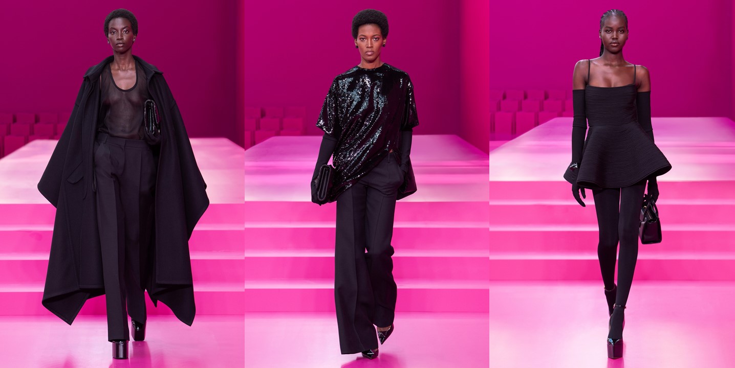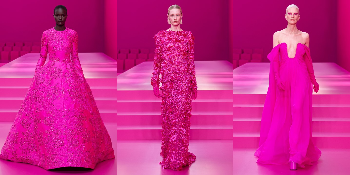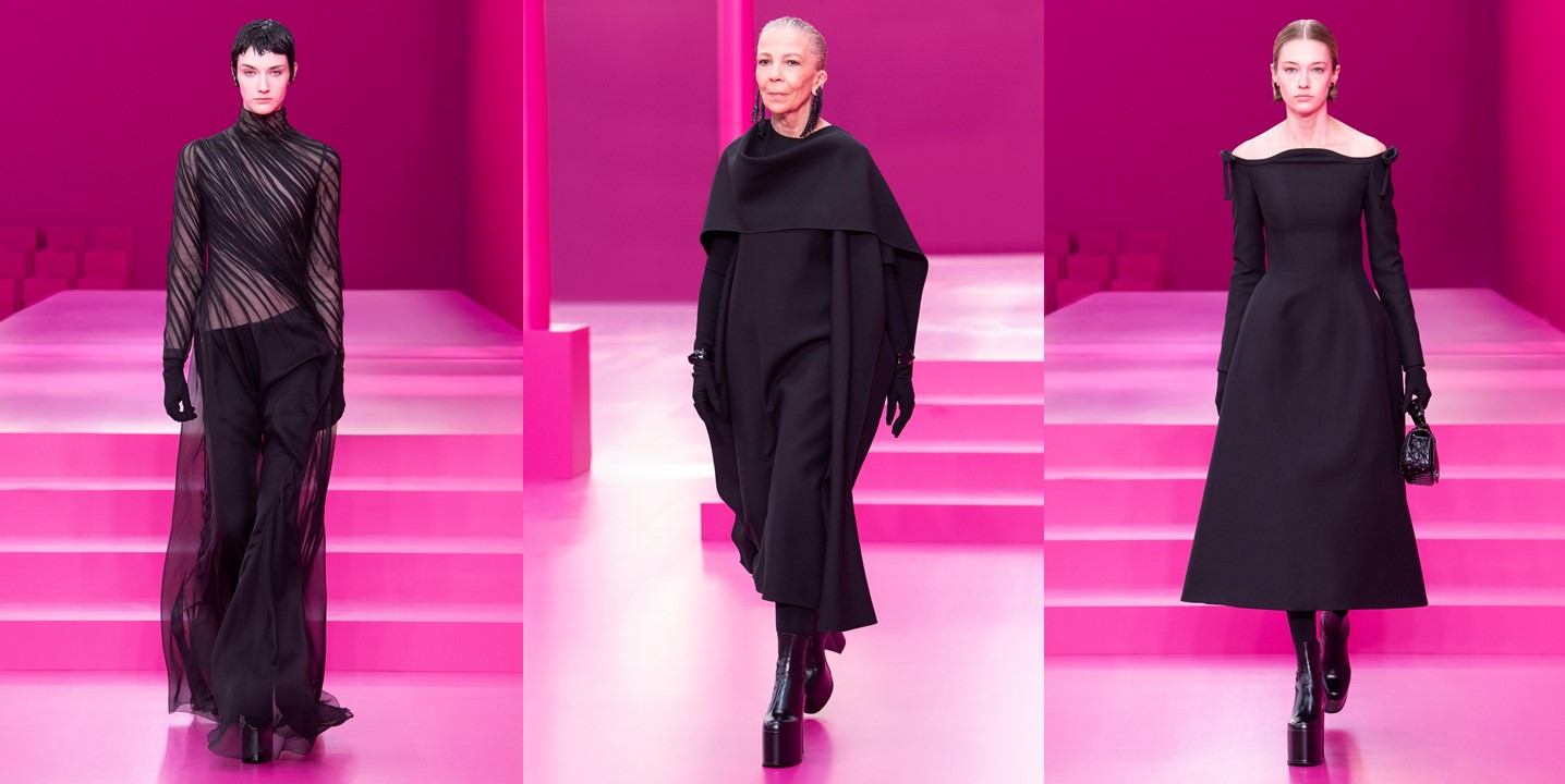 This season’s Valentino collection was entirely pink and black, which at first might sound like a banal thing to do. “I was fascinated by the idea of having this moment of reflection and digging deeper,” Pierpaolo Piccioli said during a preview. Presented in a huge space painted to match the exact pink of the collection, his idea was to intensify the senses and make us look at the details of each garment – the silhouette, the neckline, the surface decoration – rather than focusing on “looks”. Ultimately, he said, he wanted the character of each model to stand out, rather than what their appearance represented. “I was reading a book about Fontana [the Italian artist and Spatialist], who used to cut up his work – not in order to destroy it but to build new opportunities; new dimensions,” the designer went on. “You know when you see a book of black and white portraits, after two or three pages you know it’s a black and white portrait book, so you don’t expect to see blonde hair and blue eyes? You go deeper into expressions: wrinkles… I wanted to get that feeling.” Once the eye adjusted to all that pink, the effect did work. You noticed the details of garments, and looked at the models’ faces. For Piccioli, whose work always revolves around the celebration of individuality and diversity, the monochromatism – which is, in essence, uniformity – was meant to draw the observer’s attention to the individual wearing the clothes. To underscore that point, he focused on necklines – what he called “Madonna meets the street” referring to the way the Holy Mother’s face was framed by Renaissance artists – and placed them on a cast including Penelope Tree and Kristen McMenamy. The collection continued Piccioli’s couture-ification of everyday codes, adapted for ready-to-wear. A t-shirt elongated into a draped minidress, a sporty jumpsuit morphed into a formalwear silhouette, and a generational cargo suit was imbued with a glamorous hourglass shape. Menswear dealt in the very oversized, from giant suits to puffer coats and highly embellished transparent evening tops, all of which will be sold in stores in just pink and black, the way it was presented, Piccioli vowed. By the way, this isn’t just a shade of pink. Piccioli’s particular shade of pink will be added to Pantone’s official colour scale under the name of “Pink PP” – a counterpart, perhaps, to Valentino Garavani’s “Valentino Red”. And while he never wears pink himself, Piccoli explained it’s an ongoing fascination. “I always want pink in my collections. It’s a colour I feel you can subvert better, because it already has a lot of meaning. It changed during the centuries: it was the colour of the power of men, then it became girlish… I like to subvert the idea. Today, it means different things.”