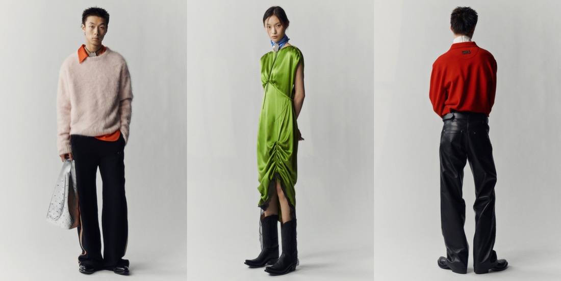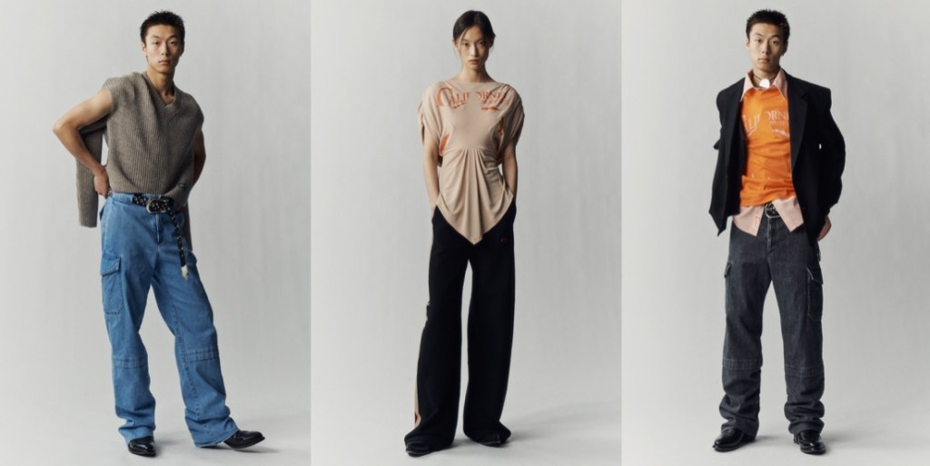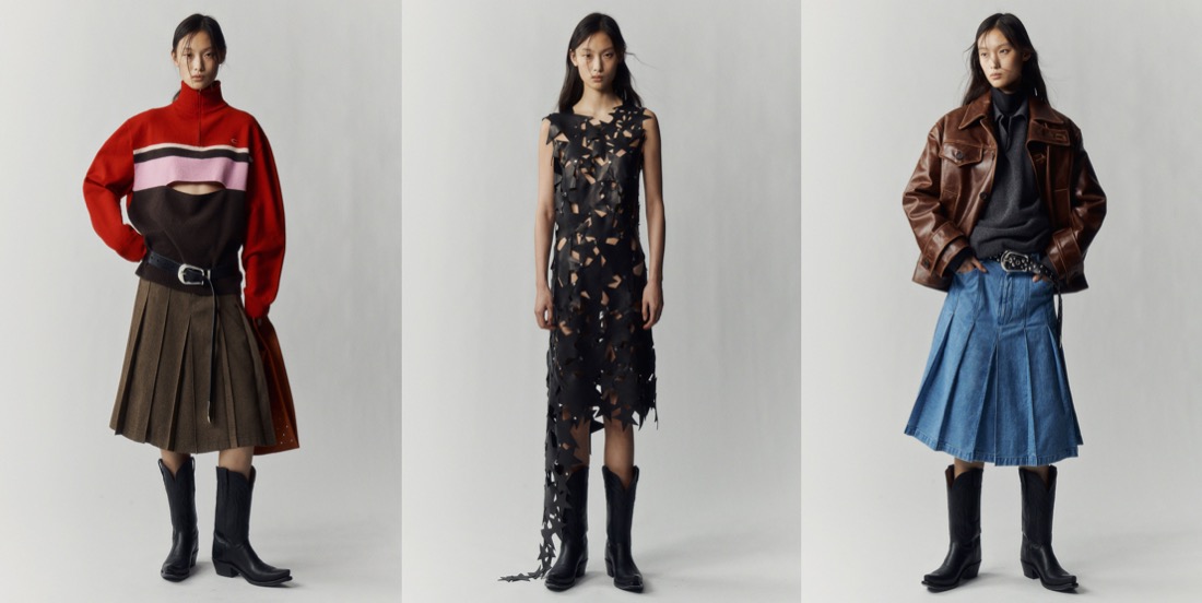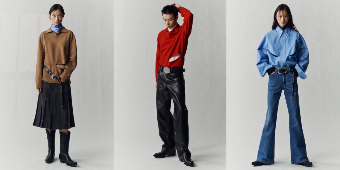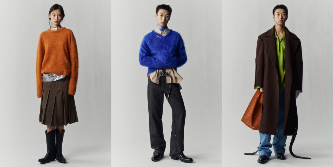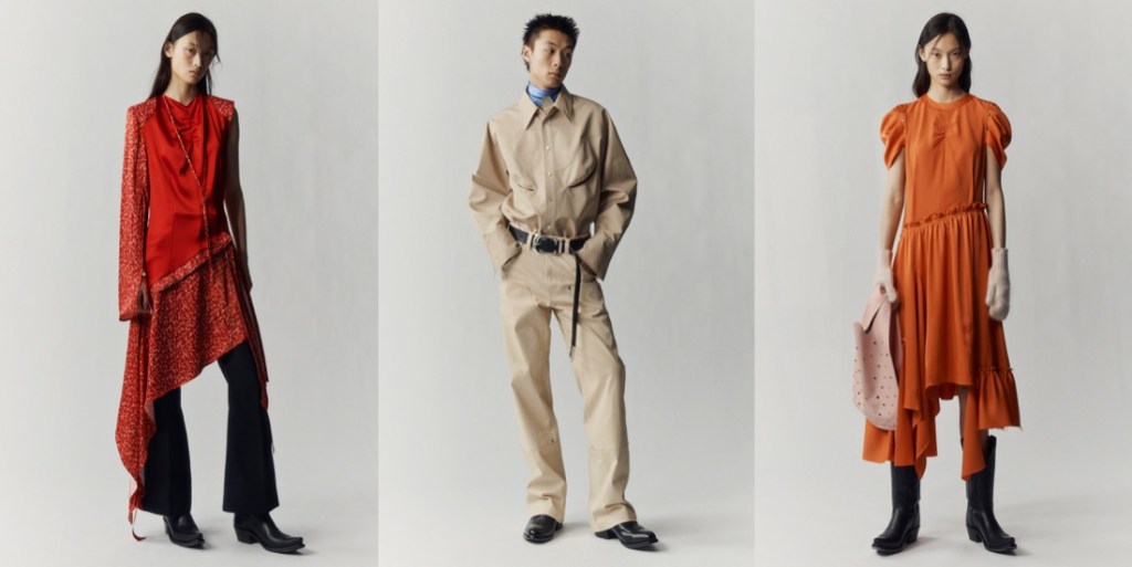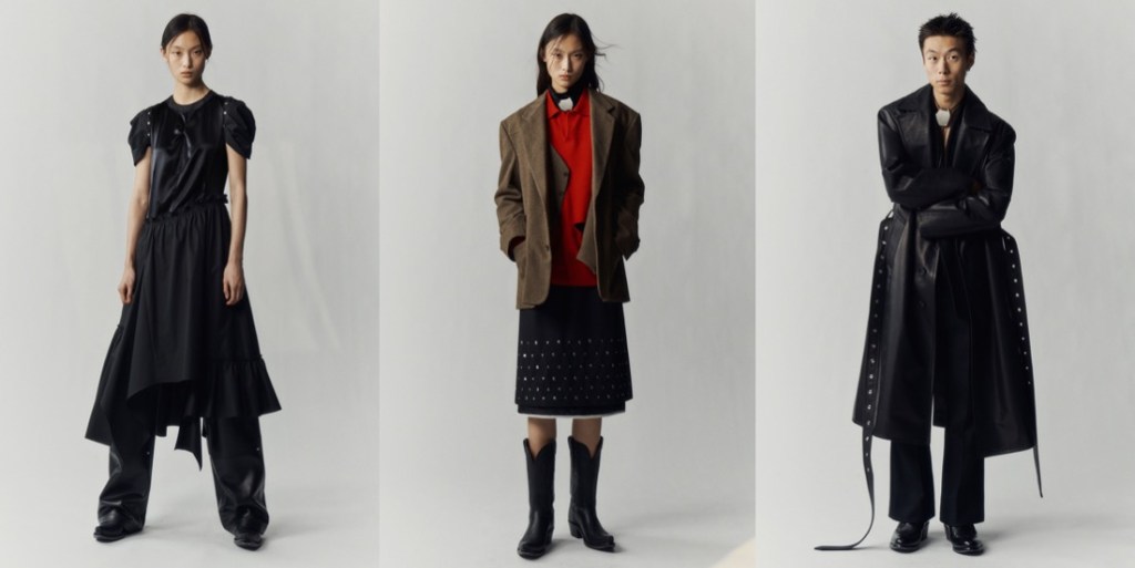 Commission, the New York-based label, is about garments, not gimmicks. For autumn-winter 2022 season, Dylan Cao, Jin Kay, and Huy Luong were thinking about non-American perspectives on America (all three designers were born and raised in Asia) and classic American fashion. Jeans, leather pants, Western belt buckles, and star-patched tees are the most obvious elements of Americana here. Look deeper than the hand-distressed unisex leather jacket, and you’ll find lush “cloud knits,” sporty tracksuits with blouson tops, trad office shirting with underbreast cut-outs, and a brown wool skirt suit with a schoolgirl vest inset into the blazer. A slash motif, which could read as a little try-hard, worked mostly well, exposing an ab, a clavicle, or a sliver of forearm. “It’s about an eclectic combo,” summed up Cao. Evocative layering made the brand’s separates look even more viable – especially in an asymmetric dress over pants look. The moment the designers posted a lookbook image it was swiftly consumed by social media, followers chiming in with “Aaaaaaaah!” and cascades of flame emojis. Sometimes, simple and straightforward clothes do the ultimate work.