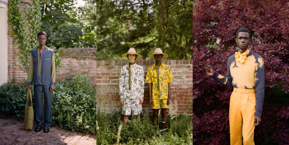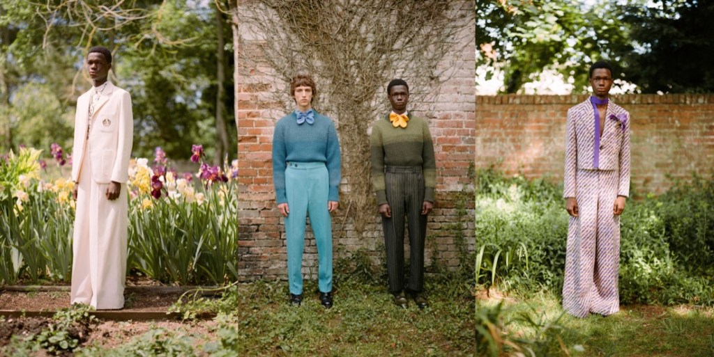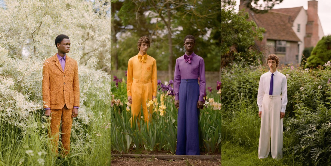 This is Erdem Moralioglu‘s second menswear season, and his vision of the Erdem man becomes more refined and clear. Handsome, young men standing in an English country garden, against beds of succulent purple and yellow flag irises. With his cinematic eye for glancingly historical biographical references, Moralioglu almost conjured a reincarnation of an everyday scene from the country life of the painter and plantsman Cedric Morris. It was shot at Benton End in rural Suffolk, Morris’s home from 1939, where he created a microcosm of an artistic avant-garde bohemian life with his lover Arthur Lett-Haines, as well as founding an art school. Lucian Freud was an early pupil. Cedric Morris, it turns out, was a friend and supplier of the society florist Constance Spry, who designed the Queen’s Coronation and who had her highly successful shop a few doors down from where the Erdem flagship is now. Connie Spry and her aristocratic clientele are all over his collection. There’s nothing like a romantic coincidence to get Moralioglu going. This one was a pure gift in terms of the colors he loves, inspiration for his boyishly foppish sense of style all the way through to the floppy, blowsy bow ties which seem almost like blooming corsages picked from Morris’s iris beds. The idea for digging into this aristocratic alternative history had actually hit him a little while ago at a Cedric Morris exhibition at the Garden Museum. Even without knowing a thing about this artist, though, you can sense the spirit of the 1940s that Erdem picked up in photos and paintings: Englishmen in hand-knitted sweaters, tweeds, shorts, and silk dressing gowns.
