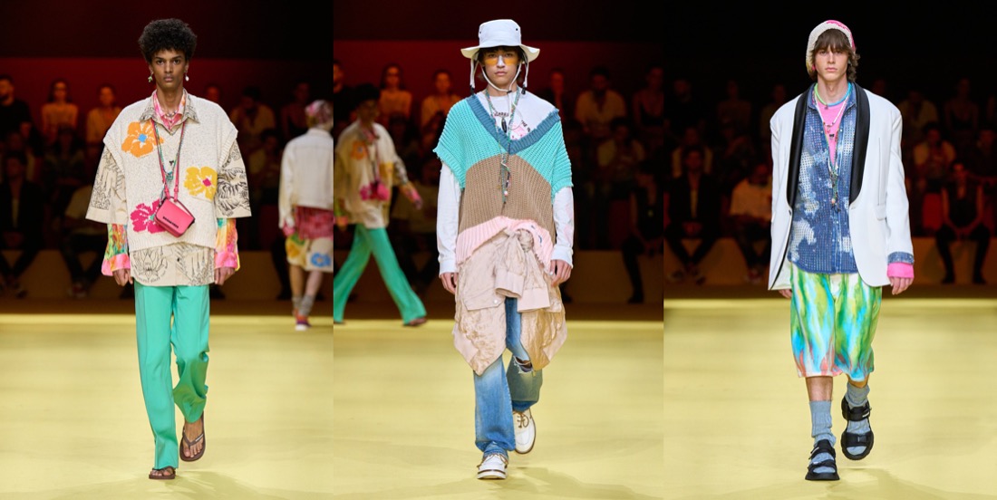 For spring-summer 2023, DsQuared2 went surf-boy-mode. Dean and Dan Caten’s layering extravaganza inspired by surf culture and 1970s Jamaica is just what a stinking-hot summer wardrobe needs and wants. The Catens worked with the Bob Marley Foundation, which granted them permission to reproduce a portrait of the reggae genius on T-shirts, beach totes, and bags. “We liked the vibe of that time, and the freedom and rebellion he represented,” they said backstage. “Peace and love, and the joy of music.” From the Jamaican flag they extracted bursts of color punctuating the sporty pieces they excel at, while cool formal options were styled imaginatively in well orchestrated chaos, as in the collection’s hero ensemble: a sloped-shoulder evening tux or checked blazer worn with a low-slung tie-dye sarong, or over multicolor printed beach pants. Each passing season, the Catens’s layering reaches new heights – with Vanessa Reid’s masterful styling help. It’s a fun formula that they’re able to articulate with gusto, keeping it rather fresh and entertaining. Another collaboration, this one with Honda, energized biker jackets and various patched leather pieces with a ’70s flavor. They added a tougher spin to the mellow, quirky surfer look of slouchy striped knits, humongous bermudas in printed nylon, and patchworked flares with appliqué marijuana leaves.
