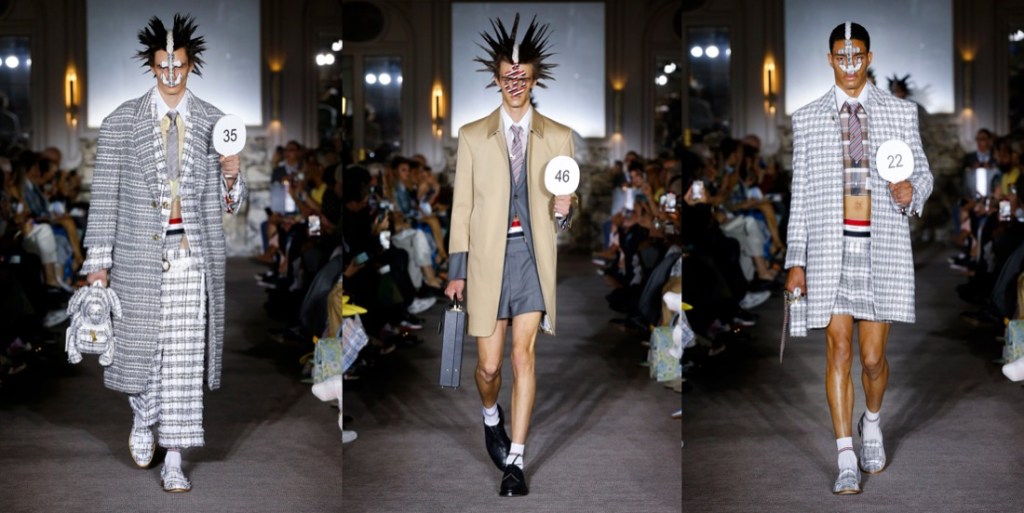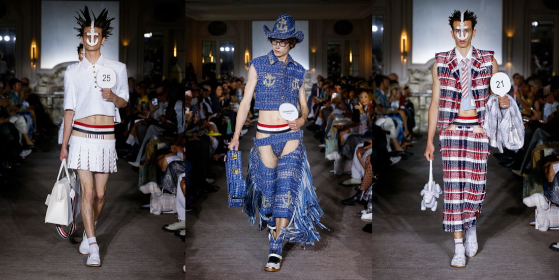 The Thom Browne men’s show started with a chic happening: guests cheered as the likes of Anh Duong, Marisa Berenson and Debra Shaw scrambled to find their seats dressed in the finest TB tweeds. This group of brand muses acted as couture clients in the maison’s mock-up salon, as 34 boys came carrying numbered paddles like the haute couture shows back in the day. Prim and proper suit jackets in delicate fabrics and pastel hues came anchored by barley-there mini skirts (Miu Miu has a serious competition) and jockstraps in red, white and blue. The boys adopted the uniforms of sailors and surfers, as well as tennis players and cowboys, by way of Browne’s signature shrunken and supersized proportions. For spring-summer 2023, the designer headed to the South of France to develop his tweeds, which came perforated with denim, seersucker tulle, leather, lace and multi-coloured ribbon. All of this worked well with the nautical theme seen through a queer lense. The New York-based designer has long been a byword for gender non-conformity, he shrinks and swells masculine and feminine dress, collaging the two to craft an out-there wardrobe that still feels sophisticated and grounded to the idea of strict uniform.