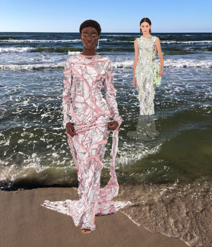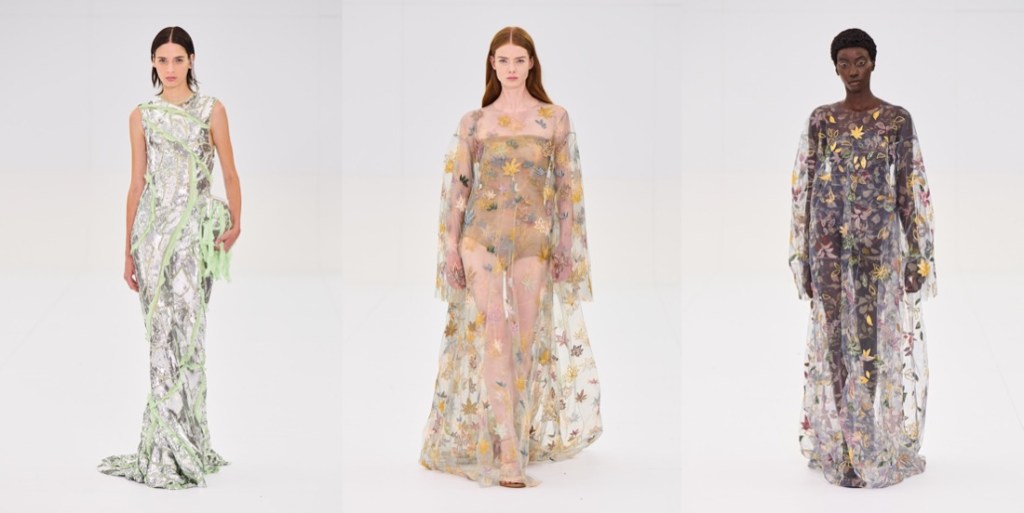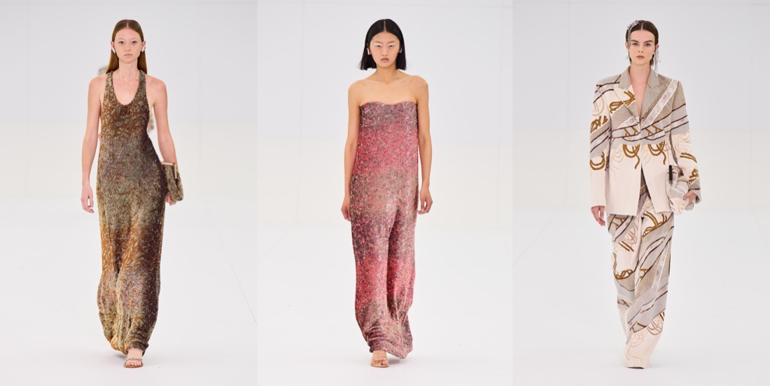 This haute couture season, it seemed that the collections’ backdrops were as important as the clothes. Immense theatralization of the fashion show was a recurring theme, from Schiaparelli to Margiela. So it was quite refreshing to see the total white-cube space as Fendi’s venue. But did Kim Jones‘ couture line-up stand up for itself? “Luxury is the ease of a t-shirt in a very expensive dress.” Karl Lagerfeld coined this permanently true aphorism – one of the sparkling fashion quotes he dashed off in a zillion interviews. Kim Jones didn’t drop it into backstage conversation about his Fendi haute couture collection, but he might’ve, since essentially what he sent out met the Lagerfeldian standard of t-shirt-y elegance; a show of uncomplicated, minimal dressing realized in the most expensive of materials. For starter, a trio of Max-Mara-like looks, two tailored trouser suits and a long turtleneck sweater dress with a slashed skirt and sash in a Vicuna brown. Then came tailoring, and a molded bustier in paler shades of slightly pink-tinged beige: Fendi’s specialty calf leather. And then, calmly on with the abbreviated lines of the t-shirt dressing. There were slim tank dresses, made of rolled metallic bugle-beads, asymmetrical long-sleeved patchworks of Japanese silk kimono fabric commissioned by Jones from traditional makers in Kyoto, and beaded deco-style pajamas. Jones explained in a preview that the pair of outstandingly lovely shimmery silver sequinned bias cut slip dresses had been made from swatches Karl Lagerfeld had commissioned which had been archived and never used. For the finale there were a few spicier, sheer “nude” dresses. In overall, it all looked like a proper couture collection. Not sure it felt like a Fendi one, though, even with all the subtle Lagerfeld references.