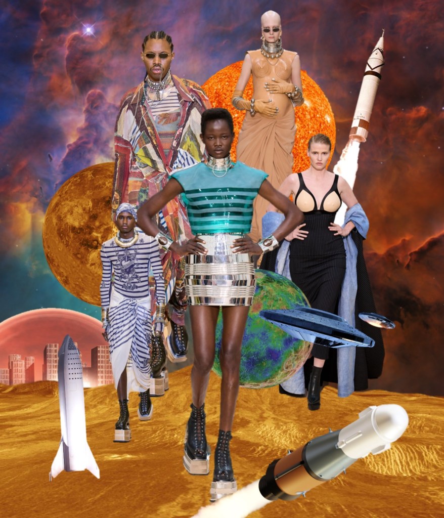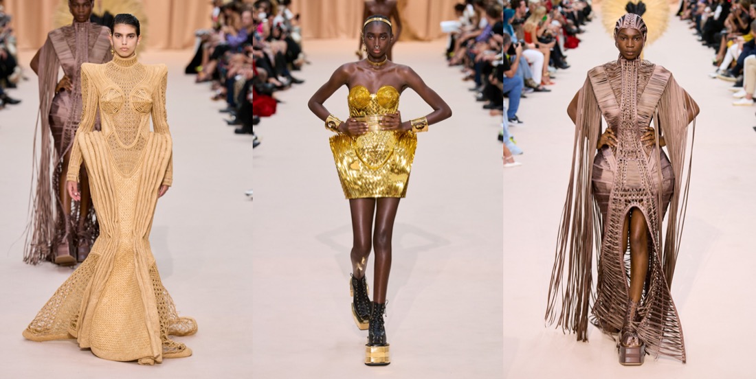 “This show is an open letter to Jean Paul, an open letter of love,” Olivier Rousteing announced in the Gaultier studio before the unveiling of the antic collection that Gaultier had invited him to design as the third iteration of the project that hands the reins of his couture house to a different designer each season. When the two designers first met to discuss the project four months ago, and right after Rousteing had presented his autumn-winter Balmain collection, he confided to Jean Paul Gaultier: “You’re my inspiration. And you broke so many boundaries for me as a kid.” Dressed backstage in a matelot striped top and an asymmetric kilt, Rousteing had clearly taken the brief very seriously. “Jean Paul wrote a fashion book with many chapters,” Rousteing explained. “And the reality is that you need to understand what chapter from Jean Paul is closer to you and the emotions that you obviously are more into.” For Rousteing, this meant a series of very personal snapshots. A memory of his father with Gaultier’s iconic Le Male fragrance in its tin can casing, for instance, or Madonna dressed by Gaultier in a nipple-freeing ensemble for a 1992 amfAR gala. “If you think about that today, we cannot [go there],” Rousteing noted, and in fact his iteration featured trompe l’oeil exposed breasts. “So he was ahead of his time about freedom of expression. Today, we talk about inclusivity, we talk about diversity, we talk about breaking boundaries, we talk about no binaries, no gender. Obviously, Jean Paul was the first one to do it.” Rousteing opened his show with menswear, inspired by the tattoo collection of 1994 that he considers a celebration of diversity, and then broke into one statement womenswear piece after another, playing on the Gaultier themes of corsetry, repurposed denim, and Breton fishermen’s sweaters, among others, many of the looks teetering on platform heels inspired by those tin cans.