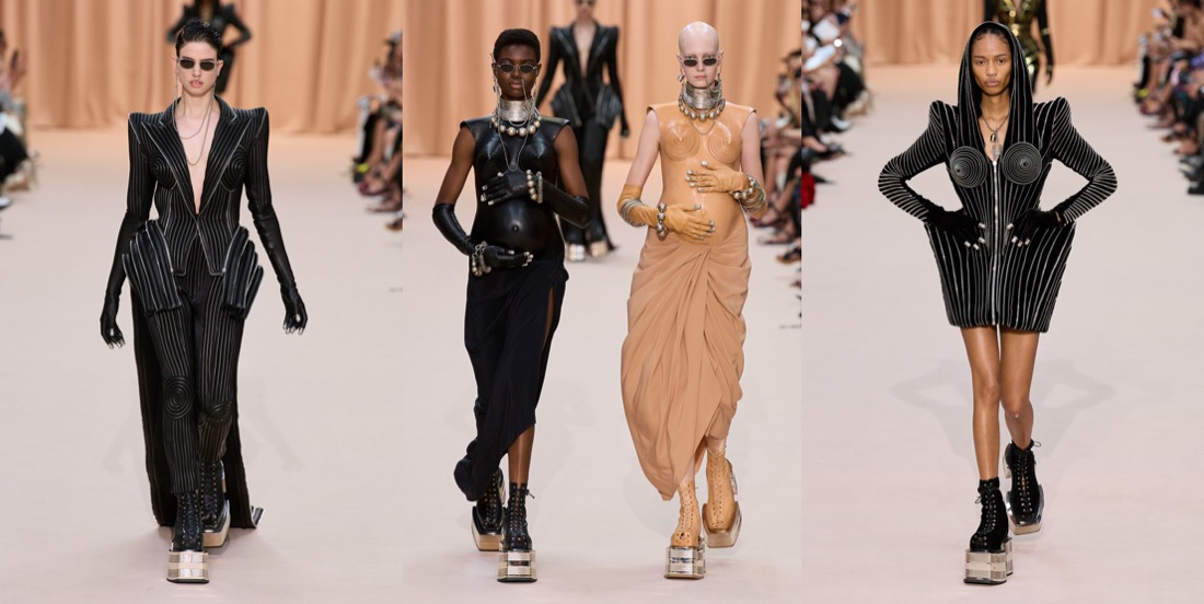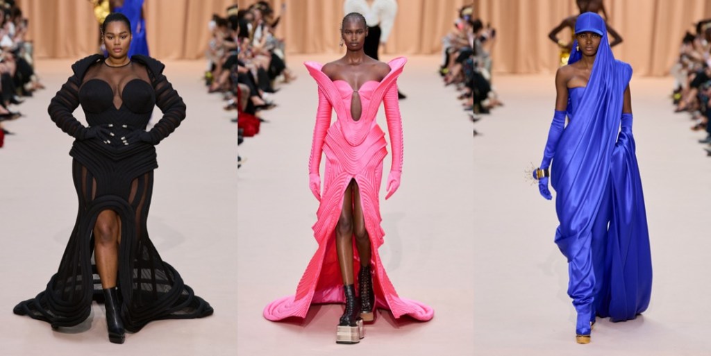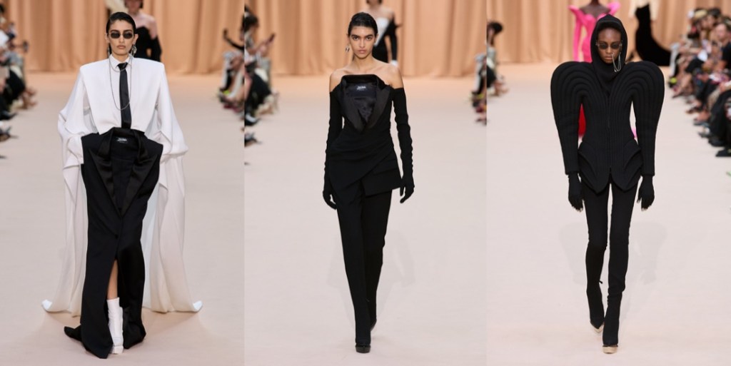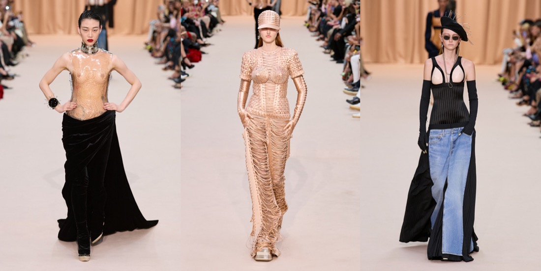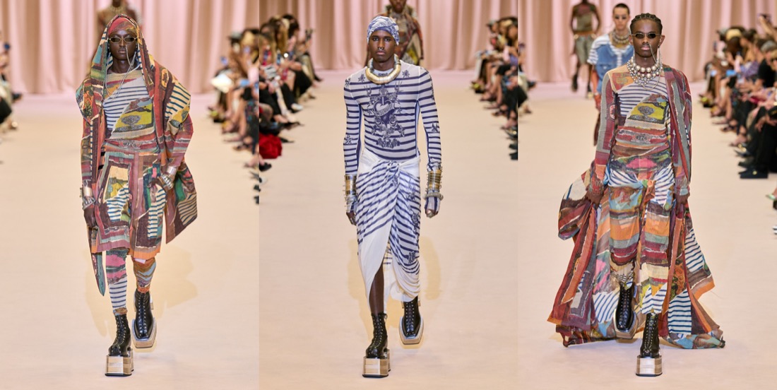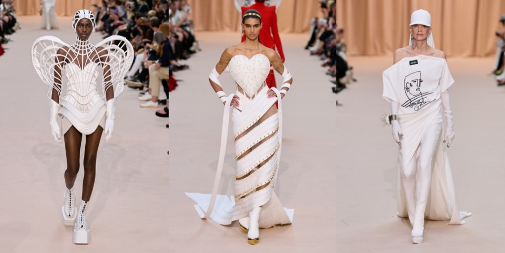 And Rousteing reveled in the craftsmanship of Gaultier’s ateliers. In homage, there were garments fashioned from a dressmaker’s tape measures, a heart-shaped pin cushion bodice, and gloves with thimbles for finger tips. And noting the designer’s passion for the liquid draperies of Madame Grès (and the dressmaking genius who worked for her and now for Gaultier), Rousteing worked her iconic techniques into some looks that included a sweeping corseted pink sweatshirt that ballooned into an opera coat in back and draped into a siren skirt in front. Meanwhile, what appeared to be a woven menswear pinstripe was actually an illusion created with insertions of white crepe – a process that took 600 hours. Rousteing revisited Gaultier’s feathery interpretation of matelot stripes, another iteration of the Breton sweater that morphed into a Watteau train in back. In a further celebration of the craftsmanship of the house, the running order of the show listed each premiere main and modeliste responsible for the various elements of each look next to its description. Rousteing stepped out of the studios, however, to create a brace of molded glass bodices made by the expert responsible for the stained glass windows of Notre Dame, no less. Gaultier himself had wanted the collection to be a complete surprise. When the show opened with a soundtrack mashup of Gaultier himself expressing his design ideas to various media outlets through the years, he blushed bright pink. By the end of the show he was beaming. “Zat was fantastic!” he declared, “He took my things and then did it his way – and the technique – fab, fab, fab!”