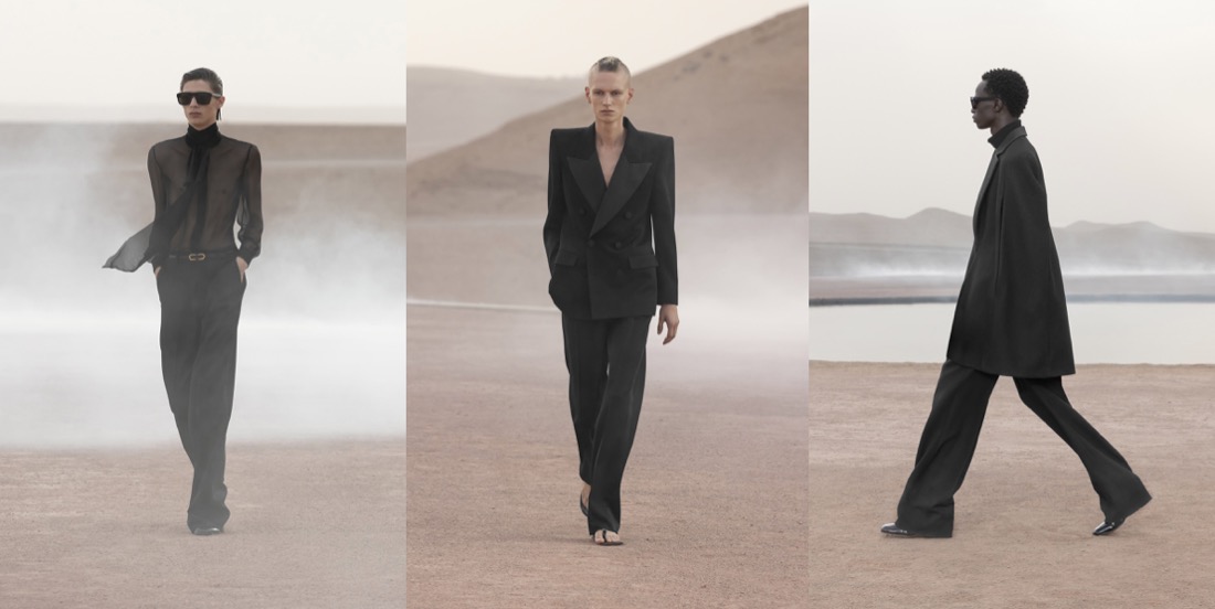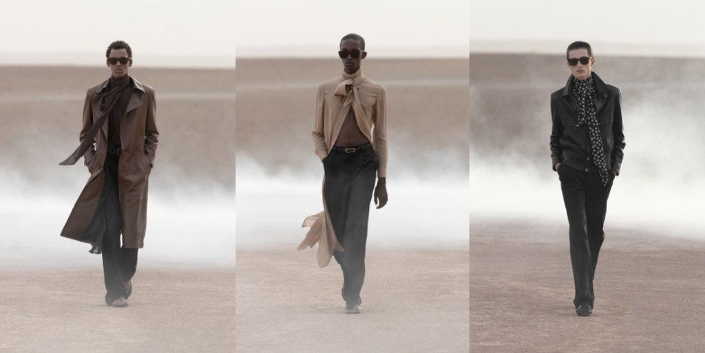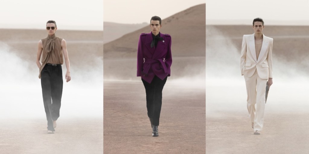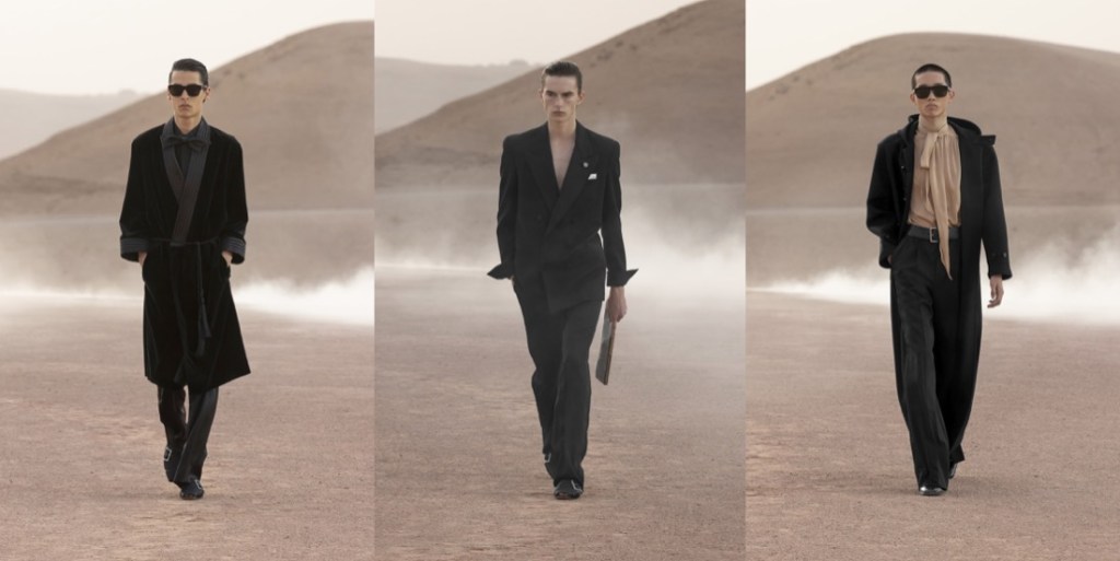 Trenchcoats came sharply shouldered but with a beguiling fluidity to their silhouette, cut with a barely perceptible flutter to them, in black wool or pliable glove-like leather. Lanky pants started high at the waist then fell into an easier, wider stride, some with a satin-y tux stripe running down the leg, or styled like jeans but cut from the most luscious of velvets, both often partnered with delicate gauzy tops that clung to the torso. The le smoking was a constant and compelling refrain here. Vaccarello had updated the classic tux, utilizing all the inherent fluidity of YSL’s beloved grain de poudre fabric, while others were cut from the slitheriest and slippiest of lounge lizard satins. He shaped his jackets with a judiciously judged jut to their shoulders, then might finish them off by having them clasp the body via their double-breasted or wrapover fastenings, drawing attention to a slenderized waist in the process. Sometimes though the newness came from something of the past. The flash of male décolleté – Vaccarello’s models sported almost to a man their jackets sans shirts – was something he’d picked up on from looking at how house icon Betty Catroux preferred to wear her tailoring back in the day. Again and again, look after look, it became clear that there was something about the pleasure of yielding to all of this, finding a place of comfort, of peace and of calm. It’s why, Vaccarello said, he’d chosen Marrakech. Not because he wanted to do a YSL in Morocco tribute collection, but because he understood that the city had been a place of solace and refuge for Monsieur Saint Laurent, in much the same way that Los Angeles has become a place of rest and recharge for himself.