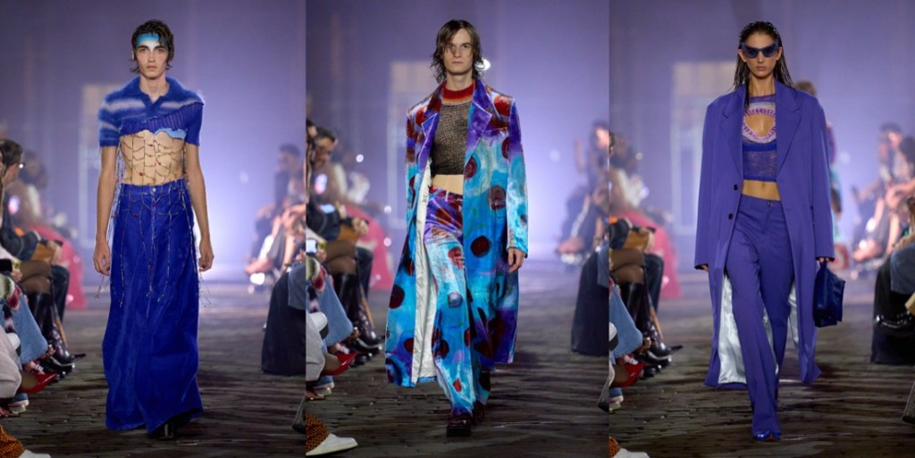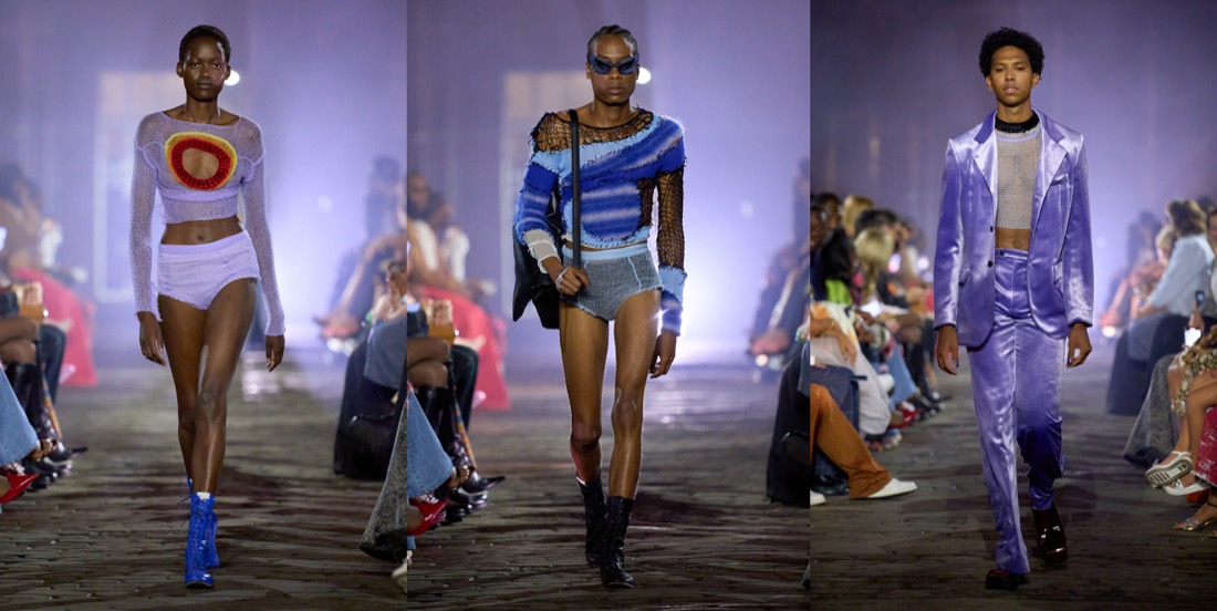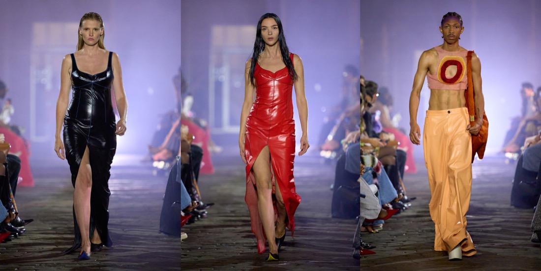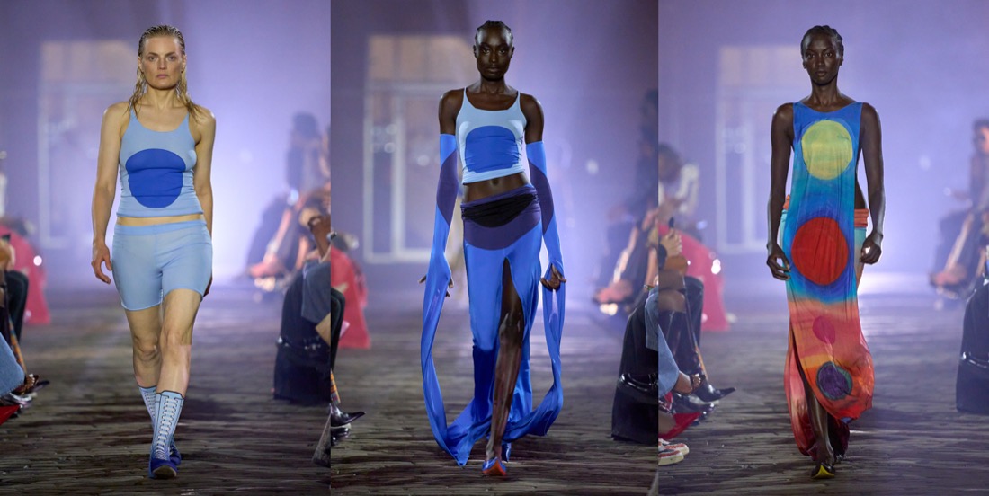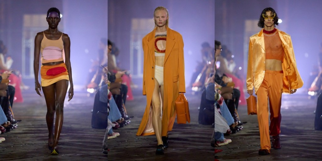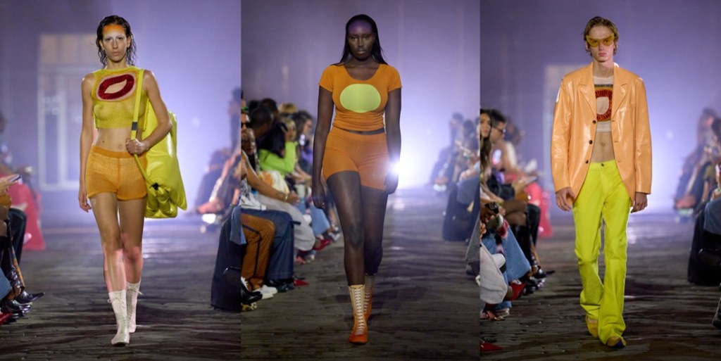Risso’s arrival stateside feels like it comes from a place of curiosity, of challenge, of risk: how can we get out of the moribund, straight-back-to-business way of doing things? The answer: maybe destabilize and decentralize it all, stop putting the designer on a pedestal, start to rethink all the relationships between brand, creator, audience, and those actually buying the stuff. Come together, join forces. “It’s not the ’90s anymore,” he said, “when brands spoke in very defined ways. Now you have to talk universally.” In regard to that last assertion, with his spring 2023 collection, Risso put his clothes where his mouth is. With a color palette inspired by the changing light over the course of a day in the Italian countryside (something he observed while holidaying in his homeland), he offered up a strong lineup that felt more streamlined and minimalistic than those he has done lately, despite the intense colorations and textures going on. Filmy rib knits contoured close to the body, some with “sleeves” trailing from the waistband or extra neckholes, which created circular décolleté cutouts, regardless of the gender wearing them. “The body is completely the protagonist in this collection,” Risso said. “Everything is built in jerseys, knitwear, things that, actually, go with the body rather than against it. Even the leather is the softest leather that exists.” The collection had other conceits based on the circle, be it the swooping looped trains on the dresses or the groovy abstract sunrises rendered on satin tees and minidresses. As for Risso, he is already thinking about where on earth the sun might rise on his next Marni collection. He’s in no rush to go back to Milan, not until the brand’s 30th anniversary in 2024 at least. Travel does more than just broaden the mind, in his view. “I can’t wait to be on the other side of the planet,” he said, “but, also, to see how it can burst the bubbles that we like to create in fashion.”