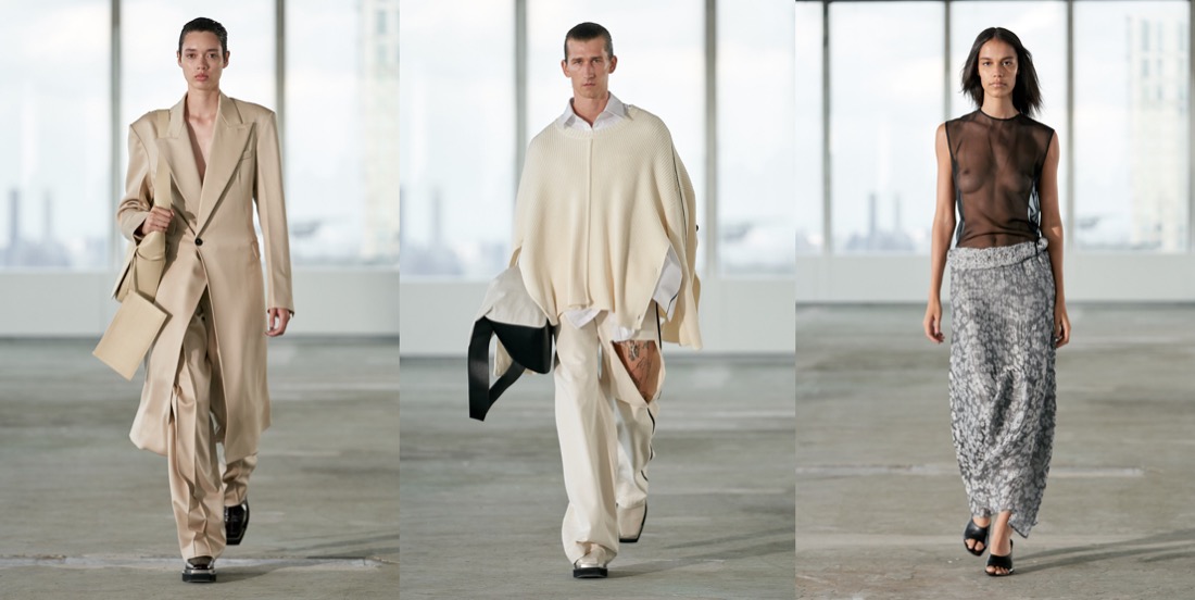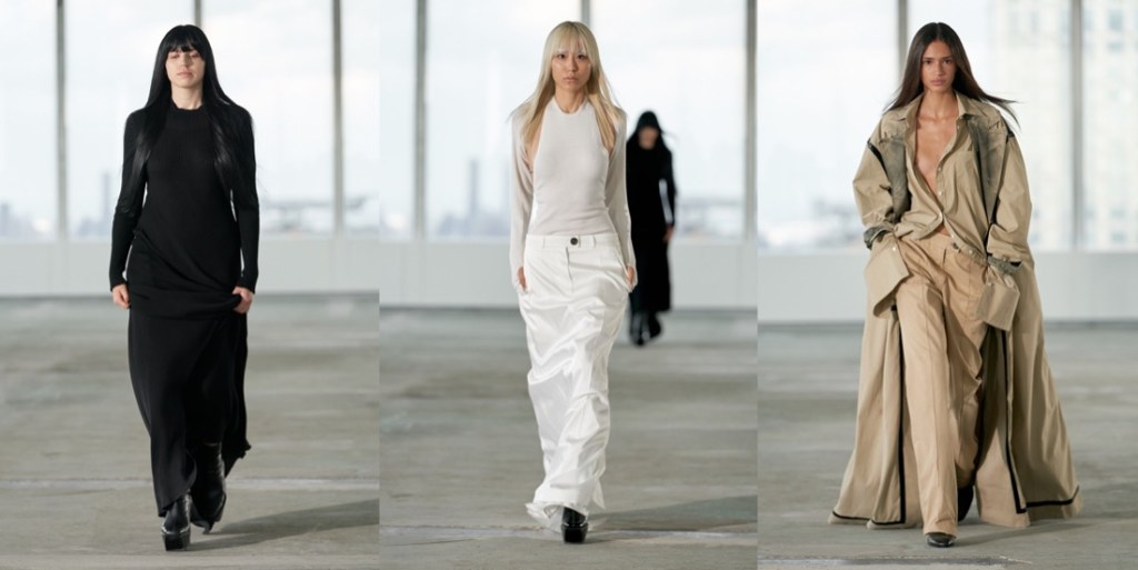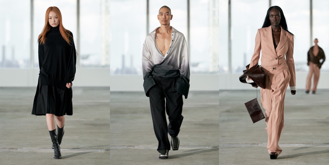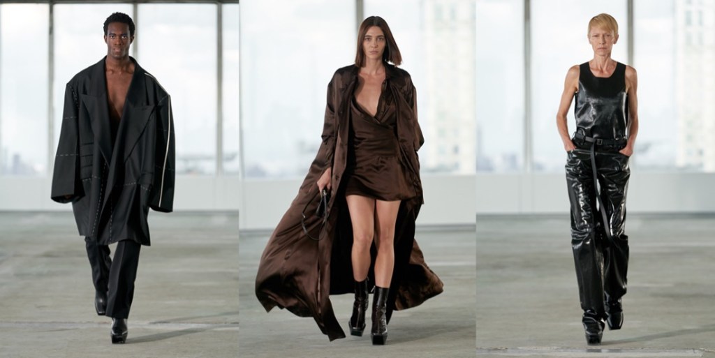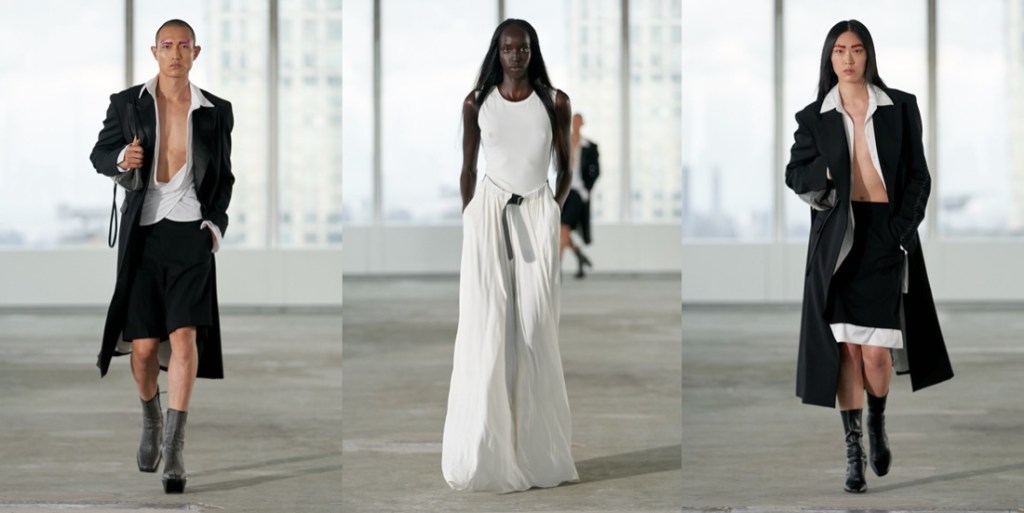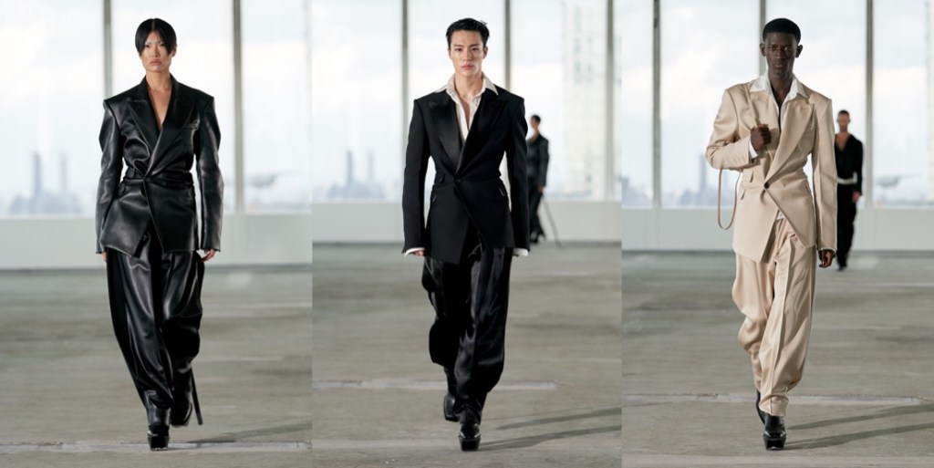 Peter Do has delivered one of the most convincing, coherent and desirable collections of this entire New York Fashion Week. If Helmut Lang, the designer, showed collections in 2022, then this might have been the effect – it’s this good. What gave Do this sort of new confidence is the official launch of menswear. The spring-summer 2023 show was opened with a men’s look: the double breasted jacket fastened with a single button over a white shirt, both with a large triangle cutout exposing a flash of muscled back, over a pair of full satin pants with open side seams that tapered at the ankle over those signature boots. The model was Lee Jeno of the K-Pop group NCT who has 3.4 million followers on Instagram. Celebrity influencers will play their part, but more important: Do’s exacting, even methodical approach is equal to his ambition. As with his women’s, tailoring is central to Do’s aesthetic. In fact, the offering is more or less unisex, in addition to being quite sexy. “During the fitting process we try everything on both, 80% is pretty genderless,” he explained. For him, for her, for them: over the course of 60 looks – this was one of New York’s bigger shows – Do set out his vision. It involves deconstruction in the form of suits slit open at the hem to reveal their inner workings, minimal leaning ornamentation like tone-on-tone suture stitches over seams, and the two- or three-in-one versatility that he’s built into his work from the start. Waistbands can be adjusted to accommodate different sized hips and clever pleated skirts are attached to belts so they can be open and closed, almost like curtains. Shirts can play it straight, meaning buttoned from collar to hem, or they can be worn wrapped around the waist for the undone look he favored here. Another novelty, this one on the sustainable tip: a tank and pants in what looked like patent leather were made from discarded shrimp shells, a food industry waste product.