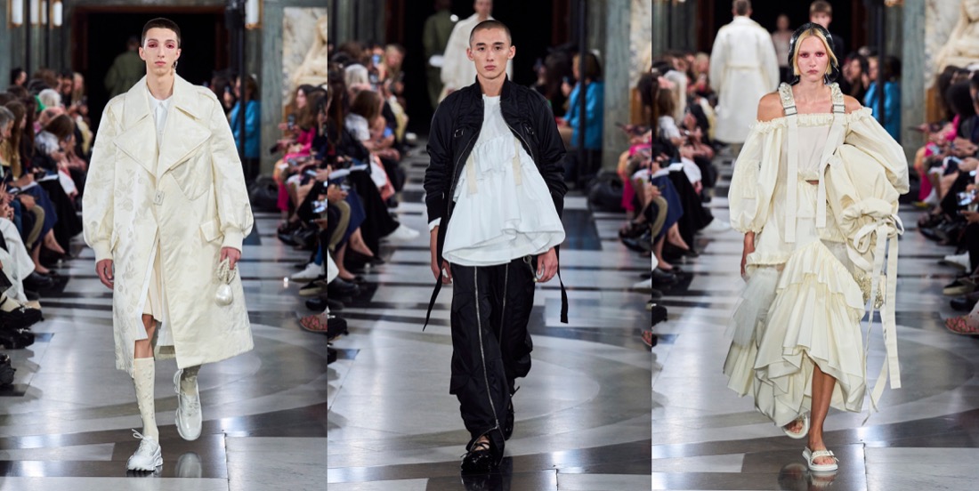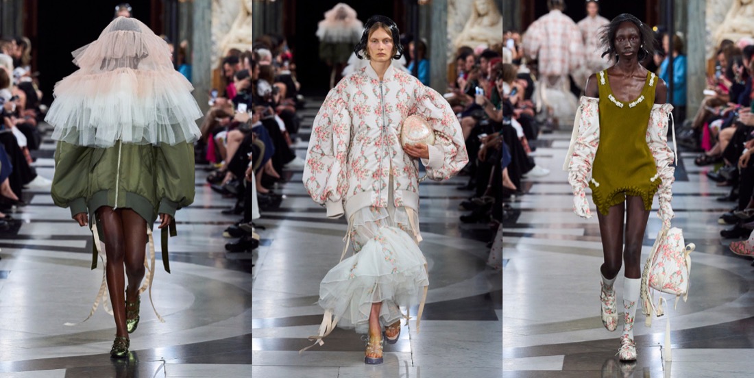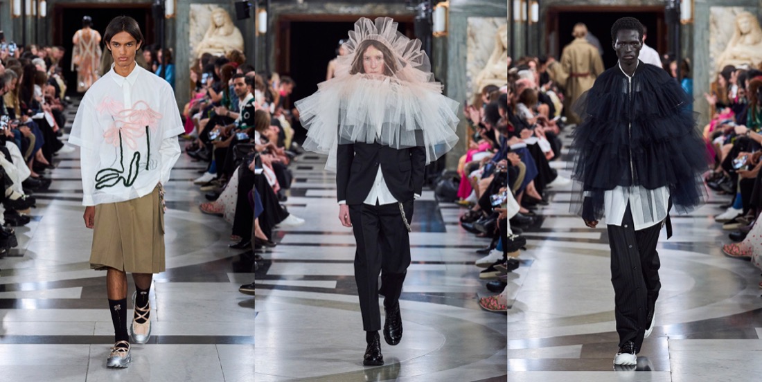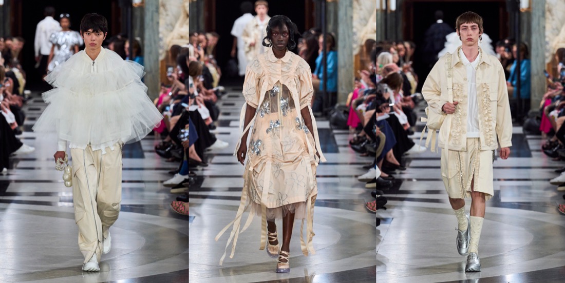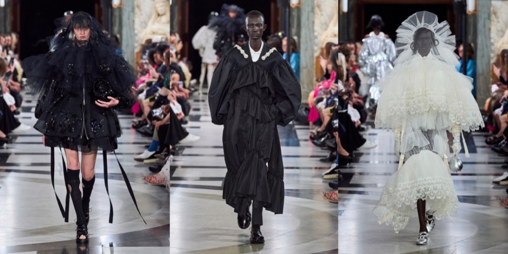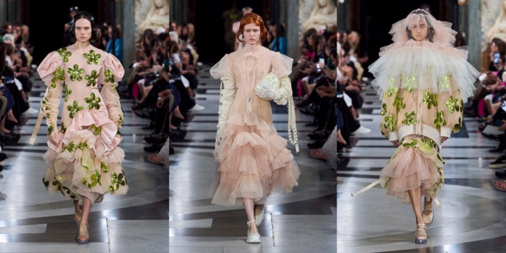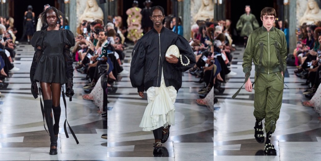 Simone Rocha‘s collections are never just “pretty” or just “feminine“. There’s always an underlying, slightly dark, raw energy behind them. “This collection was very much a reaction to the last few years. It was very much harnessing an emotion that felt like this kind of powerful, feminine statement.” Her harnessing literally went into the parachute tapes threaded through dresses and big, bubble-bomber jackets. She demonstrated how the tapes can function to change the shapes of garments – making something long or short, or giving it a different volume, according to mood. There were lots and lots of airy, pale white-beige-pink layers of tulle, what looked like a pink wallpaper print of flower-wreaths contrasted with a punkier strand of army green, tough aviator pants, and deconstructed corsets. And then, there were veils. Rocha has used veils powerfully before, more in contexts that have hinted at weddings and christenings – echoes of her upbringing in Catholic Ireland. Now, they were flounced, tiered constructs covering the heads and shoulders of women and men. There was a strange coincidence of fate in that. Considering what to do as she was absorbing news of the death of the Queen, Rocha was afraid that the audience might take the reference as a last-minute reaction; but in fact they were part of her own creative origin story; part of her instinct for going back to reconnect herself with the forces she’d been channeling as a student – a rebel girl beginning to grapple with her attraction to history. “There’s definitely pieces within the collection that I think people will feel potentially a response to the current situation. Because my original inspiration, back at Central Saint Martins, was this old tradition of the people of the Aran Isles, where women would dye their petticoats red and wear them on their heads in a funeral procession. I almost took them out at one point. It was touch and go. Then I thought no; because to me they represent this idea of ceremony, but also the vulnerability of it.” She’d also recalled them because she was starting with menswear (yes, finally!) – throwing the veil over the head of a boy was an early gesture in her process. “I wanted to work into this beautiful masculinity, and really think about the juxtaposition to everything I’ve done within the last decade with women, and see how that world plays out in the crossover between the two.” The dynamic had men wearing fragments of petticoats, styled with utility pieces and black tailoring. As Rocha found, creative ideas can’t be contained; she let a sense of the toughness flow over into her womenswear. With great, and emotional, effect. That’s what brought the audience to its feet. “I think clothes are sometimes an escape and a release,” Rocha reflected. “ And then I think I think they’re the reality. What can they be in that reality? For me, it was about making something protective, and healing, and an urgent sense of wanting to go forward.”
