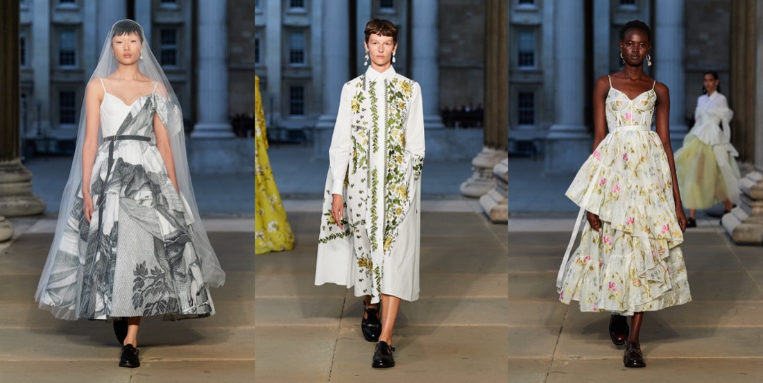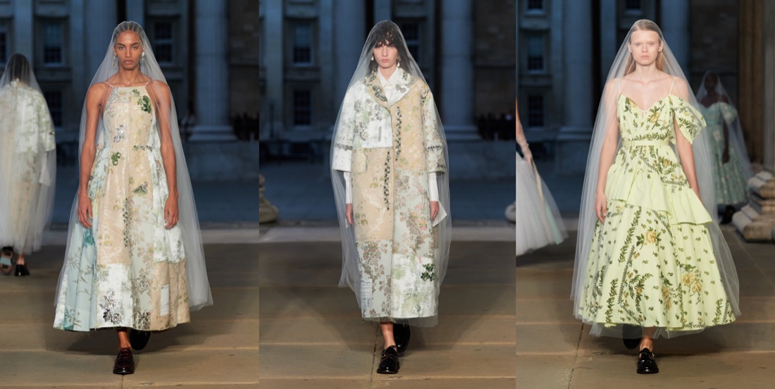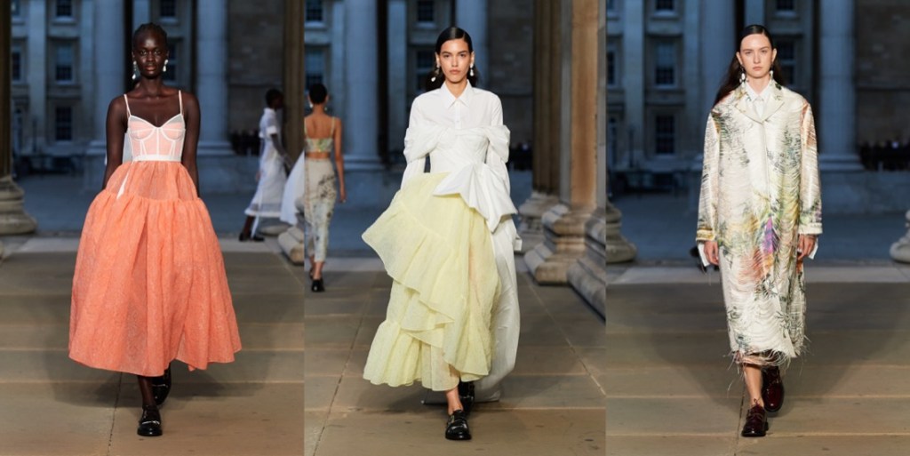 Erdem‘s spring-summer 2023 collection captured an important moment in time. The last moments of the show – three models walking, their faces and full-skirted ball gowns fully veiled in black tulle – felt like a page being inscribed in the annals of British fashion history. This was a show on the eve of the state funeral of a monarch who had reigned for 70 years. This finale, slowly walked through the grand colonnades of the British Museum, did indeed feel like a dignified, loving farewell to Queen Elizabeth, from a fashion designer who has researched and referenced her long before now. Looking at history and being a museum, gallery, and library geek is totally Erdem Moralioglu’s modus operandi. His first show was in the V&A. He’s had a long relationship with the National Portrait Gallery. He spends days in the London Library. And actually, this collection—as he explained afterwards – had to do with his fascination for the behind-scenes work of museum conservators. “It’s so funny, because I started the collection research here at the British Museum actually, and taking the design team to look at how they were restoring 17th century etchings; or how they might deal with restoring a tapestry or a Dutch Master.” At the V&A, he was inspired by seeing the crinolined structures the conservators built to slowly, painstakingly put the decaying fragments of an 18th century gown back together – and by the dust-sheets they use. And by happenstance, those dust-sheets were already translating themselves into the veils he wanted to show. “It was this idea of, if you study an object or dress so closely, over such a long time, do you start to become that thing?” A romantic, vaguely crazed projection of ideas onto imagined characters: this is Erdem all over. It produced all the kinds of sweeping shapes, prints, and embellishments his customers love: a grand sweeping trench-ballgown with a train, the appearance of fraying hems, a touch of antique-contemporary undone-ness. There is a lot to think about in Britain about the passing of an era. But then again, as his work – and the existence of all the British museums proves – the momentous significance of the past is never gone.