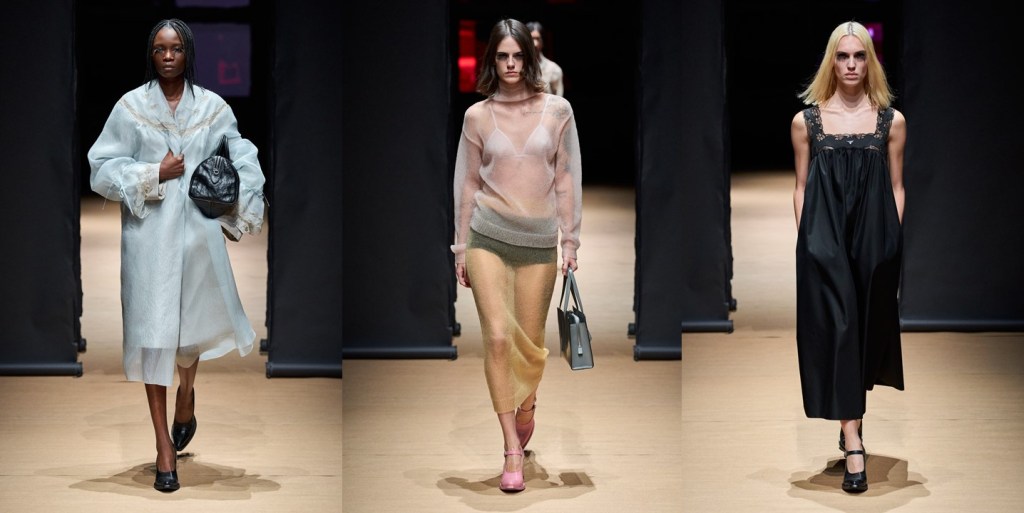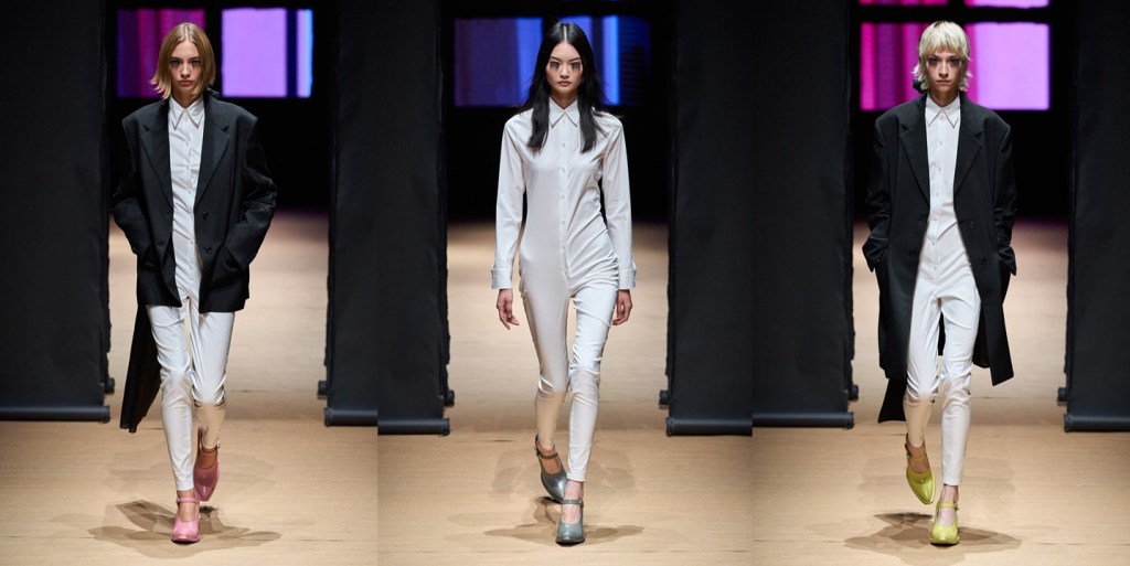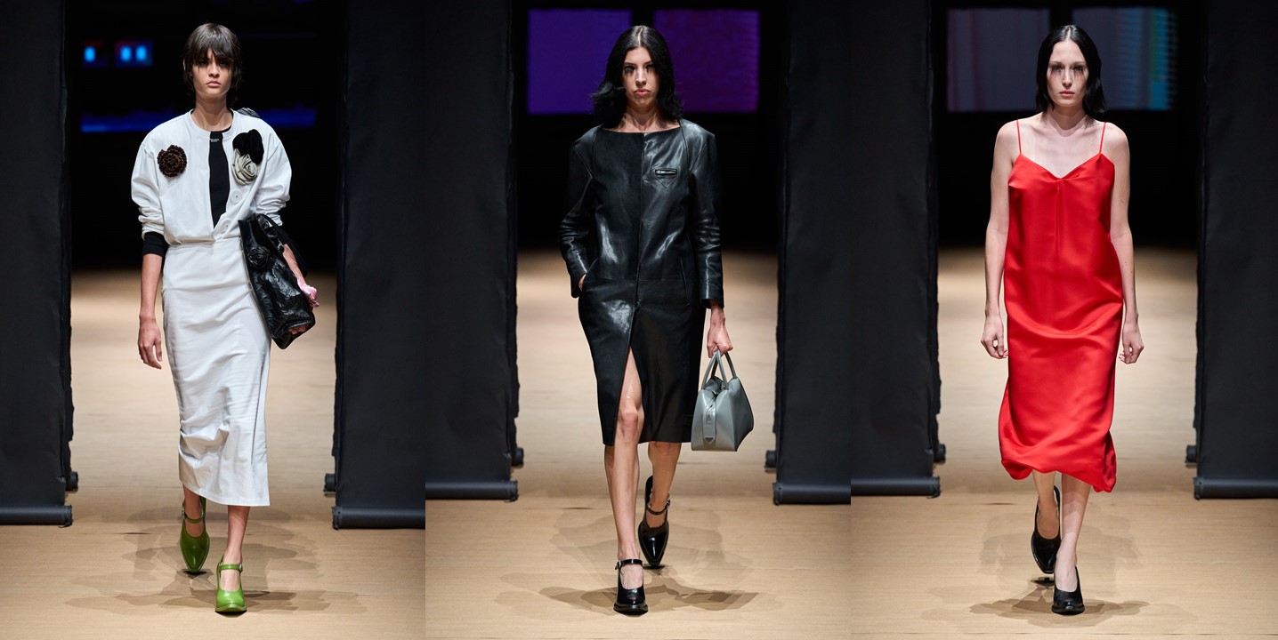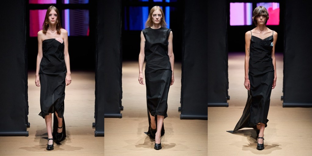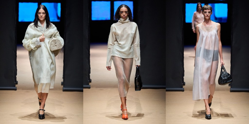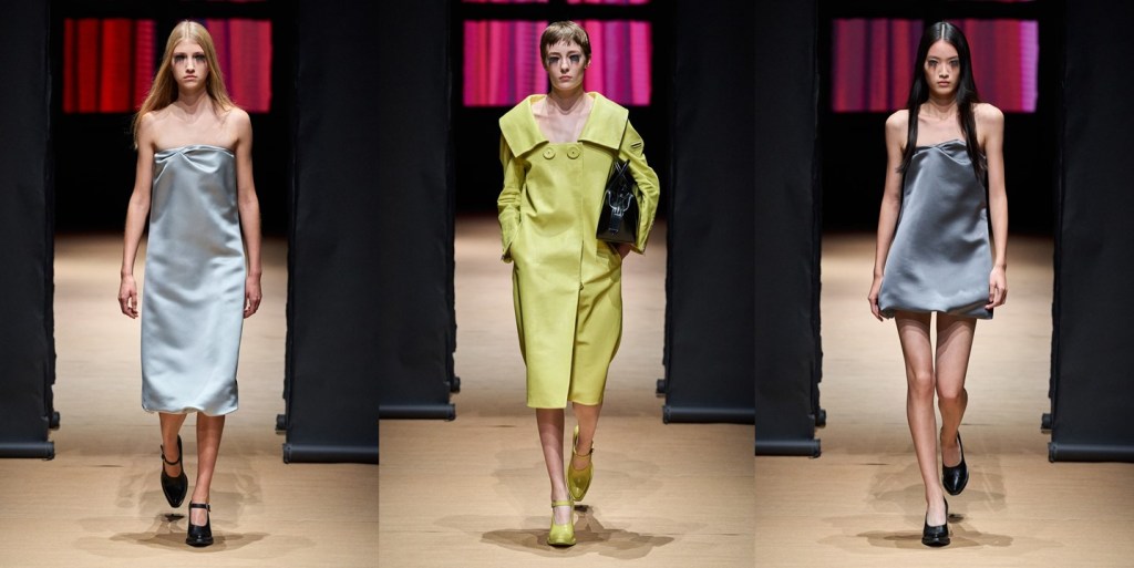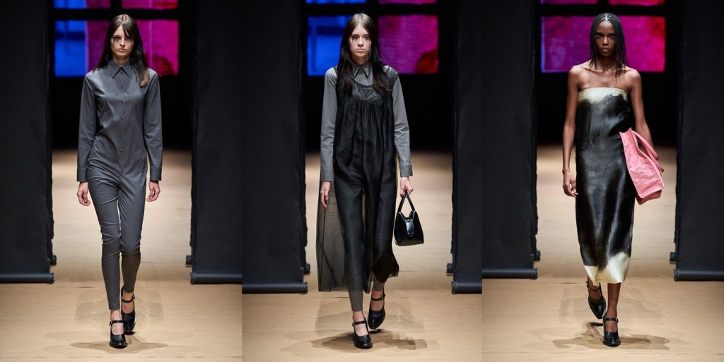 Finally, after two and half (fashion) weeks, a truly brilliant collection. Of course, it had to be Prada. Spring-summer 2023 might be the most sensual offerings to date coming from the creative dialogue between Miuccia Prada and Raf Simons. At a first glance, one might find it very simple, even straightforward. But the more you dig into the details, into its raw, yet cinematic effect, and the oddness of silhouettes and lenghts and material clashes, you realise that another word describes it better: “crude”. For the show, the Prada Fondazione was covered in black craft paper. Cut into the set walls were windows behind which short videos by the director Nicolas Winding Refn fame played: clips of a coat on a wooden dining chair, an empty kitchen, women in repose on couches. Were these scenes of domestic bliss? Knowing our protagonists, and understanding the two years we’ve all been through, that doesn’t seem likely. Instead, what Miuccia Prada and Raf Simons seemed to be after was some sort of truth – peering behind the curtain for a glimpse of reality or its close verisimilitude. “There is a sense of the life of women,” Miuccia Prada said in a statement. “Life and humanity crafts the clothes – not superficial embellishment, but traces of living, leaving marks. This idea of clothes shaped by humanity excites us.” The first look, in its corporate anonymity, seemed to belie that statement. Where’s the humanity in a dour gray top coat and lighter gray button-down onesie? But before long, the layers came undone. The boxy tailoring of that coat, for example, was replaced with an old-fashioned nightie, the familiar logo triangle embroidered on its tulle neckline. Picking up on the craft paper of the set, they used paper – “the most simple, modest material” – for dresses whose color and print didn’t quite meet the edges. These were the most thought-provoking pieces in the collection. The white outlines at necklines and hems gave the sleeveless shifts an unfinished, work-in-progress quality, like an artist made clothes out of a freshly painted canvas, rather than putting it in a frame. Clearly, Miuccia had her autumn-winter 2004 collection as the reference, where a similar technique was used for dresses and coats. Knit sweaters and skirts, meanwhile, came pre-creased in places, and the skirts’ slits were left raw-edged, with the slips underneath following the same almost ragged lines. The white nighties and peignoirs over black briefs and the icy silk duchesse dresses tapped into beloved parts of the house archives. Trained for decades to see Mrs. Prada as fashion’s fortune teller, a mostly silent arbiter with an outsized influence, we come to Prada shows eager to know how we’ll want to dress next season. On that topic, the house founder and her partner had a new idea, and it goes back to that skinny legged, stripped of all excesses all-in-one. Many designers are thinking wider and fuller for spring – the overwhelming vibe is go big or go home. But here the silhouette was tapered to the ankle and punctuated with a boxy coat or jacket and chunky cowboy boot mary janes. A new Prada uniform? In his own comments, Simons said, “more than any other collection, this one is filled with different views… different bodies of work, within a single body of work – shifting between disparate form languages.”