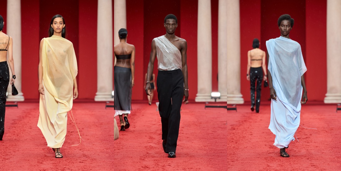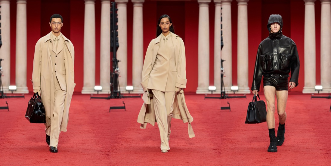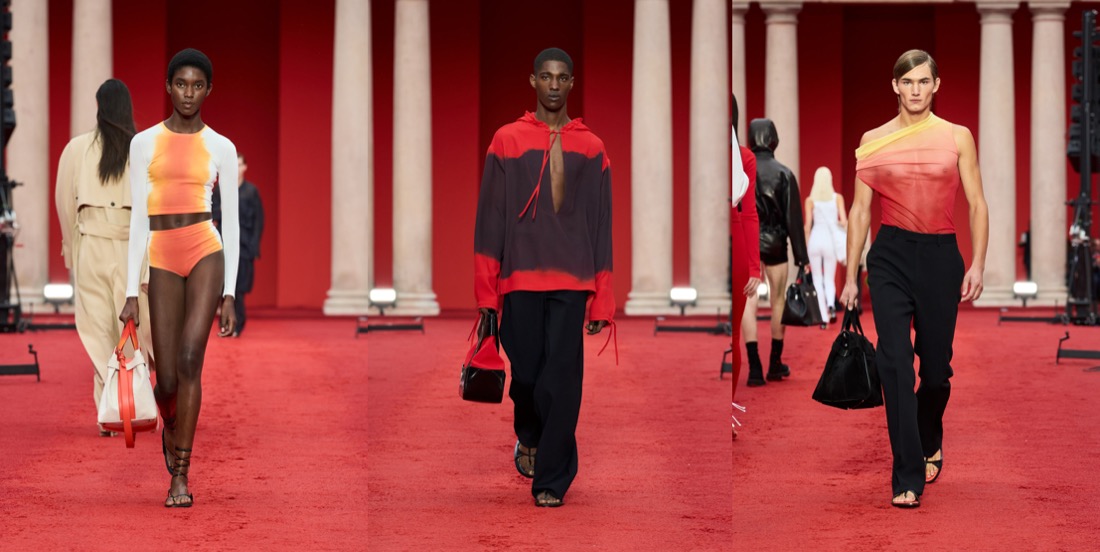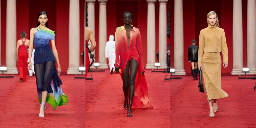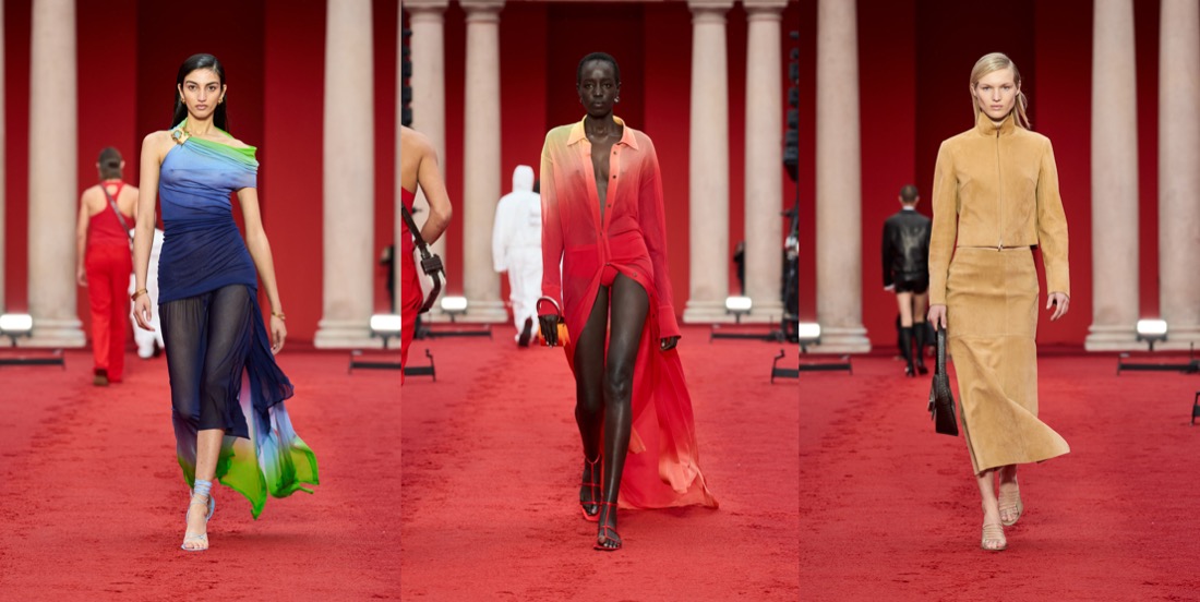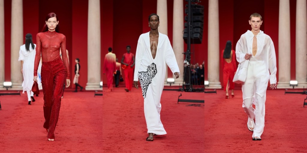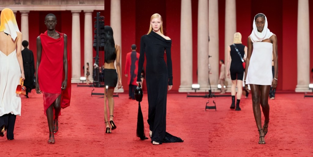 Maximilian Davis‘ energetic collection for Ferragamo was the best debut we’ve seen this Milan Fashion Week. It was the right balance of luxe and contemporary – something both old and new clients of the brand will appreciate. The 27-year-old, London-based designer seems to be just what this lately conservative, sleepy Italian house needed. The signifying grande geste of Davis’s new beginning included dropping the “Salvatore,” switching from a cursive font to something much more in line with contemporary design consensus, and laying claim to a new house color: a specific tone of arresting red. This was unmissable, dyed into the damp, rain-spattered sand that floored the courtyard and painted on the boards that backdropped the arcaded arches of this 17th-century Milanese seminary venue. The spot is currently being transformed into a hotel by the Ferragamo family’s Lungarno group. The red represented Davis’s own (now on hold) eponymous label, where it had echoed the flag of Trinidad and Tobago and his heritage. It also speaks to the heritage of Ferragamo, one of whose many famous archival shoes is a beaded red pump made for Marilyn Monroe by the founder in the 1950s. How about the clothes? Said Davis, “I’m developing new fabrications and introducing new silhouettes to the brand, and trying to understand what the younger client needs to make it a success.” There was a strong play for top-to-toe color in athletic-inspired bodysuits and technical field jackets and pants for men. One full look in red, a five-pocket pant and turtleneck, was beaded in homage to Monroe’s pumps. Inspired by the founder’s early incarnation as shoemaker to Hollywood, Davis riffed on sunset and sunrise via dégradé, bleeding-print fabrics that were themselves inspired by artist Rachel Harrison’s Sunset Series. Tailoring was presented in chunky, stolid shapes given twist and movement through the addition of sash details or the removal of sleeves. It was often realized in a delicately finished double-bonded crepe. There was a “playful and slightly perverse energy,” Davis suggested, in leather and suede short shorts. Accessory-wise, the house Gancini hardware was reflected in the heel of a handsome new strappy sandal and the bracelet-like hardware of a small clutch bag. It was also traced in the neckline of a regal charcoal evening dress. Davis spoke of “reenergizing” Ferragamo. The applause that greeted this first installment of his tenure suggested he’s on a good path.
