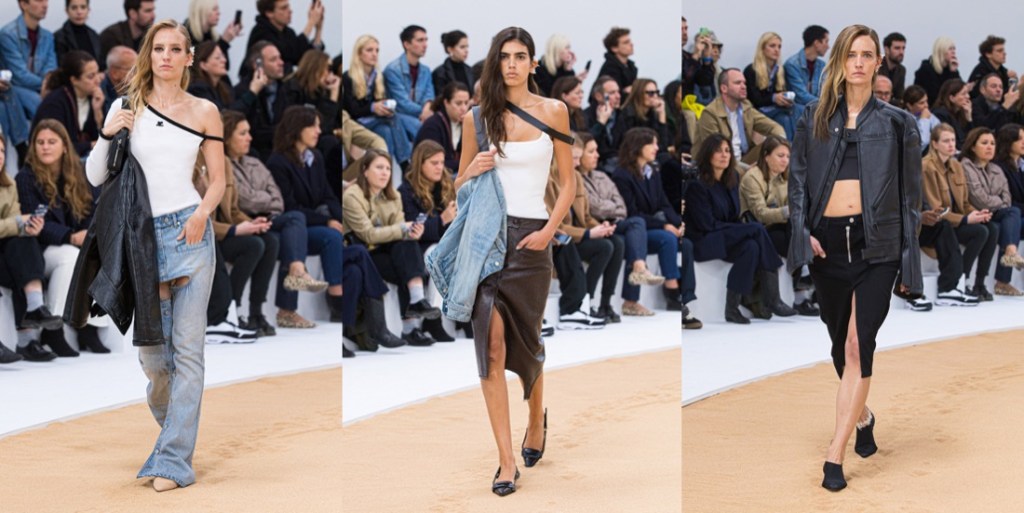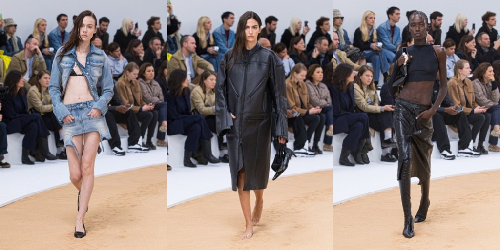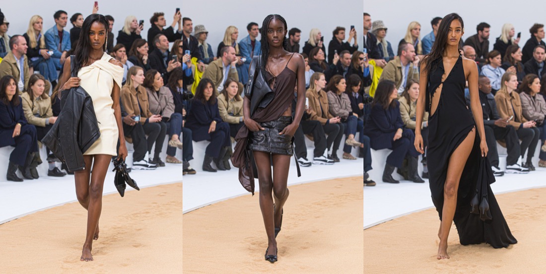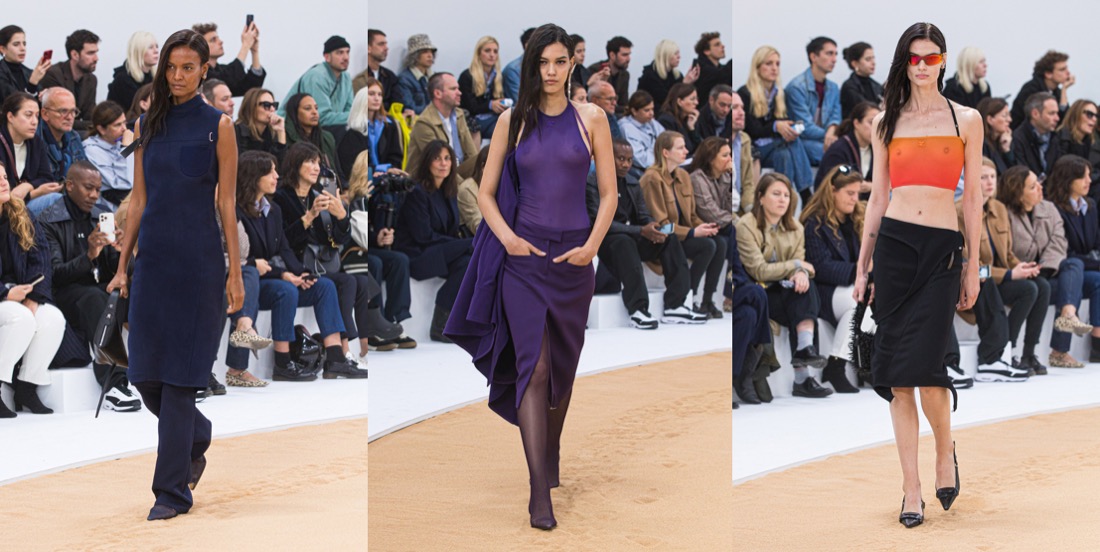 I was on fence with Nicolas di Felice‘s take on Courrèges since his debut collection. But his truly cool spring-summer 2023 offering proved that the designer is capable of making the brand truly his own – without falling down the rabbit hole of Courrèges’ archives. First of all, Di Felice knows how young people want to dress everyday, especially for parties: in body-con separates and dresses that reveal as much as they conceal. His spring show conjured morning-after-a-beach-rave vibes. The set helped tell the story. In an otherwise unremarkable white studio far out of town, a circle of sand had been installed. As the music cued up, more sand began streaming from the ceiling like an hourglass, slowly at first and then faster, so that the accumulating pile started sinking as the models made their slow circuits around it. Having made the house Re-Editions into big sellers, Di Felice is looking beyond the obvious at Courrèges. He dug a vintage scuba jacket out of the archive and used its ergonomic lines to inspire a leather motorcycle coat, for one example, and he’s broken free of the starchy mod shapes so closely linked with the house history. The sensation Di Felice was after for spring was fluidity, thus the surf and scuba motifs, a recurring theme this season, and a “coral” dress made out of silicone. And thus the silhouettes draped and wrapped around the body. Since it was the morning after, models carried their slingbacks in their hands, or wore their jean jackets around their waist like a makeshift shirt (buttons down the back and exterior straps made that possible). Other pieces came with similar built-in straps to make them easy to carry when they come off on the dance floor, on the commute, or at the desert rave.