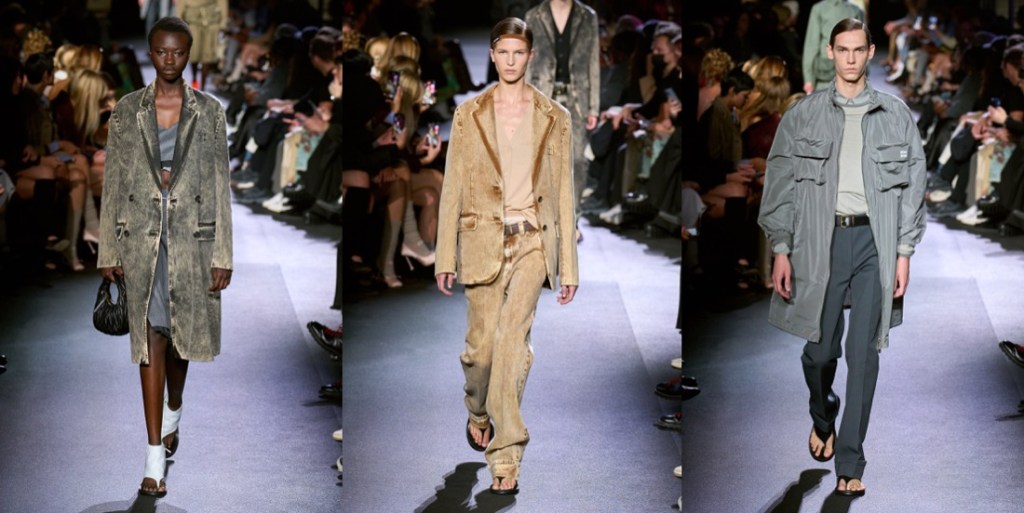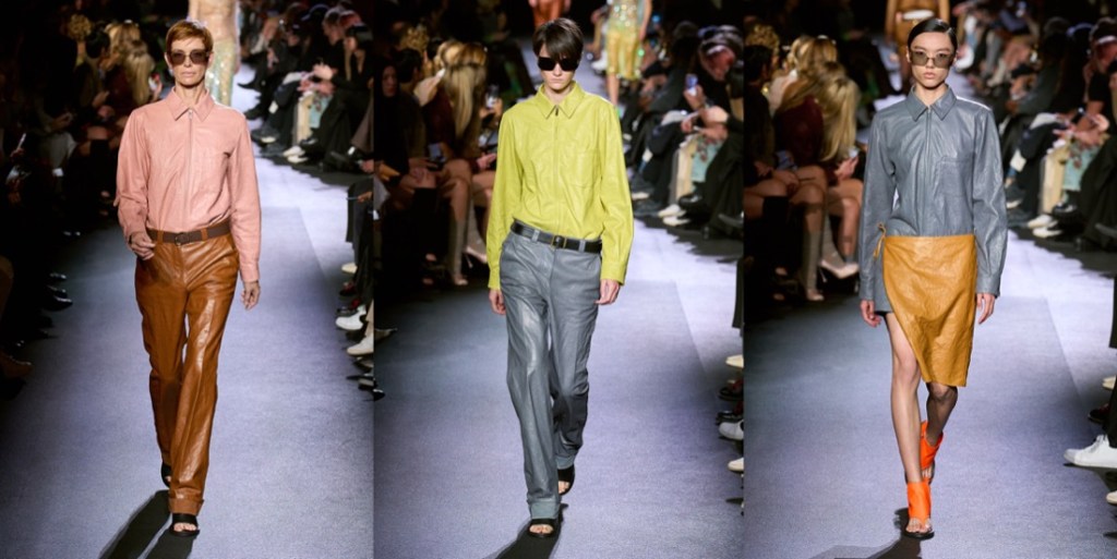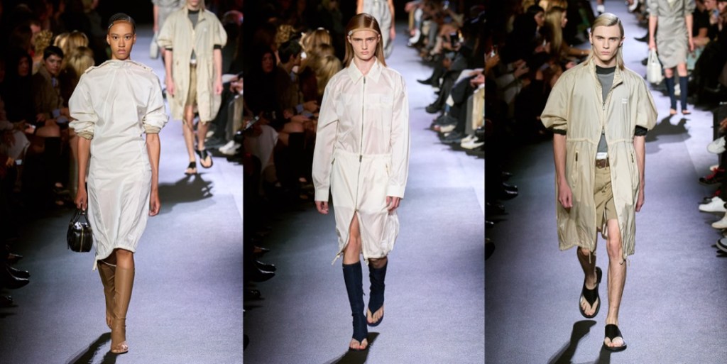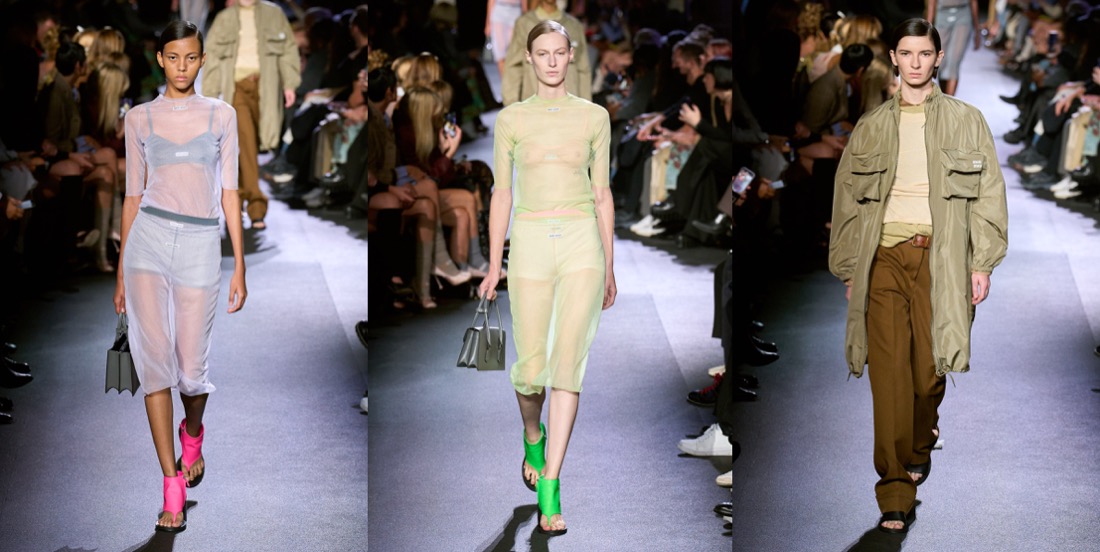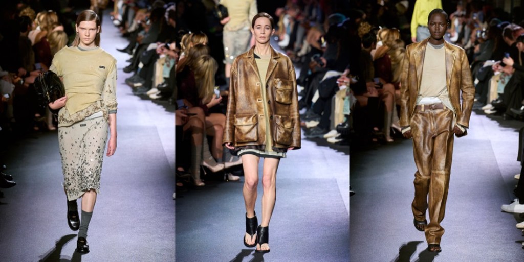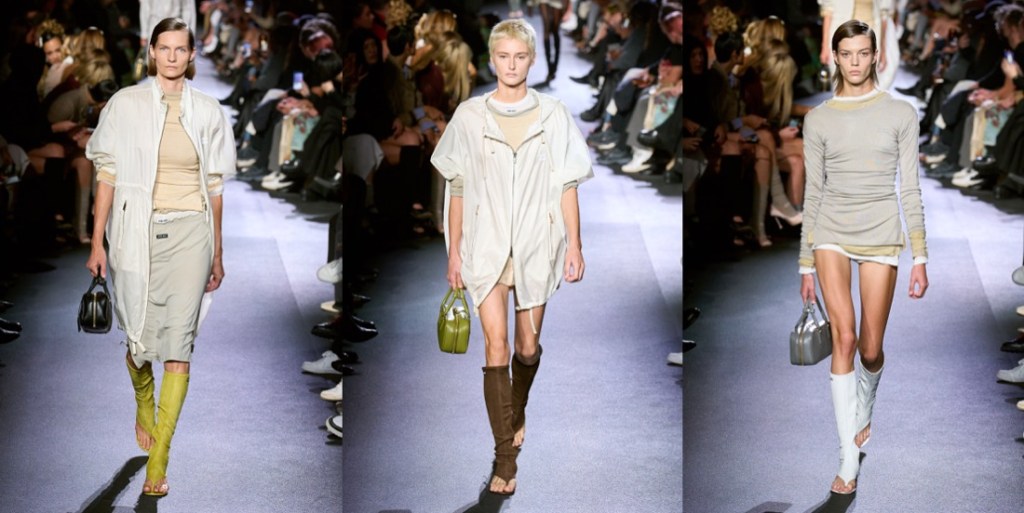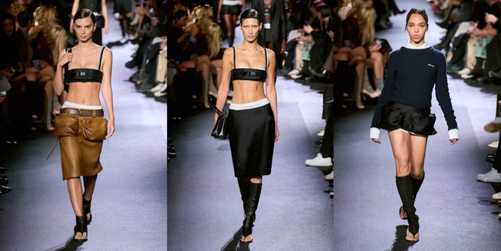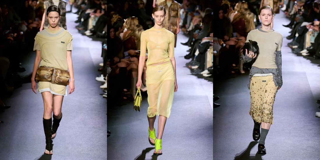 Miuccia Prada, with a Miu Miu show on the last day of Paris Fashion Week, proved that she knows where she’s going – comparing to other designers and brands, big and small, who in majority presented some of the mildest and direction-less collections in years. Even though Miu Miu orbits around a similar theme for the third season in a row, it’s refreshing to see Prada’s “sister” brand in such assertive and distinct mode. Those mini-skirts are still going strong, just like leathers in various shades of browns and beiges. Corporate tailoring continues to be aggressively cut-up and raw. But there are a couple of novelties that will definitely become the next Miu best-sellers (and are both easy styling tips as well as vintage shopping inspirations). A gray cap-sleeved T-shirt worn over a beige jumper worn over a gray long-sleeved T-shirt worn over a white T-shirt, they were all very ordinary garments, but certainly delivered a mood. And styled this way, they didn’t look so normal at all. “I’m very serious but also fun. I am both,” Miuccia said backstage of the show. That duality was reflected in this line-up. She showed some clothes so simple they weren’t clothes at all: primitively cut fabrics fixed to the body with fastenings, like an apron skirt tied at the hip or pieces of nylon fashioned into ponchos, dresses and skirts with drawstrings. Strands of nylon were tied around the lower hip of pleated skirts with drawstrings and worn like cummerbunds, and a bandeau top held together by a nylon strap with a plastic clip buckle seemed to have been repurposed from the performance wardrobe. Miu Miu is on a roll, delivering a kind of fashion that resonates with the sexy, subversive, product-focused tastes of the digital generations – even through a simplified lens. Prada framed her show in fittingly odd projections by Chinese artist Shuang Li, who had sharks bouncing off planets and walls, and a soundtrack featuring a spoken-word love poem by the same artist. If there was an upbeat mood in the room, it came from above. “I went through a really… friends died and so on,” Prada said. “Recently, I’m in a good mood, for personal happenings for my friends.”