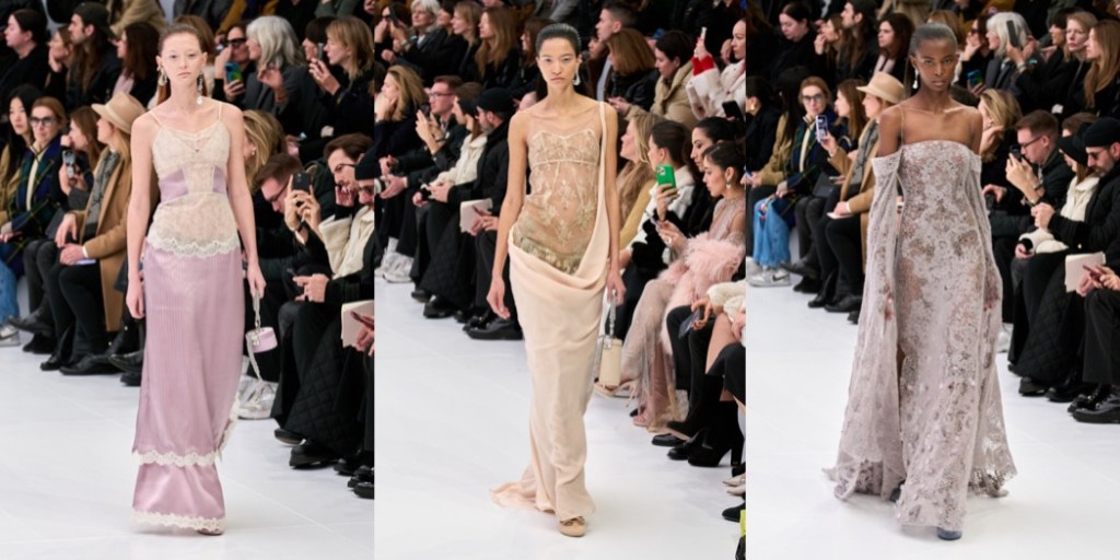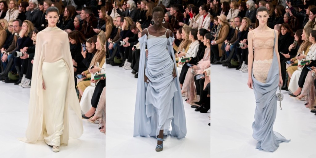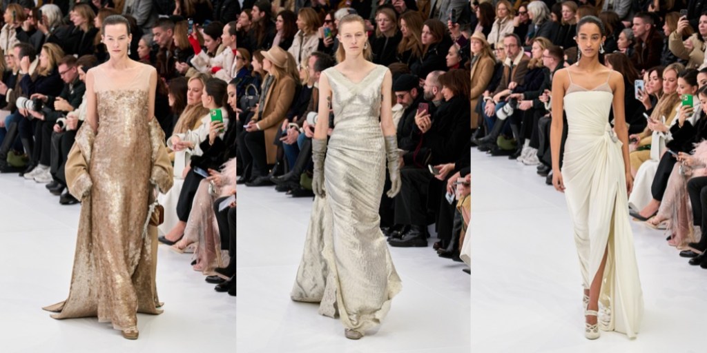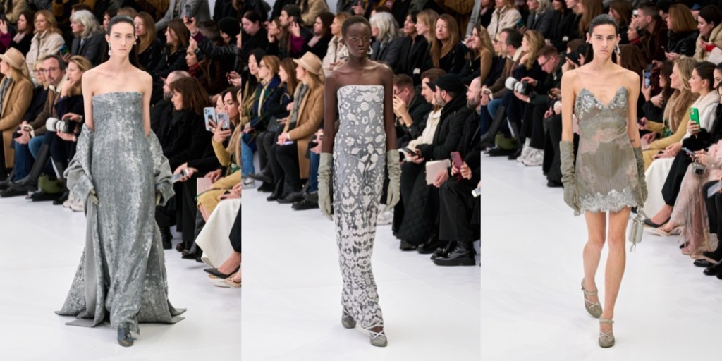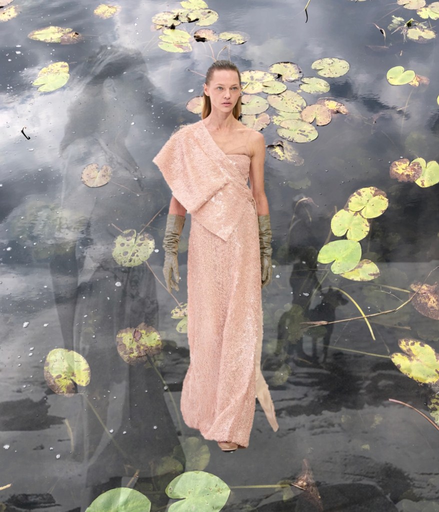 “I want to do lightness because for me, couture always seems quite staid and heavy,” Kim Jones said regarding his Fendi spring-summer 2023 couture offering. “I wanted a floatiness. Elegant but youthful.” Jones also added that this collection was “a continuation” of his autumn couture, and a response to Fendi clients’ requests for evening dresses. What he offered was a discreetly modernized redefinion of statuesque goddess-dressing: slim silhouettes, in pale evanescent colors, 1930s style. You could barely tell that some of the silvered dresses which had overlaid printed lace-patterns, a bit like tablecloths, were leather, decorated with scanned-in prints. Or the glinting “chain-mail” gloves. “I wanted to really work with the couture techniques,” Jones said. “What they can do now is so advanced.” The concept of the swoops and drapery lightly referenced an archival Karl Lagerfeld for Fendi silk dress that Jones had studied; a glancing echo of the classical staturary of Rome, of course. Jones layered it over delicate constructs of lace-edged silk bras and slips. It’s all very pretty. But while Jones’s work blooms and evolves at Dior Men, his Fendi’s womenswear feels too reserved and steeped in comfort zone.