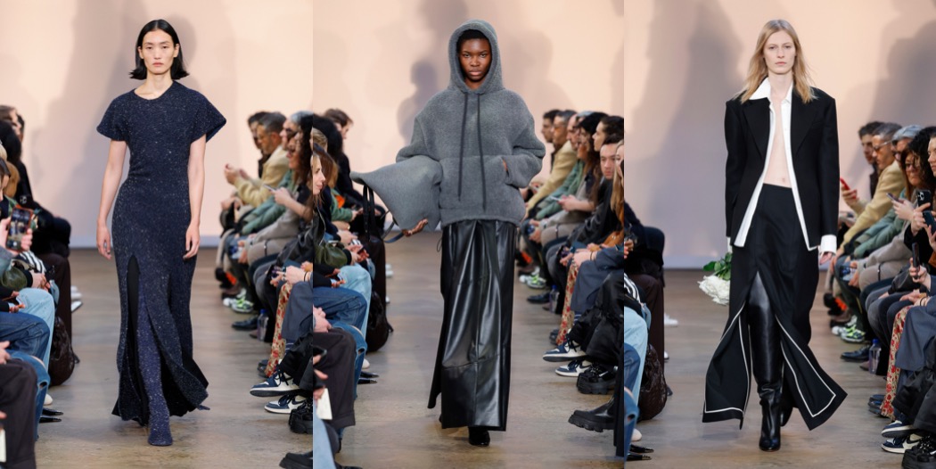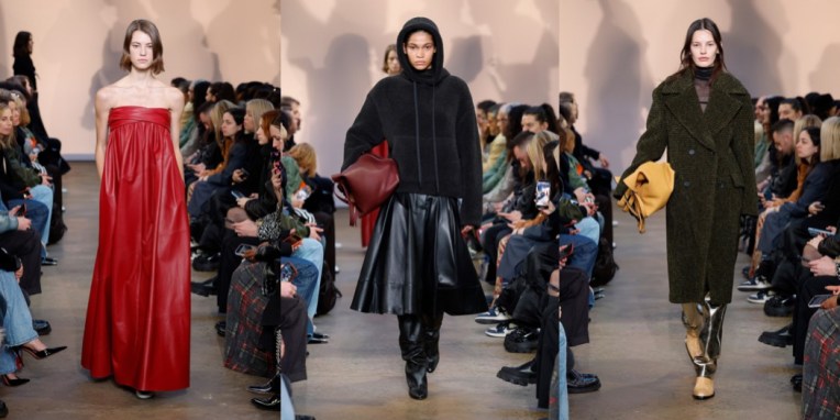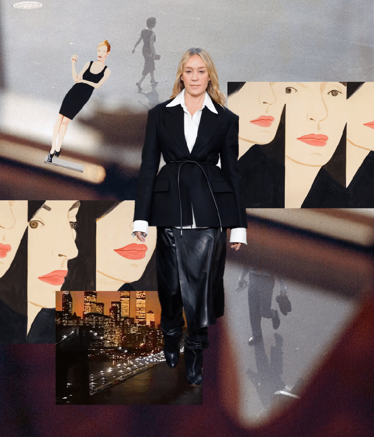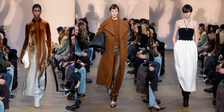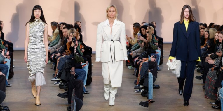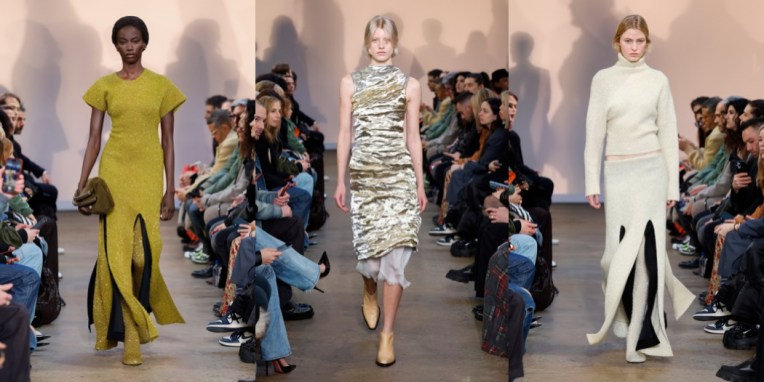 What a New York moment. Chloe Sevigny opened the autumn-winter 2023 Proenza Schouler show. She’s worn Jack McCollough and Lazaro Hernandez’s clothes since the beginning, even a couple of times to Met Gala; they were New York ingenues together 20 years ago. But this wasn’t an anniversary show, the designers insisted. They said they’ve been taking stock, thinking about the friends and customers they’ve made over two decades. “This is our most personal collection yet,” said McCollough. “It was less revolving around a theme, more looking at the actual women in our lives: What is it they want?” Like Sevigny and Olympia Scarry, who walked later a few looks later, the women in McCollough and Hernandez’s lives have grown up, and grown out of some of the Proenza Schoulerisms they’ve honed over the years. Prints were kept to a minimum here. The ones that did turn up were remnants from past collections, and only appeared as the linings of dresses, visible through a side-slit in the midi-length skirt, or on straps pulled off the shoulders and left to peplum at the waist. There was no room for ruffles or bows, either. The only real embellishment they used was white pom pom fringe on a black velvet dress, but it was mostly obscured by the charcoal wool skirt that their stylist Camilla Nickerson, another friend they mentioned by name, layered over it. Other signatures stayed in the picture, but in updated versions. A pair of narrowly cut velvet shirt dresses made with dyed ice cubes that dripped their deep colors from neck to hem were evocative of their best-selling velvet tie-dye dresses of 2018, only subtler, more adult. The spongy, stretchy evening numbers with the sequins “baked in” were elaborations of simpler t-shirt dresses from a couple of pre-collections ago. In the studio Hernandez said, “it’s about using our ingredients and not throwing it all out and starting from scratch every season.” If you looked closely you could see that the short sleeves were differently shaped. Other knits were constructed in a similarly askew way; they twisted across the body, elevating them out of the ordinary. Over sounds by the musician Arca, Sevigny’s voice was on the soundtrack, reading “diary entries” written by the author Ottessa Moshfegh, with whom they’ve collaborated before, “kind of like an inner monologue.” Clothes-wise, the idea was to make an art of the everyday. By adding vertical zippers to the back of blazers that flashed a hint of skin but also enhanced ease of movement, by whipping up a hoodie in the softest, plushest knit, and by cutting “jeans” in a glossy gold leather, a nod to Helmut Lang, a few of whom’s runway looks were surely pinned to the mood board along with photos of their Sevigny et al.