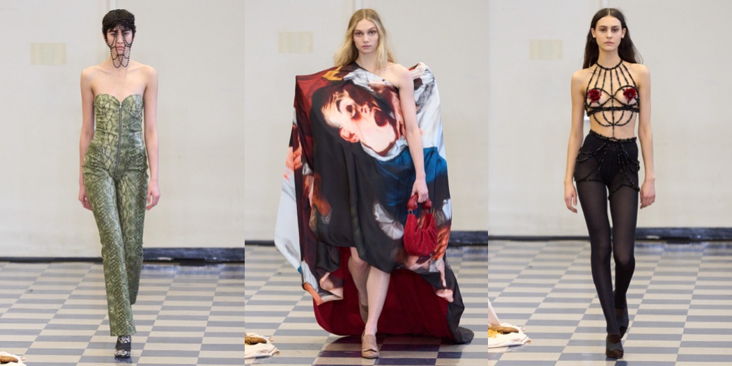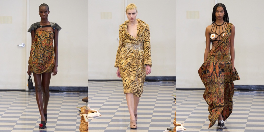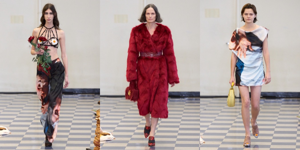 Puppets & Puppets is one of these New York brands you can’t easily describe. Calling it “surreal” would feel somewhat flat. Elusive, weird, strange, dramatic? Carly Mark‘s universe doesn’t really need a label. One thing’s certain: she loves a cultural reference. Accessorizing a collection inspired by the Dead Ringers film with bags that have phone receivers as handles – that’s Puppets & Puppets behaviour. Then there’s a blow-up print of a 1783 painting, The Operation by Gaspare Traversi, which depicts the wild-eyed face of a screaming man being operated on seemingly without anesthesia. The gory details weren’t immediately apparent when the material was made into garments, even when large swaths of it were used on a sculptural dress that related back to one from last season. The designer also revisited the egg motif (on bras and shoes) introduced in her American Psycho-inspired debut for spring 2020. Despite a few macabre touches, the mood of the autumn collection was sunny-side up: playfully optimistic and sizzling. “I am designing with my body in mind,” said Mark. “The roses on the boobs or the egg bra, where nipples would be – it’s very suggestive. It’s very feminine, it’s very sexual, and it’s a conversation that I’m having with myself in an alpha role in a predominantly male business and world.” Two of the strongest looks were a dress and suit with sheer inset corseting, revealing the midriff; those tailored pieces succeeding in bringing masculine and feminine together, which was one of Mark’s goals. Besides the pannier-like dresses there were also sequin sheaths, a few frocks made in a retro paisley and some party-ready mini dresses. Not every idea from the collection felt refined enough, and there were some low points, like the python-printed jumpsuits and beaded head-wear. Mark tends to overwork her runway looks. Sometimes, madness needs some method.