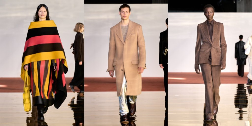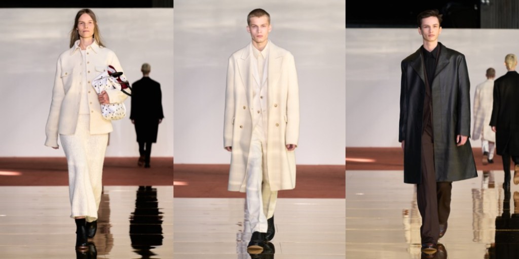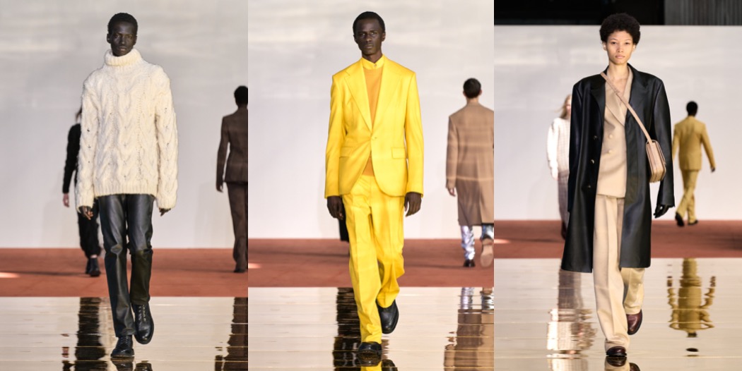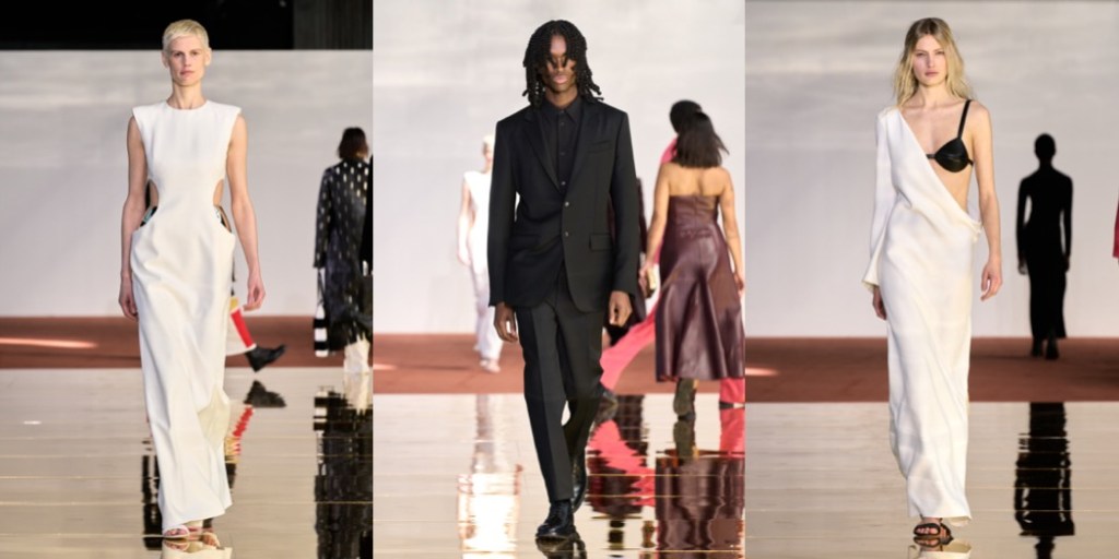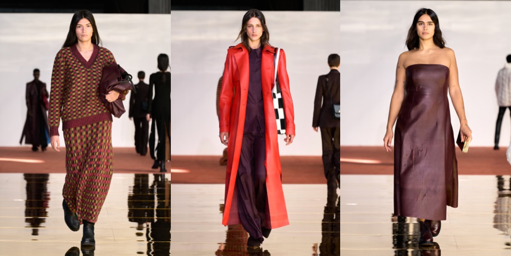 Gabriela Hearst stays in her comfy zone of classics and basics. With long sleeves, high necklines, and midi lengths, the designer’s dresses are the soul of discretion. This season’s version is colorblocked in squares of red, yellow, and black bordered by white. The motif was inspired by Eileen Gray, an early 20th-century architect and furniture designer who was often overshadowed by her male peers. Hearst tends to nominate under-recognized women as seasonal muses – Gray spent her last 30 years living a quiet life. Then, decades after her death a chair of her design that belonged to Yves Saint Laurent and Pierre Bergé sold for $28 million, the highest price ever fetched for a piece of modern furniture. There was a real connection between Gray’s vocabulary and Hearst’s today. The furniture designer’s lacquered wood screens provided the template for bags made from interlocking squares of leather. And a famous photo of Le Corbusier in the buff at Gray’s house E-1027 in Roquebrune-Cap-Martin, France, a large scar visible on his thigh, suggested the scarring effect seen on leather pieces. The slits cut into a burgundy trench flashed Mediterranean blue, while the ones on the burgundy strapless dress were fiery red. A pair of understated finale dresses with cut-outs on the sides from which metal panniers peeked out seemed to nod towards the chrome Gray used in her adjustable E-1027 table. She was the first to use the material, beating both Le Corbusier and Mies van der Rohe to the punch. Hearst was gesturing toward timelessness with this collection, which at moments felt simply… boring. It was rounded out with the minimal tailoring and robust cashmere knits for women and men that she’s known for, and a new collaboration with Tricker’s, the British shoemaker established in 1829. They’ll look smart with those knit midi dresses.