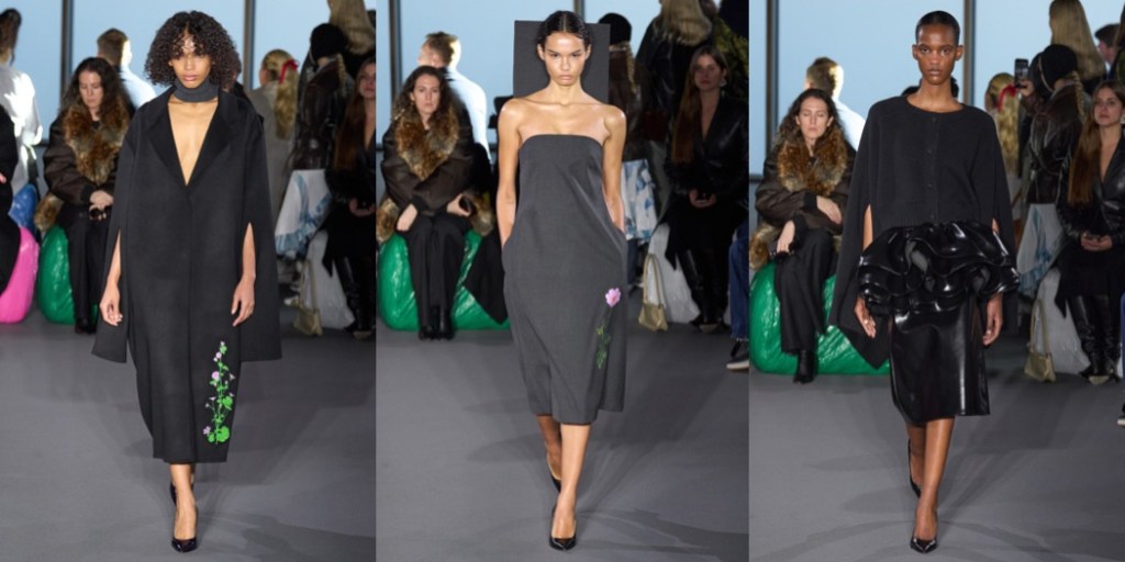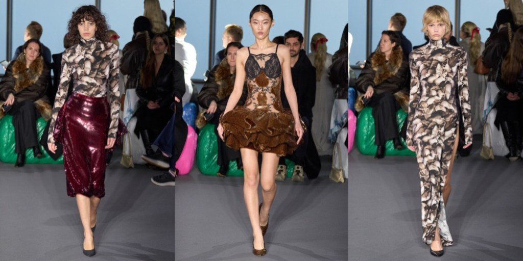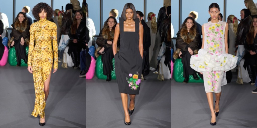 Sexuality is the focus point behind every Christopher Kane collection, and he manages to always approach it in a strikingly different, intriguing way. This time, the notion of it was amplified as a recording of a cat purring in the show’s soundtrack, a sensual metaphor for female pleasure. Animal instincts, biology, his working class Glaswegian school days, and, lately, artificial intelligence are all wrapped up in the matrix of Kane’s imagination. At a moment when it feels as if fashion ought to be going towards something cleaner and sharper, there he was, cutting plain gray school uniform shifts, but with stiff geometric upstanding collars that he later alarmingly called “chopping boards.” Then, his grappling with nature wasn’t all it seemed, either. There were pretty micro-flowers and solitary daisy embroideries he attributed to his championing of ordinary urban plants that “grow through concrete,” of the sort he saw growing up in a working class conurbation outside Glasgow. And then, there were his animal prints – overlapping hyper-real images of chicks, piglets, and rats (a TW moment for me) – on stretch jersey body-con dresses. It turned out, when quizzed backstage, that Kane had designed them with AI. “What you do is speak to it, give very specific descriptions, and then it comes up with it.”There are always some things in Christopher Kane’s work which feel a bit covertly disturbing or off – it wouldn’t have its weird originality if it didn’t. What’s for sure, he’s never someone who concocts things for the sake of instant public notoriety and clickbait. What he’s really about is being a designer of hot clothes that give women the chance to have a really great time with fashion.