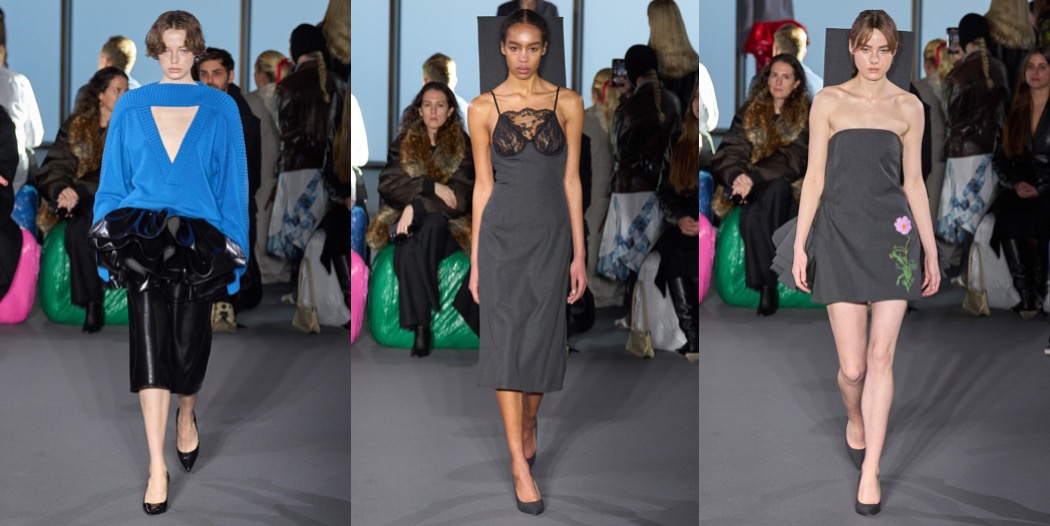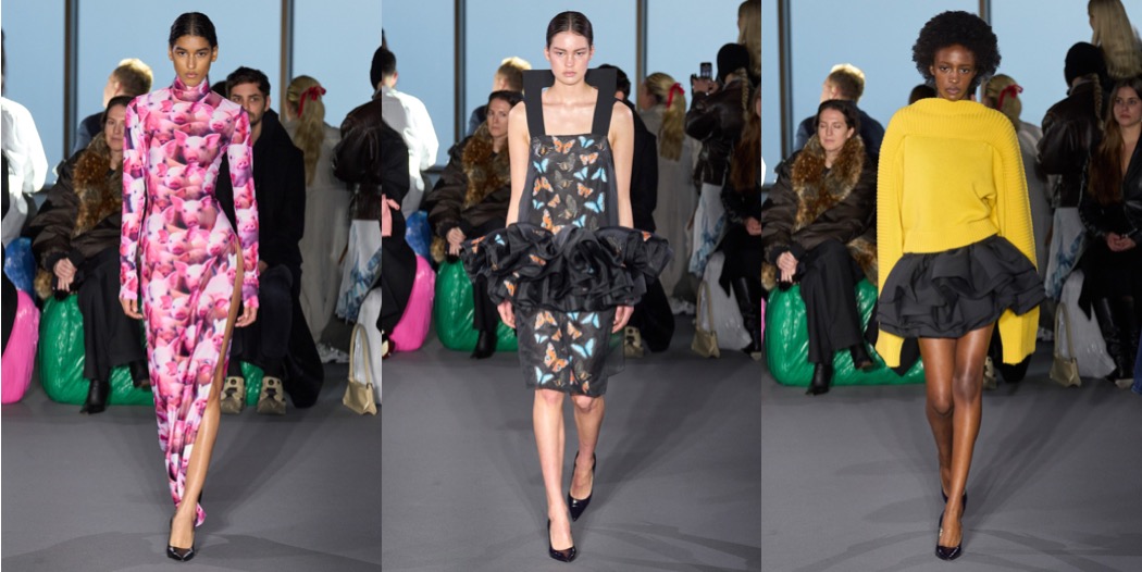 Sexuality is the focus point behind every Christopher Kane collection, and he manages to always approach it in a strikingly different, intriguing way. This time, the notion of it was amplified as a recording of a cat purring in the show’s soundtrack, a sensual metaphor for female pleasure. Animal instincts, biology, his working class Glaswegian school days, and, lately, artificial intelligence are all wrapped up in the matrix of Kane’s imagination. At a moment when it feels as if fashion ought to be going towards something cleaner and sharper, there he was, cutting plain gray school uniform shifts, but with stiff geometric upstanding collars that he later alarmingly called “chopping boards.” Then, his grappling with nature wasn’t all it seemed, either. There were pretty micro-flowers and solitary daisy embroideries he attributed to his championing of ordinary urban plants that “grow through concrete,” of the sort he saw growing up in a working class conurbation outside Glasgow. And then, there were his animal prints – overlapping hyper-real images of chicks, piglets, and rats (a TW moment for me) – on stretch jersey body-con dresses. It turned out, when quizzed backstage, that Kane had designed them with AI. “What you do is speak to it, give very specific descriptions, and then it comes up with it.”There are always some things in Christopher Kane’s work which feel a bit covertly disturbing or off – it wouldn’t have its weird originality if it didn’t. What’s for sure, he’s never someone who concocts things for the sake of instant public notoriety and clickbait. What he’s really about is being a designer of hot clothes that give women the chance to have a really great time with fashion.