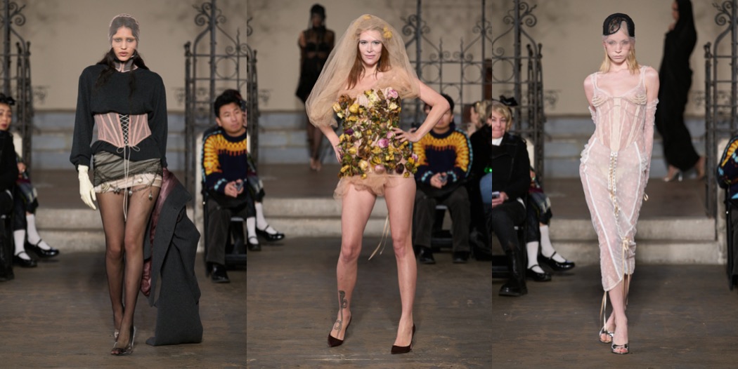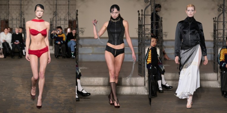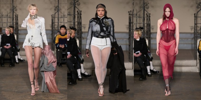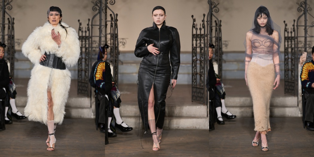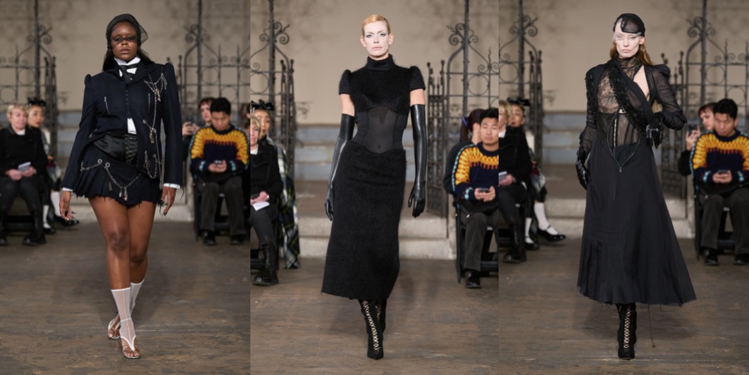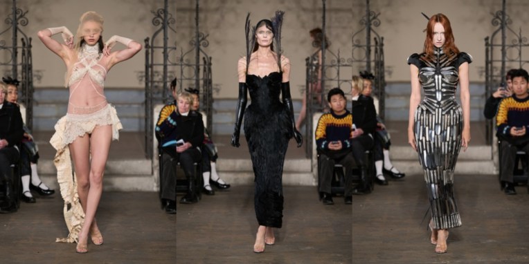 Dilara Fındıkoğlu plays with your emotions like no other designer in London right now: she pulls on your heartstrings, makes you feel her pain, and conjures an intensity that makes you feel what she’s portraying in front of you. For autumn-winter 2023, the designer took her guests to a chapel in East London to display her latest collection, and it was a divine experience. While so much of the “Not A Man’s Territory” collection explored sexual tensions (and a pain related to this), there was also Fındıkoğlu’s usual amount of fetishization on display. Latex tights clashed with leather bursting at the seams, tightened together with clips and metal fastenings that intended to make us feel awkward. Likewise, models dropping their demure coverings revealed boned corsets and lingerie dripping in crystals, subverting opulence with the idea of something voyeuristic. Fındıkoğlu’s collections are impossible to not become fixated upon. Models stare into the eyes of the crowd, the heels hit the stone with a sharp sensuality, and performances of others clinging to walls or having a moment to themselves once again draw you in, but in a way that implies we shouldn’t be looking. This is Fındıkoğlu’s power, expressed through looks that also give her power. The most exceptional was the eveningwear. A dress made from black feathers à la Black Swan was powerful. A black satin gown covered in butter knives that curved around the breast and sculpted the hips alluded to finding one’s strength, as if the dress was Fındıkoğlu’s shield. Bravo.