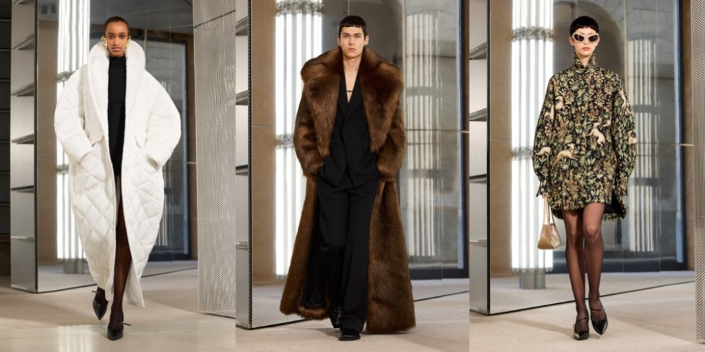 One year in at Trussardi, and it seems it’s clear what Benjamin Huseby and Serhat Isik are up to with the Italian brand. The latest collection is an ode to the Milanese style that made Trussardi prominent between the 1970s and ’90s. It all started with the puffer jacket, taken to the extreme to become XXL, like a bathrobe, padded and super soft. The leather on men’s and women’s skirts was distressed, softened, while the duchesse silk and nylon imitated the leather on classic cut blouses and less classic skirts with diagonal zippers. Everything read “sciura,” a Milanese term for the typical city lady, who only wears black, hazel, ecru and bordeaux, as in this collection, allowing herself to wear a jacquard motive that is reminiscent of the tapestries in the palaces she frequents. Isik and Huseby played with these clichés without mockery, rather using them as a key to a brand story that would otherwise be left untold. The final look was a mermaid skirt paired with a jewel belt and a sober turtleneck, completely black. It was like a contemporary version of the Trussardi look for the Teatro alla Scala premiere, an unmissable event for the typical Milanese. However, is this (quite convincing) storytelling enough to turn new clients on to buying Trussardi?