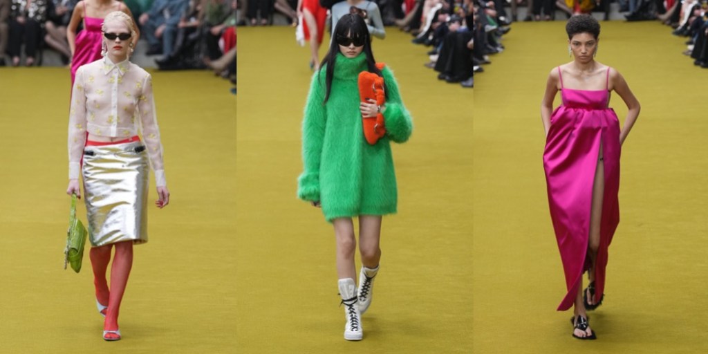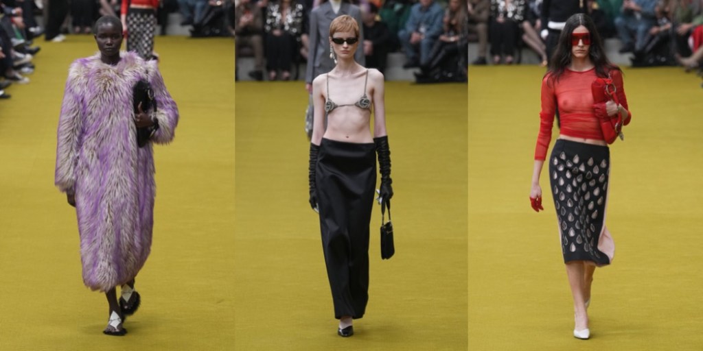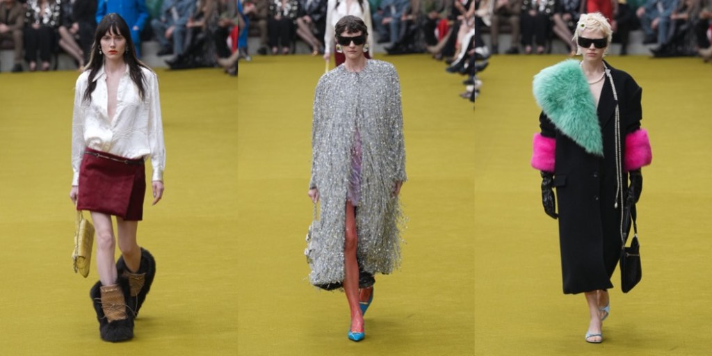 Gucci’s in the middle of a seismic change. Alessandro Michele’s aesthetic and visual impact is still all over the brand, while Sabato De Sarno, the recently appointed new creative director, will show his first collection in September. The Gucci design studio has a rare opportunity to go carte blanche. Like in case of their last indie-sleazy menswear collection, the in-house designers of the mega-brand are enamored with Tom Ford’s era, but revisit his slim-lined heritage through a quirky, Michele-lens. Heart-shaped faux-fur collars on coats and heart-shaped panniers on party dresses; crystal-trimmed portholes on a black shift and slip dresses constructed from see-through sequins; high-drama faux fur chubbies and low-key boyfriend jeans and button-downs; and on the accessories front: oversized double G buckles, a horsebit handbag revived from 2003, metal spike heels about half as high as their ’90s progenitors, and a couple pairs of mukluks. The casting told a story about heritage, too. Amy Wesson, Guinevere Van Seenus, and Liisa Winkler all walked vintage Tom Ford runways. At the end of the show, design team members by the dozen emerged on the green-carpeted show venue to take a group bow. The point was made: Gucci is far more than whomever occupies the creative director seat. Still, it’s a crucial role, the instinctive force that stitches a collection into a unified whole that’s greater than the sum of its parts.
