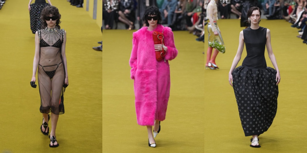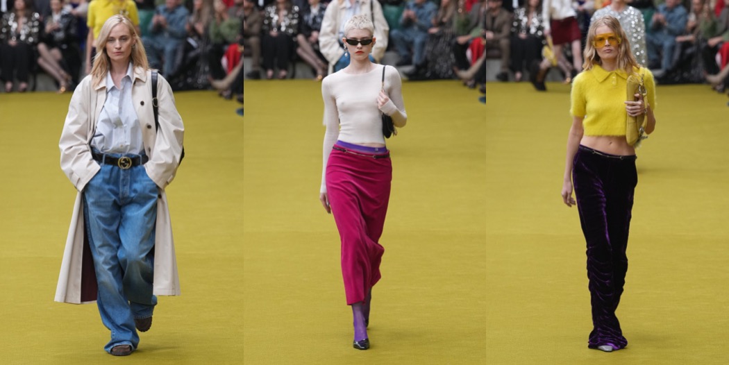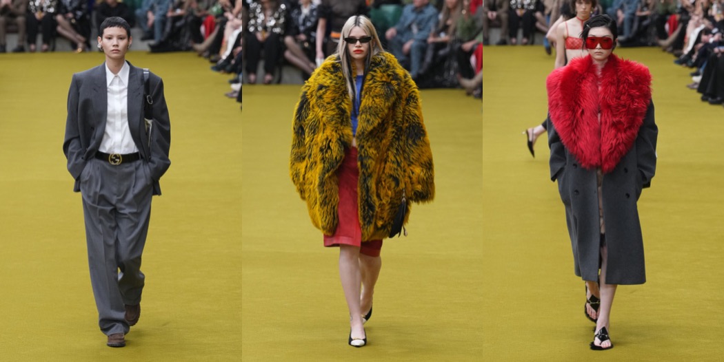 Gucci’s in the middle of a seismic change. Alessandro Michele’s aesthetic and visual impact is still all over the brand, while Sabato De Sarno, the recently appointed new creative director, will show his first collection in September. The Gucci design studio has a rare opportunity to go carte blanche. Like in case of their last indie-sleazy menswear collection, the in-house designers of the mega-brand are enamored with Tom Ford’s era, but revisit his slim-lined heritage through a quirky, Michele-lens. Heart-shaped faux-fur collars on coats and heart-shaped panniers on party dresses; crystal-trimmed portholes on a black shift and slip dresses constructed from see-through sequins; high-drama faux fur chubbies and low-key boyfriend jeans and button-downs; and on the accessories front: oversized double G buckles, a horsebit handbag revived from 2003, metal spike heels about half as high as their ’90s progenitors, and a couple pairs of mukluks. The casting told a story about heritage, too. Amy Wesson, Guinevere Van Seenus, and Liisa Winkler all walked vintage Tom Ford runways. At the end of the show, design team members by the dozen emerged on the green-carpeted show venue to take a group bow. The point was made: Gucci is far more than whomever occupies the creative director seat. Still, it’s a crucial role, the instinctive force that stitches a collection into a unified whole that’s greater than the sum of its parts.