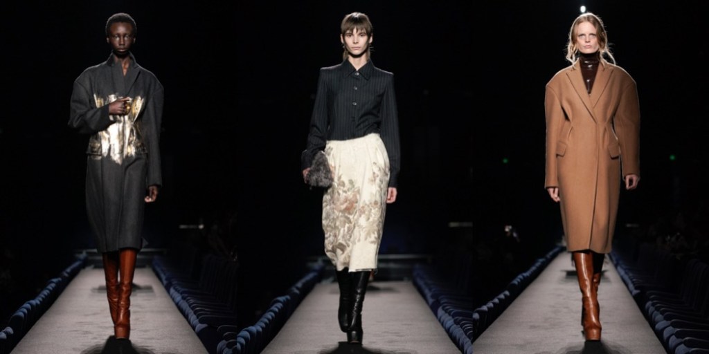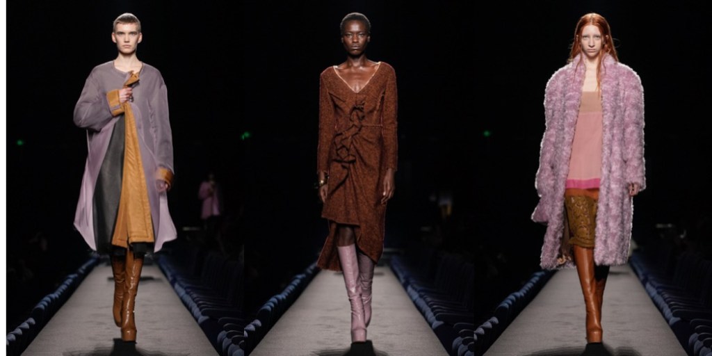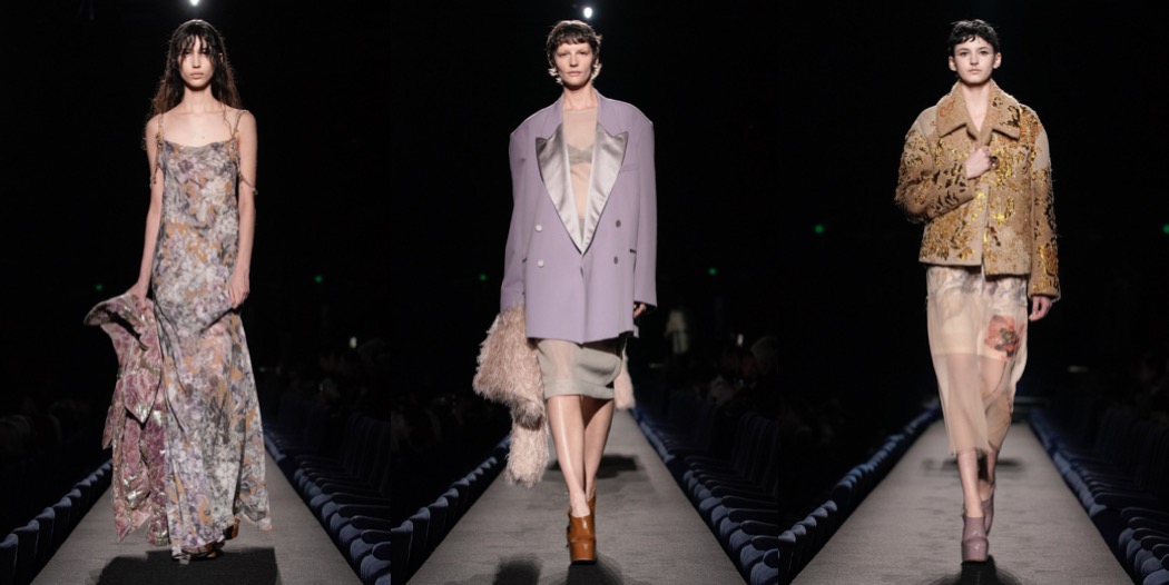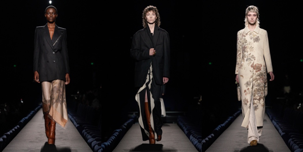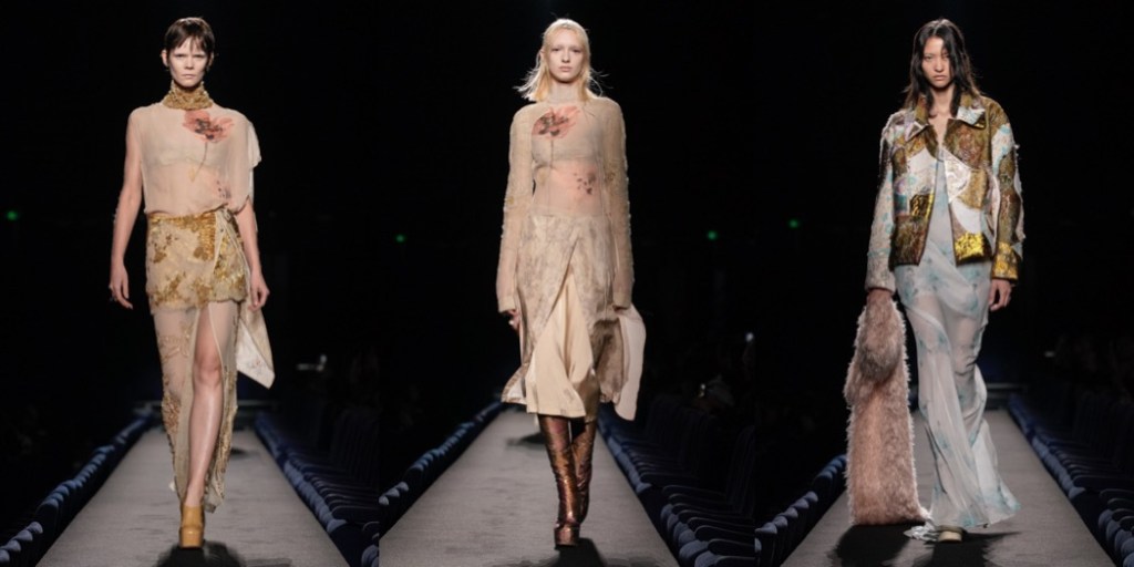 There are those Dries Van Noten collections, where the designer isn’t really into his usual vibrant flower-garden moments, and goes for something definitely more somber, melancholic. The autumn-winter 2023 collection shown in Paris today is one of those moody Dries seasons, and I love it with my whole heart. The latest offering has a dark and Antwerpian quality about it, with its velvets and antique-looking embroidered silks patchworked into turtleneck tops and jackets in a deconstructed, Martin Margiela manner. In general, the collection’s beautiful garments have that feel of being well worn, as if time has been behind the sun-bleached look of the tapestry florals or the weather-stained fringed hems of the dresses. With this line-up, Van Noten also reminds us that he’s a master colorist: the delightful palette of ochre, burgundy, maroon and lilac are here to inspire our wardrobe next autumn. There was also gold: sometimes super-polished, sometime crinkled on the waists of the coats. It was very kintsugi – the Japanese art of repairing broken pottery by mending the areas of breakage with lacquer dusted with powdered gold. In a world that needs lot of repairing to be done, why not wear this gorgeous Dries Van Noten collection?