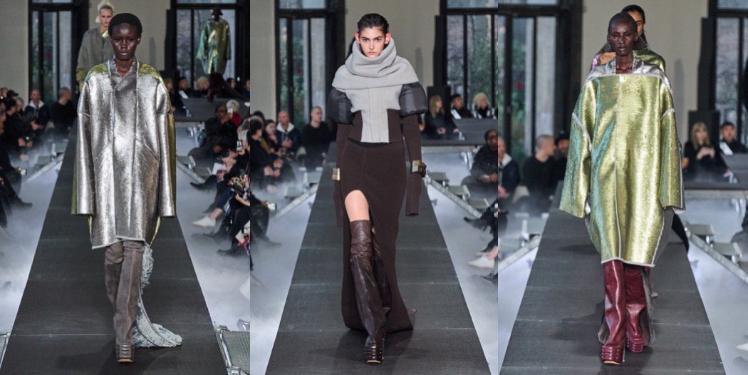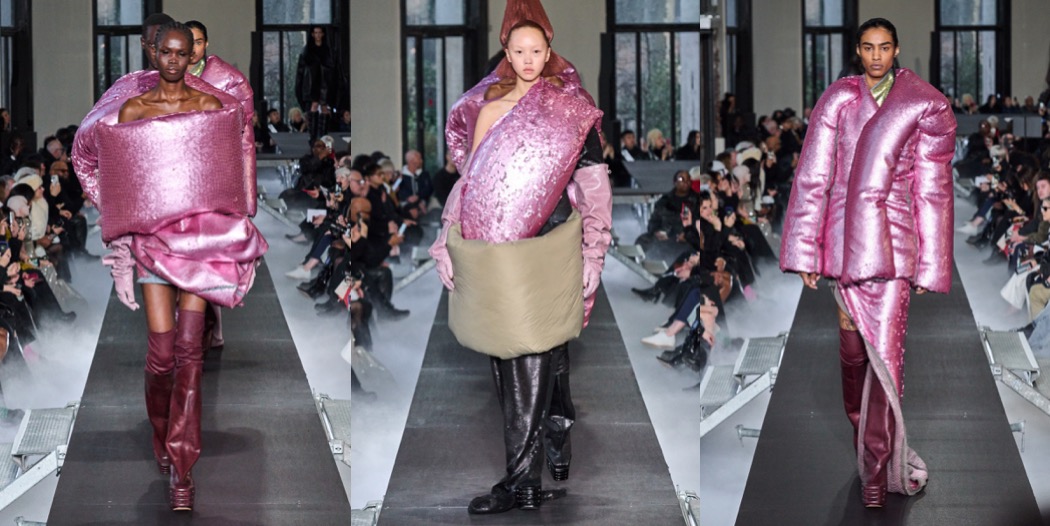 Rick Owens‘ latest collection is powerful and beautiful in its strangeness. The bulbous shapes, the rough textures, the elevated silhouettes… “Conditions in the world being the way they are, it’s kind of a delicate time,” the designer said pre-show, alluding to the war in Ukraine. “And I was thinking I wanted to do something earnest, and more formal and more deliberate. I kept thinking of the word exquisite.” In pursuit of the exquisite he leaned into matte sequins, not in the gaudy red carpet colors you associate with embellishments like that, but in more muted tones of lime green, art deco pink, and bordeaux; and not, of course, in the fishtail silhouettes that seem to multiply during awards season, but in those donut duvets and inflated draped miniskirts. Those sequins aside, Owens was working with humble materials. The cutaway skirts that exposed the hip bone on one side and trailed down the runway in a long train on the other, and the dresses sliced to the armpit? Those were ribbed knits made from GRS certified recycled cashmere. And those decaying and fraying half-skirts and coats? That was indigo denim from Japan, which had been treated with a mineral wash and shredded by lasers. Extraordinary effects out of relatively simple materials. “That’s my job,” said Owens, “to present the most excellent aesthetics I can. I know I’m commonly referred to as dark. I think no, I’m just realistic and I’m acknowledging the beauty and horror of the world. There are some people that prefer something more sugar-coated, and that’s fine, I don’t criticize that. But I prefer something with more nuance.”