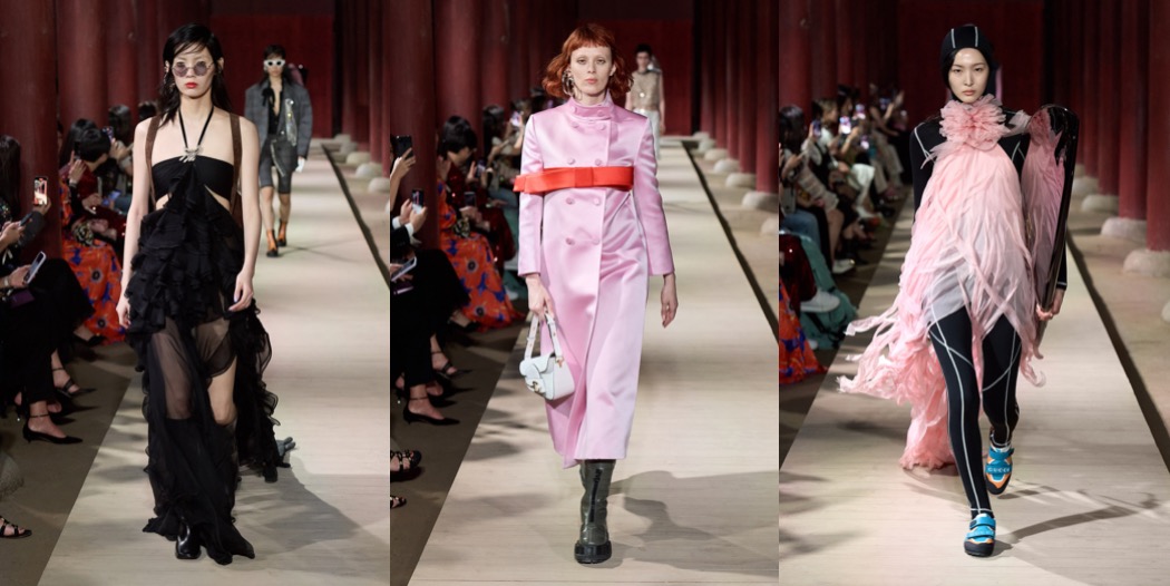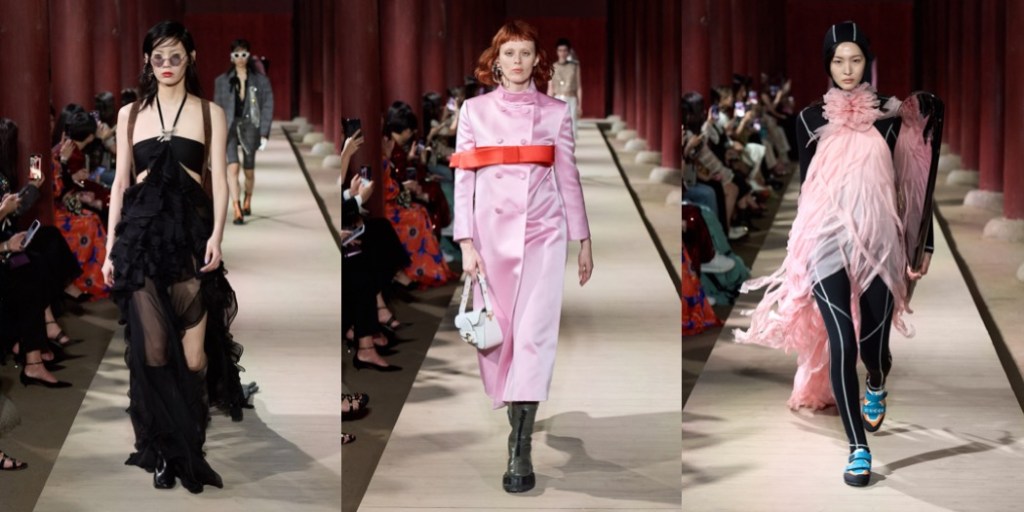 Gucci is the latest house to stage a premiere event in Seoul. By now, the West understands the importance of this market, which holds a global influence. But it is no longer enough to simply show up and believe the sales will follow. Indeed, the idea of a show at Gyeongbokgung, the former royal palace where the Gucci show unfolded, induced more than one raised eyebrow among locals. Any Korean has been a hundred times over on field trips, escorting overseas guests, to see the cherry blossoms bloom, and it is the de facto destination for all foreigners shooting music videos, ad campaigns, and short films. The front row was filled with celebrities, both international (Dakota Johnson, Elizabeth Olsen, Saoirse Ronan) and domestic (NewJeans’s Hanni, IU, Lee Jung-jae). So what did Gucci see of Seoul? Model Sora Choi opened the show in a long black padded coat over jeans, clutching a fetching baguette-shaped bag that appeared again and again (kitted out in crystals, quilted in holographic lilac). There was a blend of bourgeois streetwear and sportswear, such as the bouclé bike shorts with the ladies-who-lunch jacket, cropped to flash the midriff, as well as a standout pale pink chiffon dress with tiered ruffles that fluttered down the runway, which was worn over a black scuba suit. Neoprene was seen as layered turtlenecks that zipped up to the chin, and paired with tweed midi skirts embellished with diamanté crystals racing up the sides. The referential mix of Tom Ford-era at Gucci nods was another move, although very forced. A sateen lilac coat worn by Karen Elson that closed with a red bow resembling the one which closes a traditional jeogori jacket was an elegant take on Korean heritage, as were the surrealist illustrations of pink jello and cat’s paws by local artist Ram Han. These were the finest highlights of this very unfocused collection.
