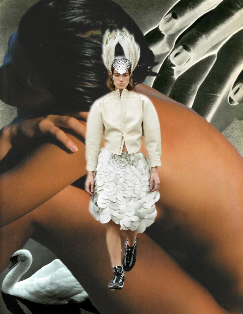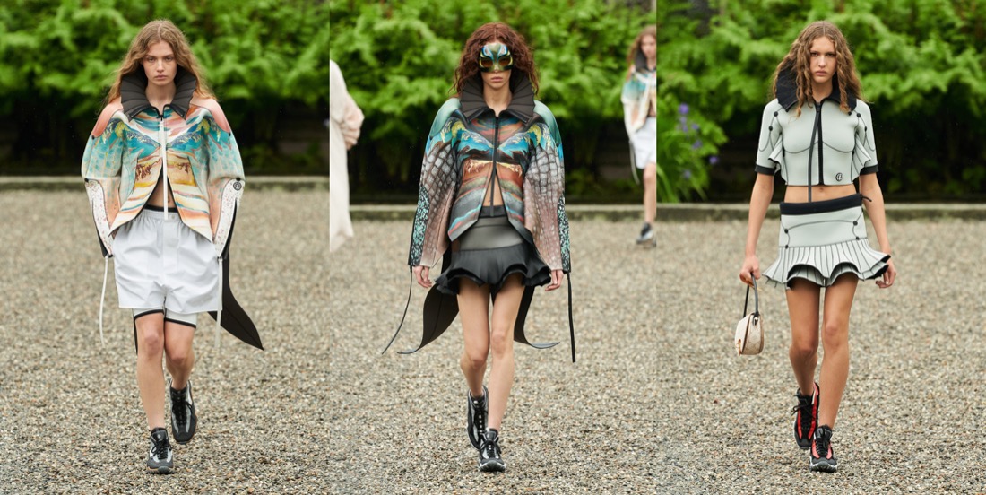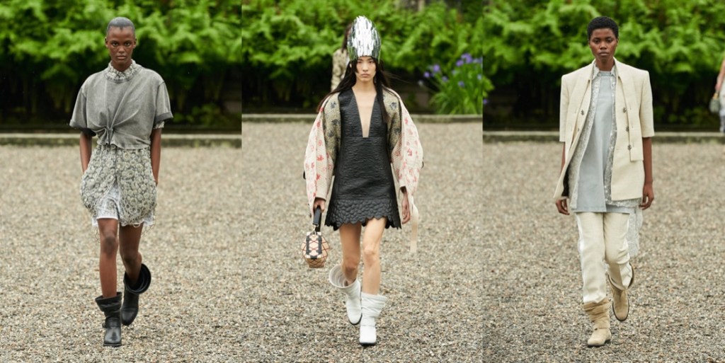 “By the end the mermaid becomes a flower, but maybe not a flower that exists,” Ghesquière said. That notion produced a group of long dresses in more of those pastel shades that qualified as real news for the designer, who has typically shied away from gowns on the runway at LV. They were delicate and bold simultaneously, a mix of silk, georgette, organza, and lace from their softly draped bodices and pouf sleeves to their sculptural, swingy hems. Who needs mysterious lakes when you have the power of imagination? Who wants quiet luxury when you can have a couture-level cape with water droplet beading or a quilted damask jacket featuring wyvern, unicorn, and other legendary creatures? A captivating, transportive show.
