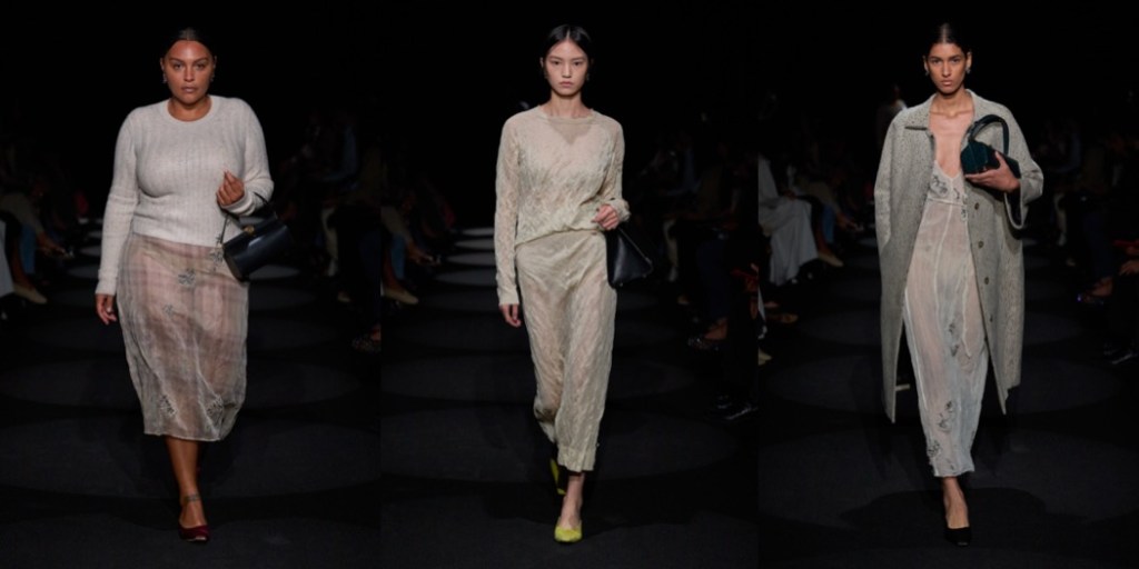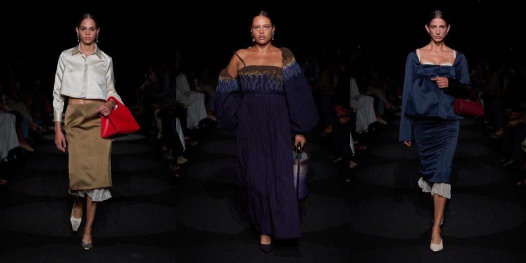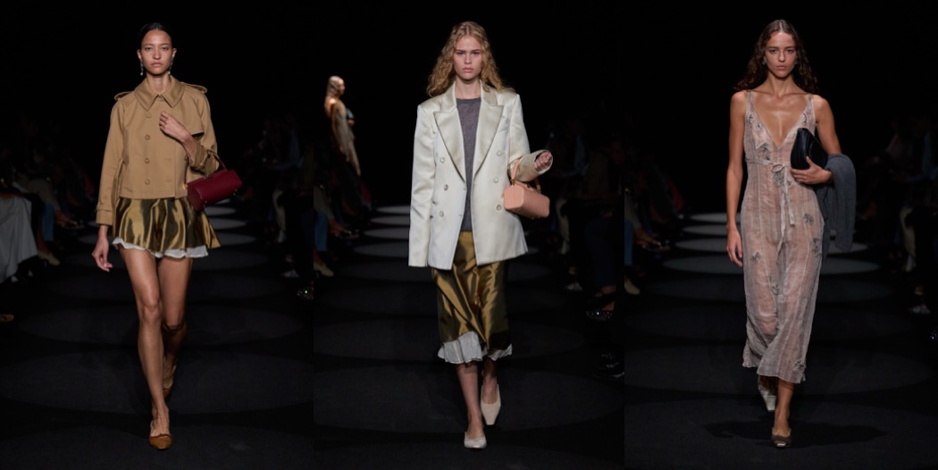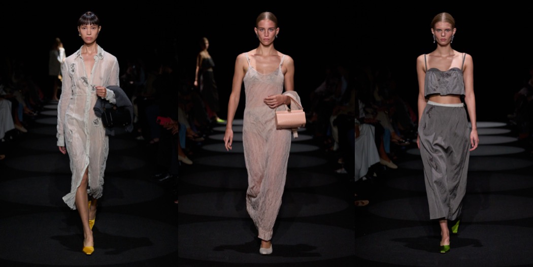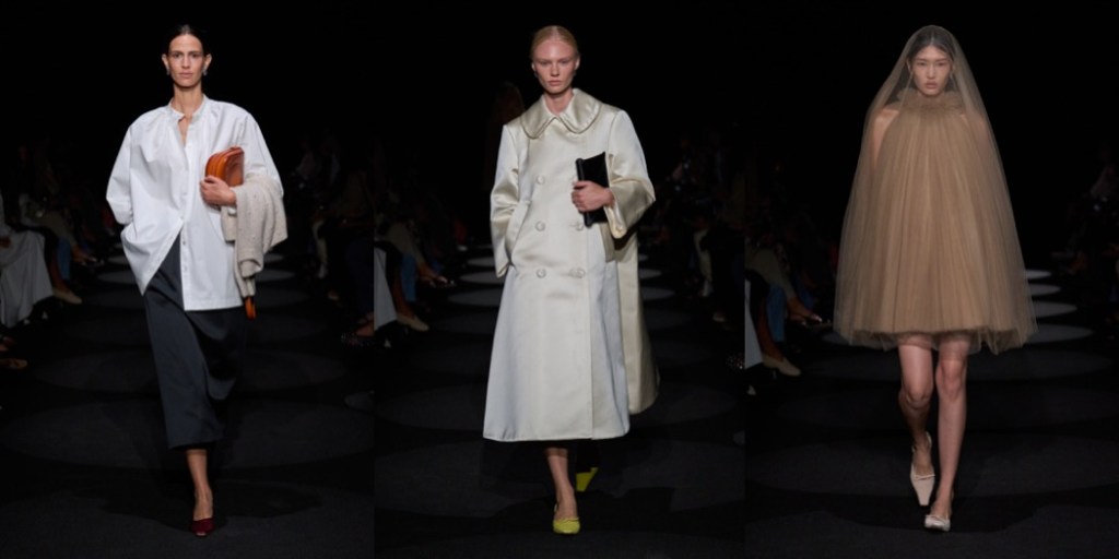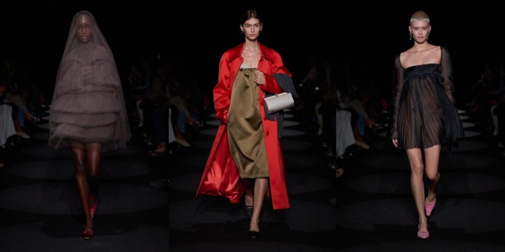 Second season in a row, Joseph Altuzarra delivers one of the best collections of New York Fashion Week. His winter offering was a refined look-back at his signature, urban elegance; for spring-summer 2024, the designer nods to Roman Polanski’s Rosemary’s Baby and Miuccia Prada’s style, an aesthetically-ecstatic combination of references. The film’s haunting undercurrents felt close to the surface of Altuzarra season, with tulle veils and matching 1960s babydoll dresses and the she’s-come-undone details, like the crushed textures of everything from slipdresses to A-line coats, gauzy organza slips peeking out from underneath the hems of pencil skirts, and the DIY-ish embroideries on other skirts and dresses. Miuccia’s spirit could be perceived all over the bourgeois lady-likeness, which is never obvious; there’s always a sexual tension behind it. To tempt the clients who want to play around with uptown sexiness, Altuzarra had satin coats in red, butter yellow, and ivory that were A-line and somewhat oversized, “almost as if you took a doll coat from the ’60s and blew it up a little bit,” and a strapless polka dot trapeze dress straight out of 1950s couture. There was also a pair of gowns, one black with thin straps, and the other a white tank style, that looked neither twisted, nor bourgeois; they were simply striking.