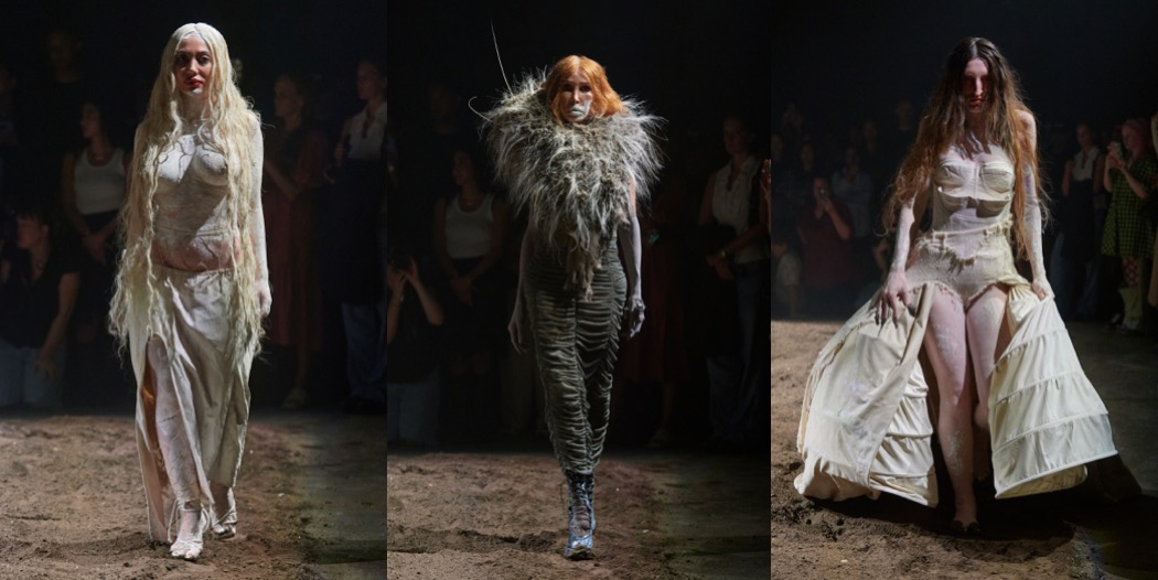 In the sea of New York Fashion Week’s collections that deliver mediocrity mixed with business, Elena Velez is an outlier. She is here to disturb the peace. And the system. The spring-summer 2024 fashion show took place at a warehouse in Bushwick. After the finale walk, a handful of the models started a mud fight. Some guests got splattered. Velez enjoys creating such discomfort. The designer gave no interviews after the show. She wanted the spectacle to speak for itself. Instead she let her press notes do the talking. “Where are our antiheroines?” she asked, adding that the collection, titled The Longhouse, was a “ritualistic catharsis to the coddling, histrionic, and moralistic ills of oversocialization.” Maybe the mud fight was a visual representation of our online interactions, which often lack nuance and have little care for context. Velez went on to state that the show was a “creative interpretation of the reorganization of contemporary society around feminine expressions of control and behavioral modeling” and a reaction to a “climate of post-progressivism where resistance to a monolithic cultural paradigm is intensifying.” It’s hard to unpack these ideas. What was clear was Velez’s commentary on contemporary womanhood. “It feels to me like the sanitization and unilateralization of womanhood in popular culture today leaves no room for the nuance and multiplicity we deserve as architects of labyrinthine interior lives,” she wrote. In short, and in plain English, her point is that women can be good and evil, kind and angry, soft and rugged, and passive and aggressive. Velez offers them eveningwear that remains as compelling and striking as ever; a standout was an askew and elongated corset that melted onto the body with a draped skirt covered in silicone latex. But most fascinating were her commercial propositions: waffle-knit tights, zip-up bustiers, canvas jackets and shirting constructed with seams and darts inside out, layered T-shirts, and a terrific cropped bomber jacket with its bust cups slashed in half. You want to meet the woman who wears Velez’s clothes; you might fear her, but you also want to befriend her.