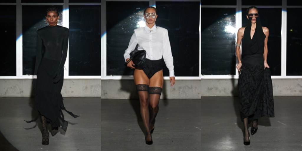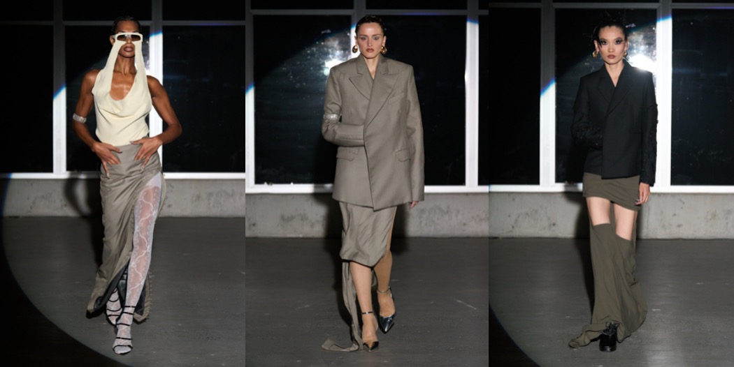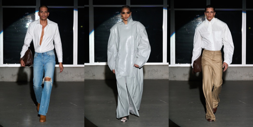 For a couple of seasons now, Luar is the finale New York Fashion Week show. It’s a good ending, one that leaves an impression of hope for the city’s contemporary fashion. This was Raul Lopez’s most streamlined and mature collection to date. The butter yellow boxy jacket that opened the show had rows of fully functional rouleau buttons that wrapped around the arms and could be unbuttoned to form a short sleeve jacket. It was worn with a matching pair of shorts that could be unbuttoned to become a panty, and white sheer hose – a mainstay of a certain church look for Caribbean women – and golden sandals. This opening look conveyed the rhythm of this collection, which was mostly about experiments with tailoring . A series of long tailored jackets with wide peak lapels appeared to be worn over draped skirts in the same fabric but were in fact all one piece – a fact that was only obvious as the models walked away and you noticed an elaborately draped back. It hinted at the tension Lopez was exploring – the wanting to move forward but getting pulled back by circumstances or by human temptation. Further pushing this point were the button-down shirts worn underneath the suit, in classic banker stripes, which featured an extra long collar that stood out against the neck – mirroring the motion of actually being pulled back by the neck. Other standouts included the separates made from “crackle vinyl,” meant to mimic the cement floors that are typical in the houses in the Dominican Republic neighborhood where Luar had its show. It looked particularly glamorous on a shirt with that same rouleau button detail along the sleeve and the bodice, tucked into a high-waist mermaid skirt in a shade of warm cement gray, and a little subversive on a shirt in a cooler shade of gray tucked into a pleated skort and worn with a long white tie. “I think this season I was more refined with the hand embroideries, the fabrics, the suiting, the crepes… I just feel like I’m evolving into my true self,” Lopez said. “This marks the 10th year that I do an actual runway show, and I was thinking how all this hustling and bustling really paid off, because it’s such a beautiful thing to be a New Yorker and be recognized in the city. And it kind of sets the tone of having to show out when I do a show.” He paused for a second, “but who knows what next season will bring? Maybe I’ll go back to being crazy.”