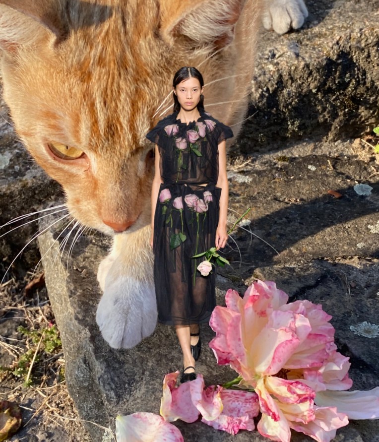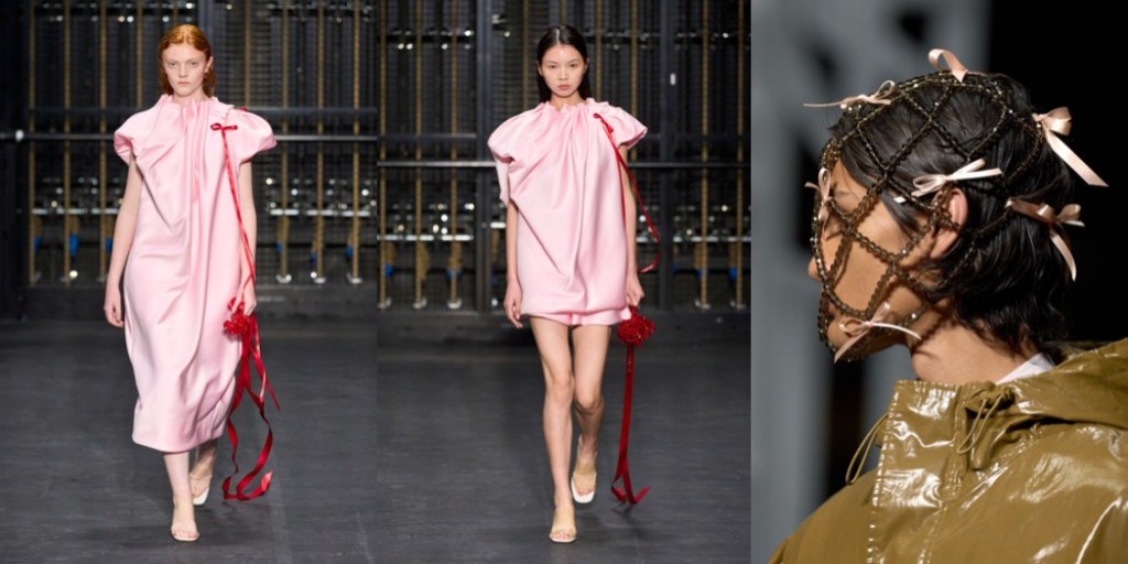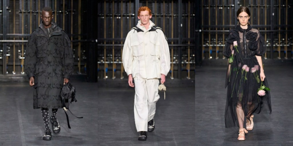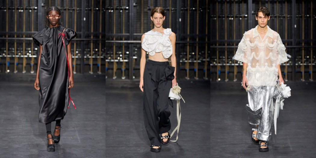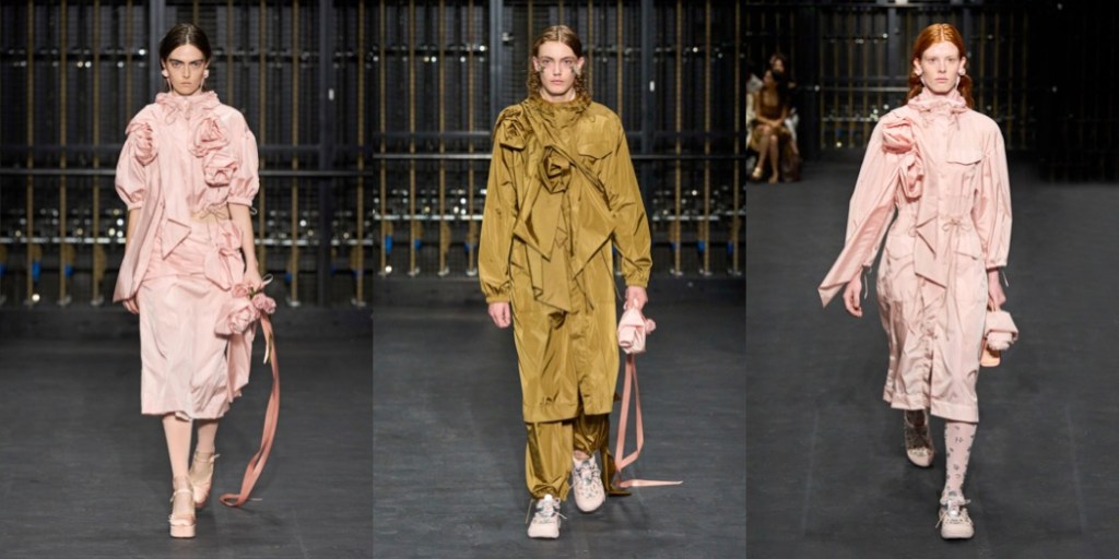 Simone Rocha staged her spring-summer 2024 show in the rehearsal space at the English National Ballet. “I love the rise and fall of doing a show,” she said. “Sometimes it’s a big spectacle, sometimes it really brings people in.” By shows, she also had wedding ceremonies on her mind. The cake-inspired tiers of appliqué on white tulle dresses and the sound of silver “wedding” bells tinkling on slippers, sleeves and bags. “It’s almost fragmented,” the designer said of Frederic Sanchez’s music for the show. “It’s that disturbed feeling, all the emotions of a rehearsal… the nerves!” Despite the sense of tension Rocha set out to create, there’s little chance of a bride wearing one of these dresses getting cold feet the night before. The show’s highlight: instead of a bride holding a bouquet, fresh roses were bunched between layers of sheer tulle, and fabric versions were manipulated into dresses and jackets. Models carried single stems fashioned from cotton or pearls, and bare legs were decorated with red rose tattoos. As a motif, it was equal parts enchanting and fragrant.