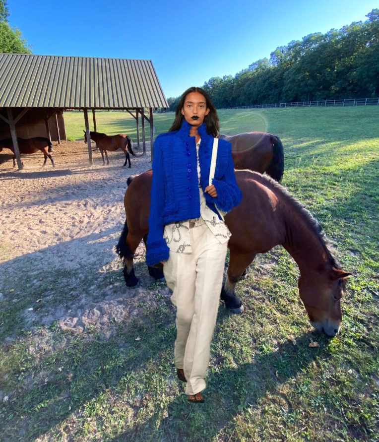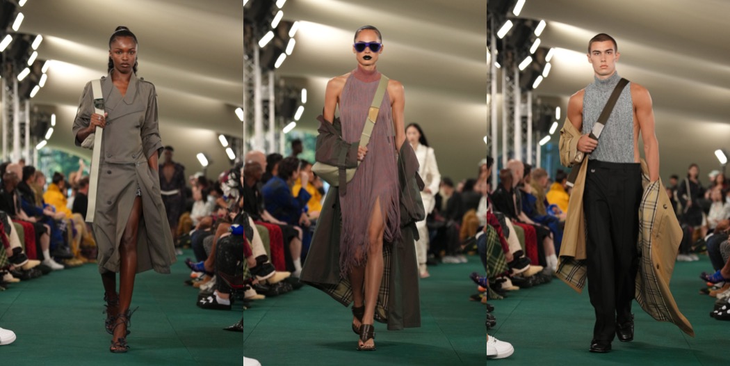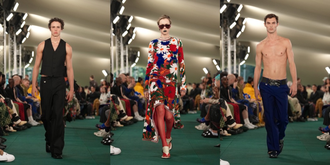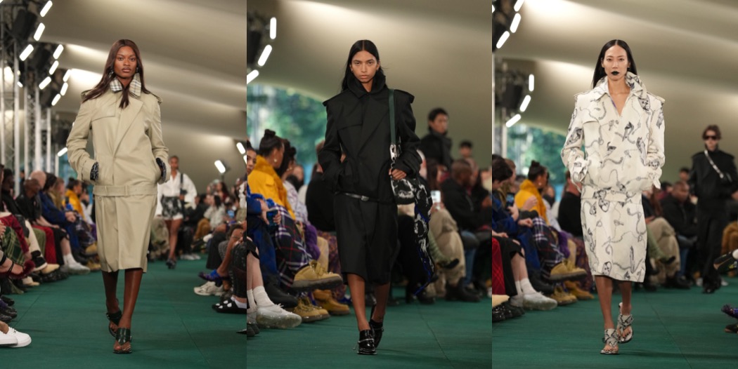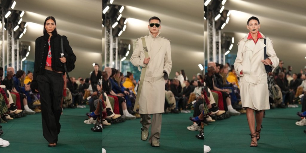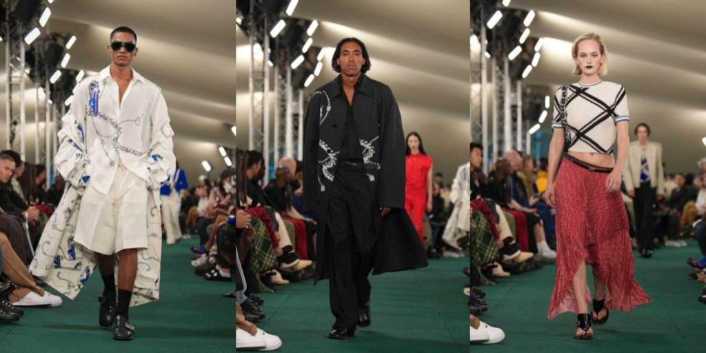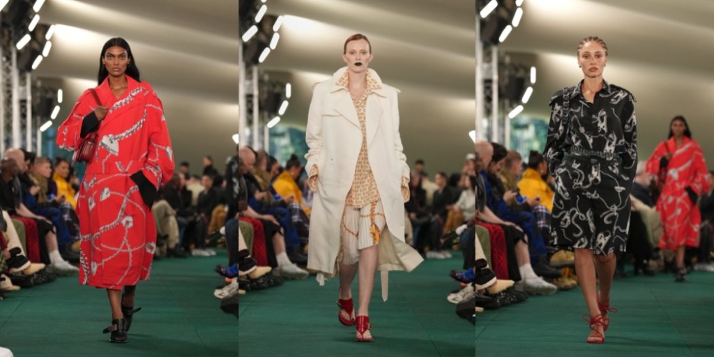 Daniel Lee‘s debut collection at Burberry signaled that he isn’t planning to reinvent the wheel at the brand. His sophomore collection, presented yesterday under the tent at London’s Highbury Fields, confirmed the assumptions about the designer’s direction for the house: clothes and accessories interweaved with Britishness. But is it enough to truly revive the brand? Unfortunately, the spring-summer 2024 failed to deliver a cohesive “look”. The knee-length, low-belted silhouettes with symmetric lapels and minimal epaulettes applied across womenswear and menswear could easily be Stella McCartney. Instead of last season’s blanket coats, Lee presented his take on the trench coat. The boxy shape looked neat and crisp, but it didn’t make my heart beat faster. Lee had moments dedicated to English summer flowers and fruit: cascading swarms of blue strawberries, blown-up meadow-flower prints. The clumsy-looking knitted dresses didn’t do it for me. While Burberry’s new visual communication thrives and the brand drastically increases prices on its goods (have you seen the knitted duck cap for 3000 euros?), Lee’s work – the heart of reinvention – needs more clarity.