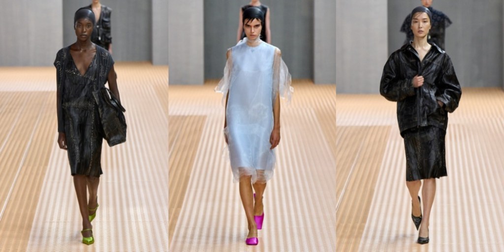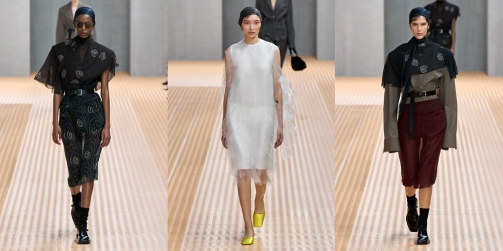 Like the gritty men’s spring show, the foundation here was a tailored silhouette: broad-shoulder shacket (with the cuffs of a shirt and the lapels of a jacket) tucked into the belted waistband of high-rise shorts or front-pleat, tapering-to-the-ankle pants. Some of these odd suits were swathed in sheer printed scarves that the show notes described as “fragments of dresses.” Their ethereality provided a link to the collection’s other key shape, sleeveless shifts with 1960s-via-the-’90s lines made from organza and gazar of such gossamer fineness they seemed to float down the runway. A couple of other things that got people talking: the already-worn-in barn jackets (why not wear one over a Jazz Age flapper dress?) and the hand-carved mythological-man clasps adorning evening bags that reproduced a shape first designed in 1913 by Prada’s grandfather, who traveled the world picking up unique baubles like those carvings. These bags are heirlooms in the making.