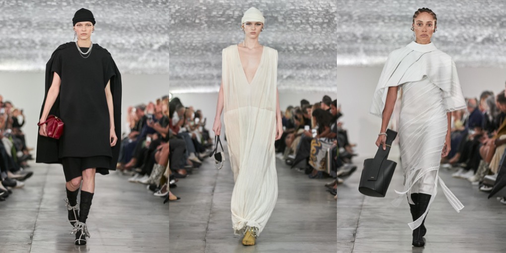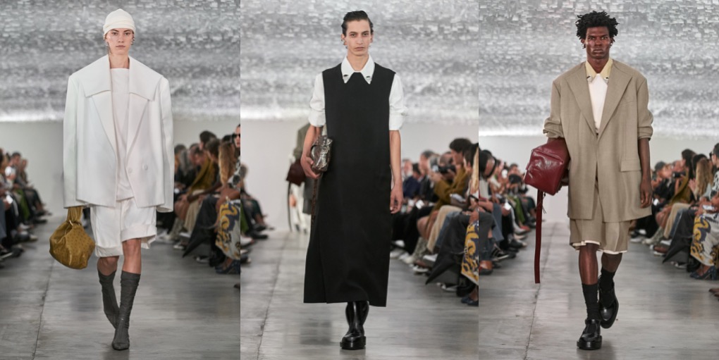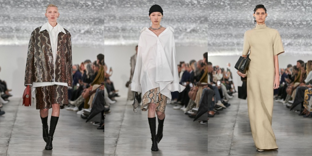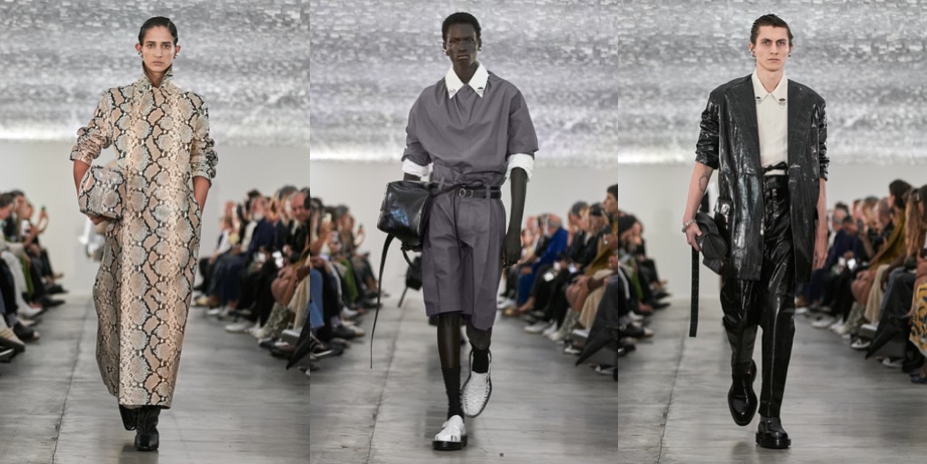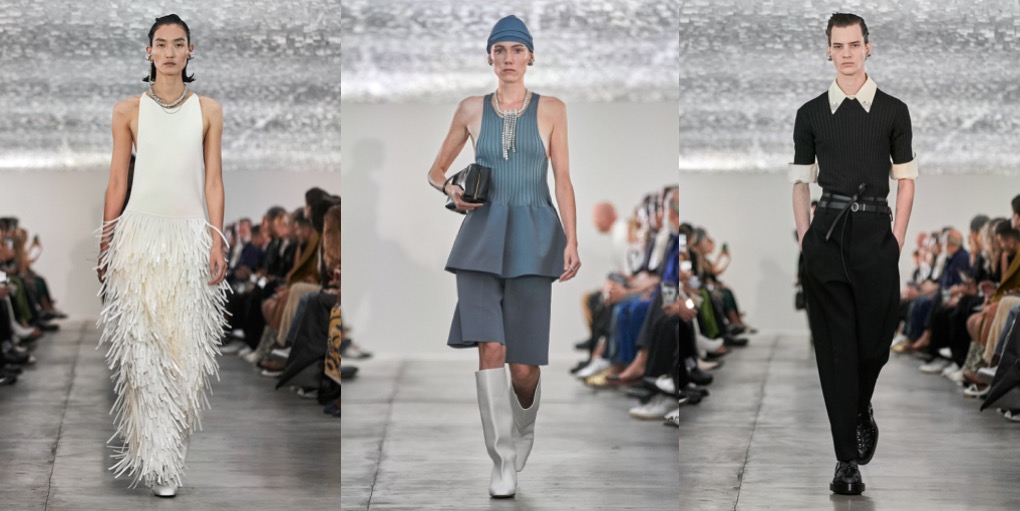 Jil Sander – the designer – is a minimalist, but Jil Sander – the contemporary brand – is minimalist no more. Backstage of their eclectic spring-summer 2024 fashion show in Milan, Lucie and Luke Meier explained that their collection was a study of shapes. The two knit dresses were examples of that with their clingy ribbed bodices blossoming below the waist into fuller skirts. Rhinestone necklaces signaled that the brand is open to a bit of opulent bling. Experiments with shapes were further translated in tailoring: the designers cut jackets as boxy as squares and paired them with sailor-collar shirts and shorts to accentuate the silhouette. Or else they elongated their lines, showing duster coats on the guys and extending the men’s jackets nearly to the knees while raising the waistband of baggy shorts well past the navel. There was a looseness to their approach to tailoring; it suggested that they feel freer to play than they did in their earlier days at the label. That freer sensibility held true of other categories too. Button-down shirts were accessorized with metal discs on their collar points, like built-in jewelry, and vests came with twin portholes on the upper chest outlined in the same polished chrome. The portholes were a little on the large side, but you appreciated the instinct. No quibbles with the giant cat face prints on a couple of tunic dresses.