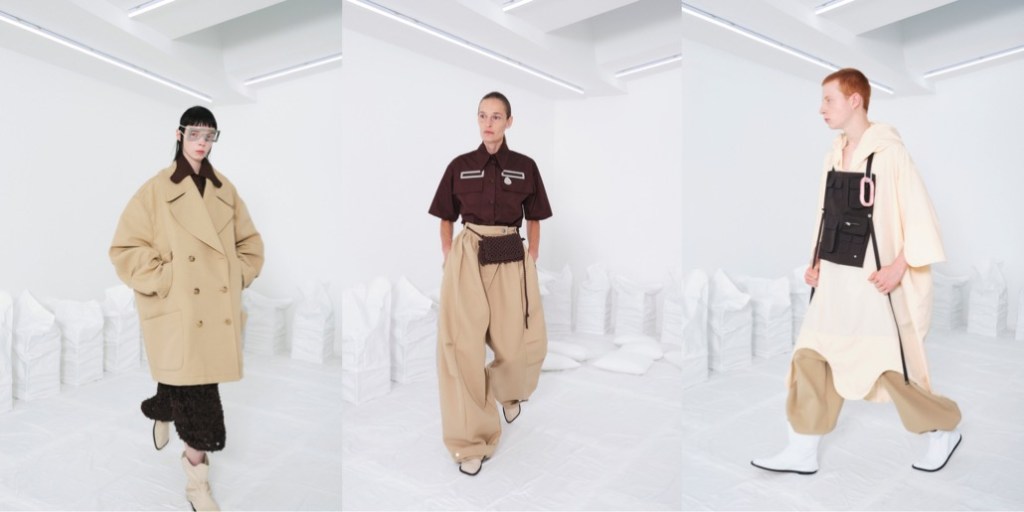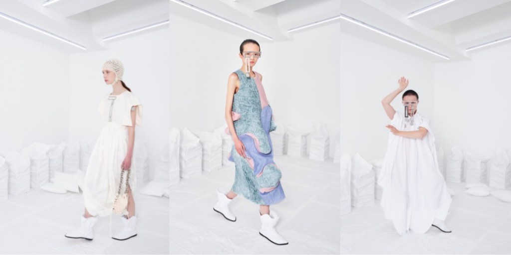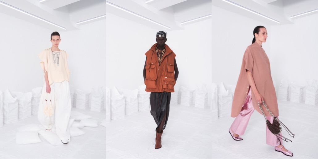Sometimes, a small, tightly-edited collection might be worth more meanings than an entire, budget-proof fashion spectacle. “In the white space, you see things for what they are, and you forget where they came from,” says the enigmatically vivid press-note for Niccolò Pasqualetti’s spring-summer 2024 collection. The white space might refer to the white cube venue the young designer chose for his fashion show in Paris. But it might also allude to a more metaphorical, imaginary space. In such a place, one thing easily changes into another. “A simple evening dress, a classic Italian suit, caught in a moment of transmutation, evaporates into a cloud. Each detail, the buttons, the zippers, the stitching are disturbed by this process. Yet still some recognizable pieces pierce through the fog, only slightly obfuscated by it.” Garment distortions are Pasqualetti’s key signatures; drawstrings, secreted in garments, are able to totally transform the silhouette. Take the free-flowing cape that cinches itself to form a column. Like protective clothing, when pulled tightly, it forms a seal with the body. These fastenings reappear, in the shoes, and in the hoods which hide within the collars of jackets. In Pasqualetti’s poetic world, there is no night and day, as everything happens at the same time. Pockets multiply across the collection giving each look a newly practical dimension regardless of the occasion. Then, laid on top of everything, silver jewellery that resembles out-of-this-world, spiritual amulets. Yes, that might the right word to describe this collection: spiritual.