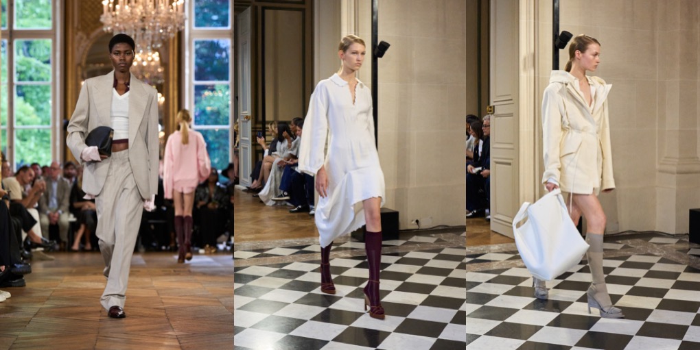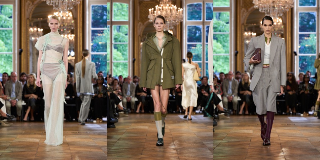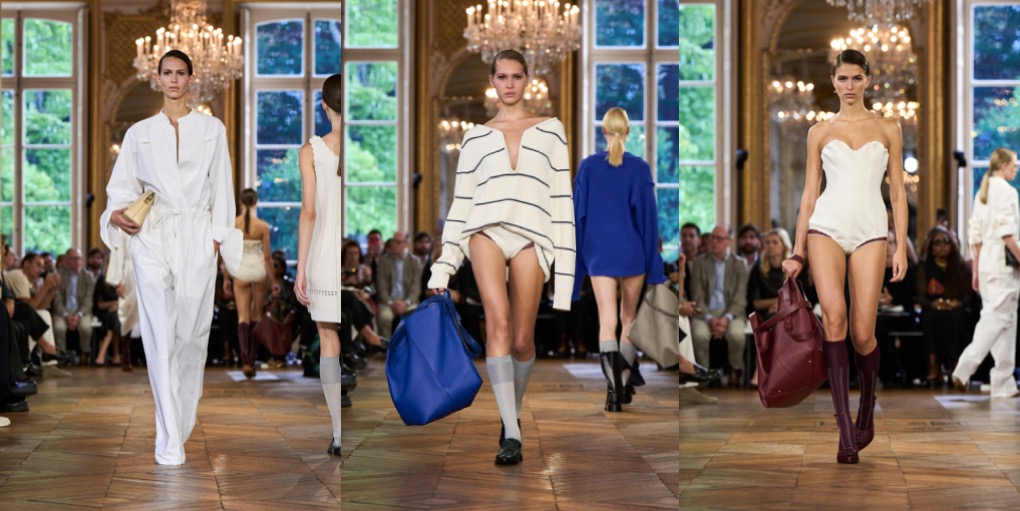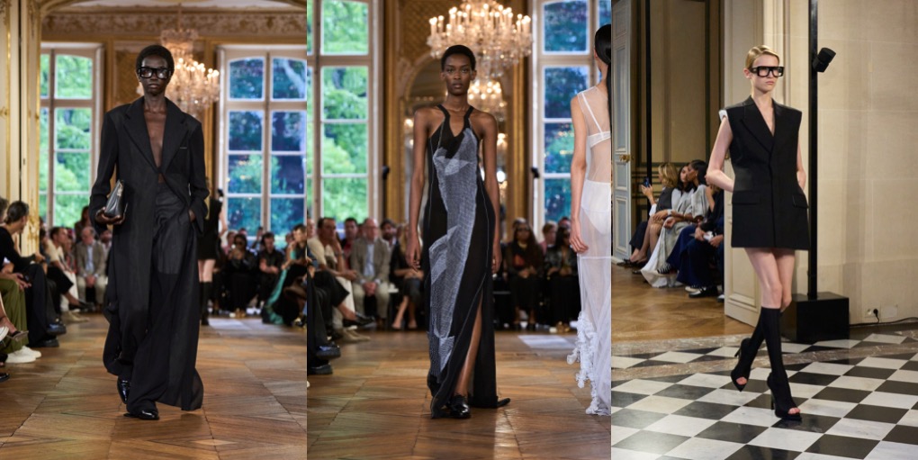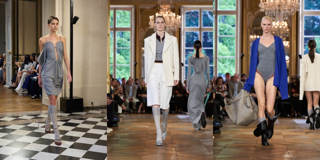 This Victoria Beckham collection felt kind of undecided. Preceded with a fragrance line launch and Kim Kardashian’s late arrival to the fashion show, Beckham’s spring-summer 2024 outing offered many ideas of what this brand could be. But when there are too many answers available, the picture becomes foggy. One good thing about it: the designer is finally overcoming Philo-mania (which she might replace with a Jenna-Lyons-obsession, judging by her appearance in the front row and all the big glasses the models wore), and seems to go her own, aesthetic direction(s). Beckham’s collection was founded in her teenage memories of the intense classic and contemporary ballet training that eventually got her into musical theatre. Taking her starting point in the unassuming rehearsal wardrobe of ballet, she reflected the current fashion climate’s inclination for reduction but invigorated her stripped-down silhouette with intriguing gestures of motion. Simple jersey T-shirts with droplet décolletés were suspended from wire in ways that freeze-framed the movements of ballet and injected the clothes with character. Beckham exercised the same ideas in dresses and knits worn as dresses, all quite abstract but easy to wear. She rendered the collection in the faded pastels of Degas’ ballerina works and Monet’s paintings of haystacks, as well as the metallic effects of his iterations on the Houses of Parliament. Then, the designer went for the style of British countryside. Next to boyish country tailoring and field jackets, she mirrored her idea of infusing clothes with character in the antique furnishing textiles she’d seen around old houses outside of London where she spends her weekends, from tablecloths to curtains and everything in between. They inspired the embroideries and general eccentricity of tea dresses that embodied the 1930s spirit, which lately characterises Beckham’s silhouette. As far as storytelling went, these clothes certainly had some tales to tell.