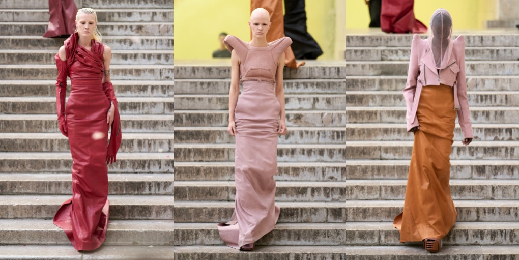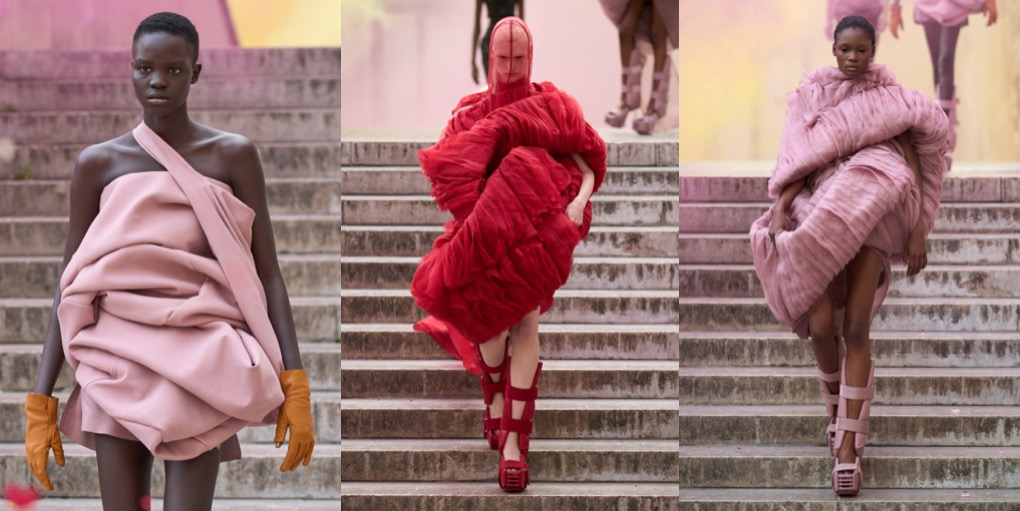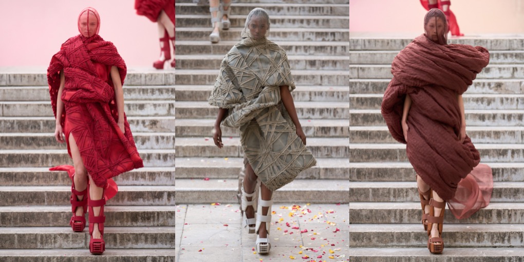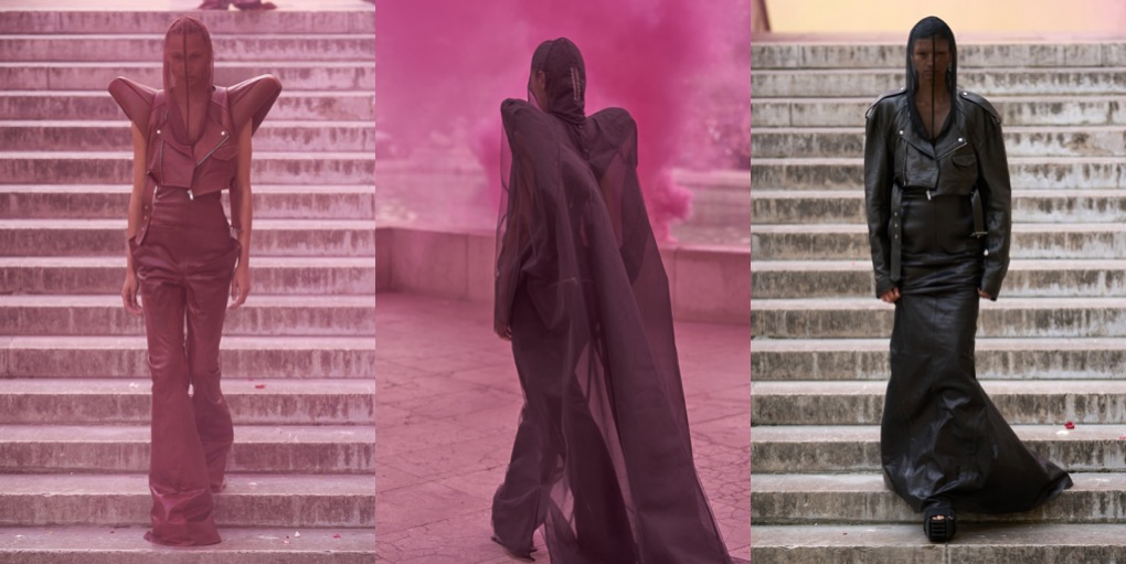 Rick Owens still believes in love. “Considering joy a moral obligation, I propose a stark elegance,” Rick Owens wrote of his highly romantic collection veiled in fuchsia and yellow smoke bombs and rose petals shot out of canons across the courtyard of Palais de Tokyo. “I use it because I’m determined to find joy in life. Because moping around is lazy,” Owens said after the phenomenal show, referring to his use of the word in the show notes. Isn’t his moping around part of the reason we love him? “I know, and I’m good at it. That’s my superpower. But I can’t be lazy and just fall into it. You can’t be passive. You have to be a top,” he smiled. It generated a show that felt like a melancholy march for joy. Models with funeral veils wore narrow floor-length skirts elevated on platform boots, embroidered evening dresses that looked as if they’d been bandaged, and voluminous jumpsuits styled with majestic capes. A palette of black and delicate grey faded into lilacs, passionate reds and golden cognac. For years, Owens conveyed in his work a deep sadness for cultures and environments in decline. Now, he’s being more constructive. “Well, that’s why I talk about hope so much. I allow myself to think about hope because in the history of the world there have always been evil forces, but somehow the good forces have always managed to barely overpower. Because we’re still here. We managed. So, you just have to have faith in the force of goodness.” Don’t think the Rick Owens show was all rose petal confetti, though. “Everything dies,” he said, concluding his pep talk for hope. “Things do get destroyed and something else happens. Everything dies. We always forget that. We’re always trying to be immortal and have things last forever. ‘Oh, they’re [bringing] down this building and it’s a historical monument.’ Well, everything dies. And things replace it. So, that’s my hope-slash-doom message,” Owens smiled. As the underpinning of one of the designer’s most moving and ravishing collections probably ever, it was an empowering one.