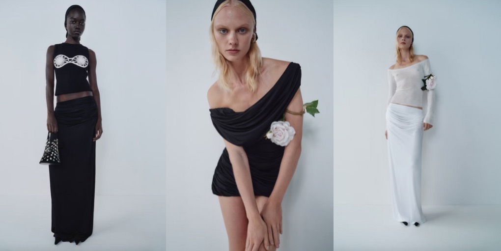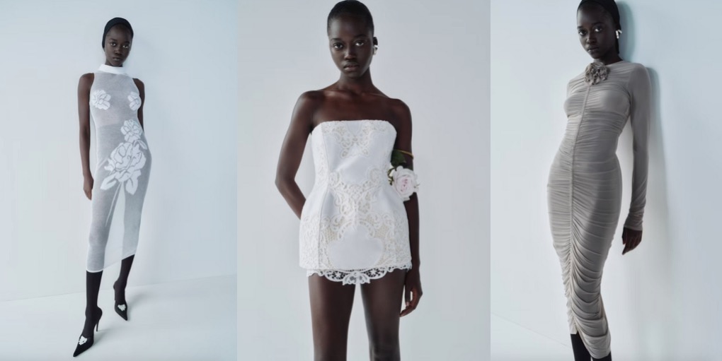 For spring-summer 2024, Magda Butrym emphasizes her vocabulary of signature Slavic chic. Roses are the Polish label’s key signifier, and this season the designer offers a range of iterations of this motif. Silk-petal roses appear on shoes and arm-bracelets; floral shapes are draped around the bustiers, come hand-crotcheted or materialize in form of meticulous lace. The most intriguing version of Butrym’s favorite flowers was created in collaboration with Heven, Breana Box and Peter Dupont’s artisan brand. The gorgeous, blooming necklace made entirely from glass is fit for a goddess. Just like all the sheer, slinky dresses that look light as a feather.