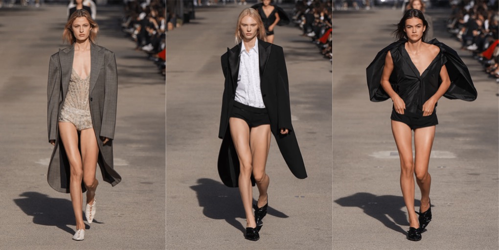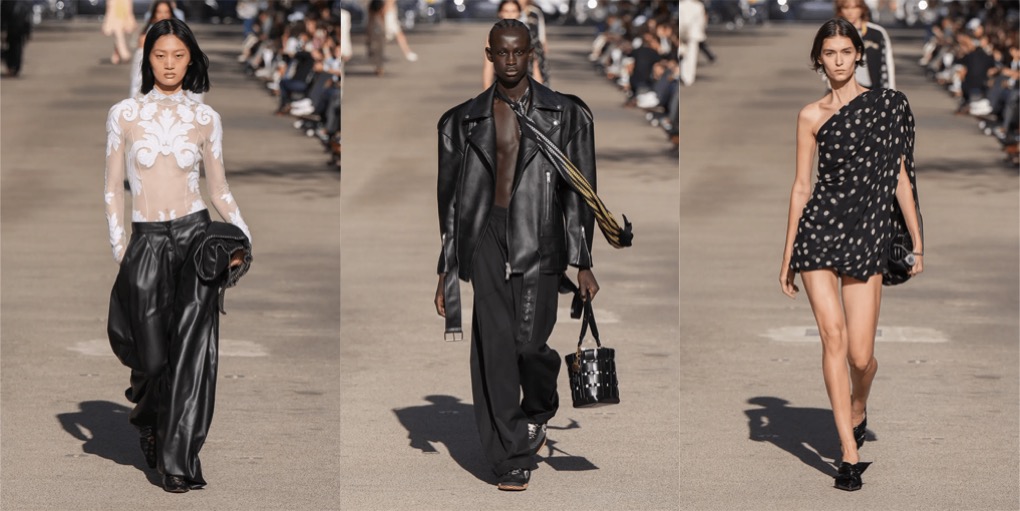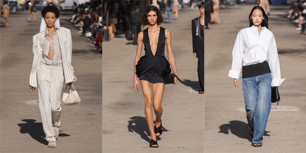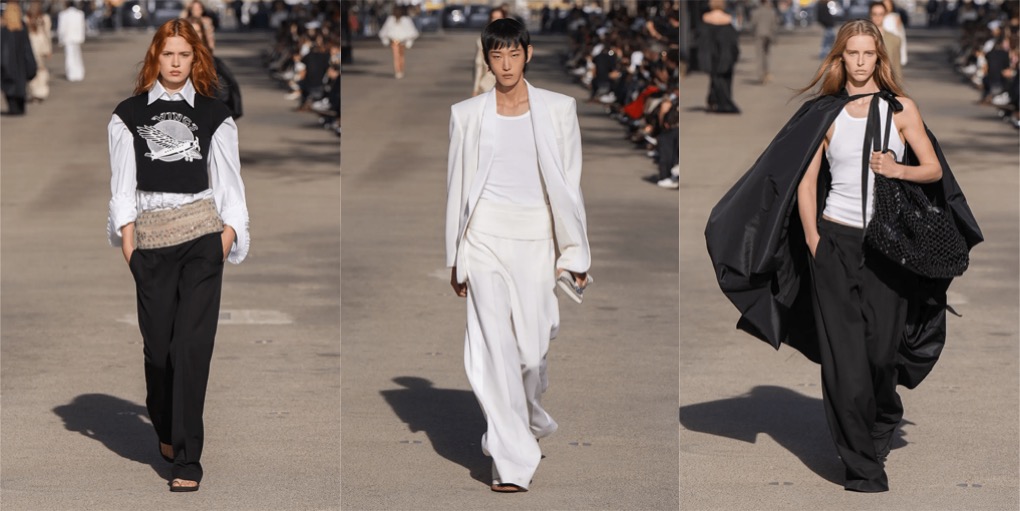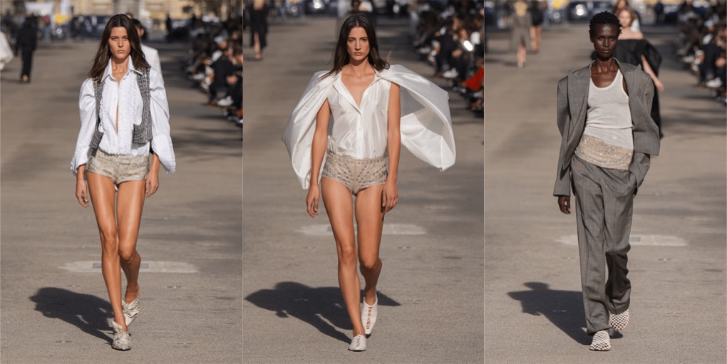This was a very charming Stella McCartney fashion show. Along the Avenue de Saxe in the 7th arrondissement, the designer set up a temporary shop. She created Stella’s Sustainable Market: a classic Parisian marketplace lined with stalls featuring her favourite sustainable collaborators as well as nods to parents, Paul and Linda McCartney. Meanwhile, the collection – sweetly nostalgic, tinged with the 1970s, but also and referencing Stella’s 2000s fashion moments – featured 95 per cent conscious materials, the activist designer noted. “We’ve never gone that high before.” Ballooning blouses, mini dresses and bombers were made in NONA Source repurposed silk taffetas. Lead-free crystals sparkled on waistcoats, mini dresses were made of forest friendly viscose and crochet-and-mirror knits were spun from Kelsun™️ – a seaweed-based yarn. McCartney’s models walked the marketplace runway in a shared wardrobe that represented the family feeling she wanted to convey. “This was one of the first shows we’ve ever had with women and men. It was about showing that everyone can wear it, and how you say what you are through what you wear,” she said. “It doesn’t matter what gender you are. Our brand is open to everyone.”