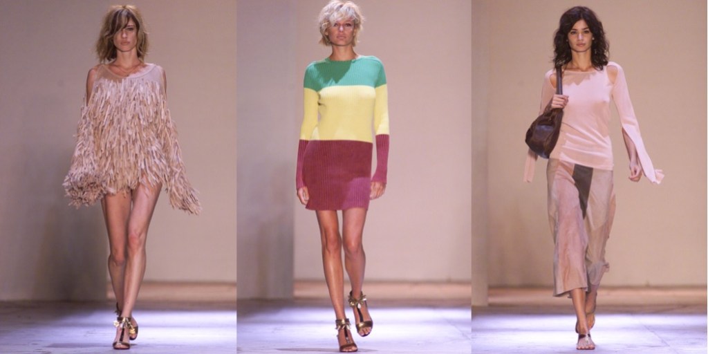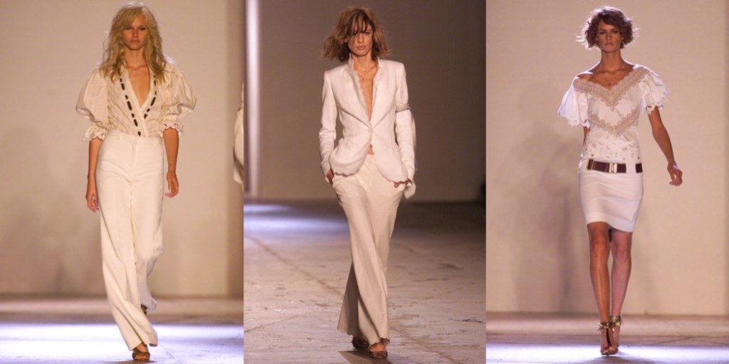 Since Phoebe Philo‘s big comeback that we’ve all experienced during the late autumn, I love digging into her work at Chloé – an underrated era from early 2000s, before reinventing Céline. What I find truly intriguing is that Philo subtly refers to her Chloé days in her new work. For her spring-summer 2002 debut , avoiding in-your-face rock ’n’ roll attitude, the British designer blurred the distinction between day and evening wear with breezy separates inspired by ’70s Saint Tropez, Brigitte Bardot, and Talitha Getty. A sense of easygoing elegance permeated everything from fitted tops with intricately worked sleeves to lace-trimmed camisoles and fabulous monkey-appliqué bathing suits. A long suede skirt with blush gray and black panels exuded earthy chic, as did the Moroccan-style beaded bags and sandal-boots in aged gold leather. There were also plenty of high-impact sexy staples, a category Philo and Stella McCartney introduced to the brand during the latter’s tenure (Phoebe was Stella’s right-hand at that time). The low-slung flared pants with flirty cutouts at the hips, pinafore shorts, summery minidresses and punchy T-shirts with net backs could easily pass in 2023 and look absolutely HOT.