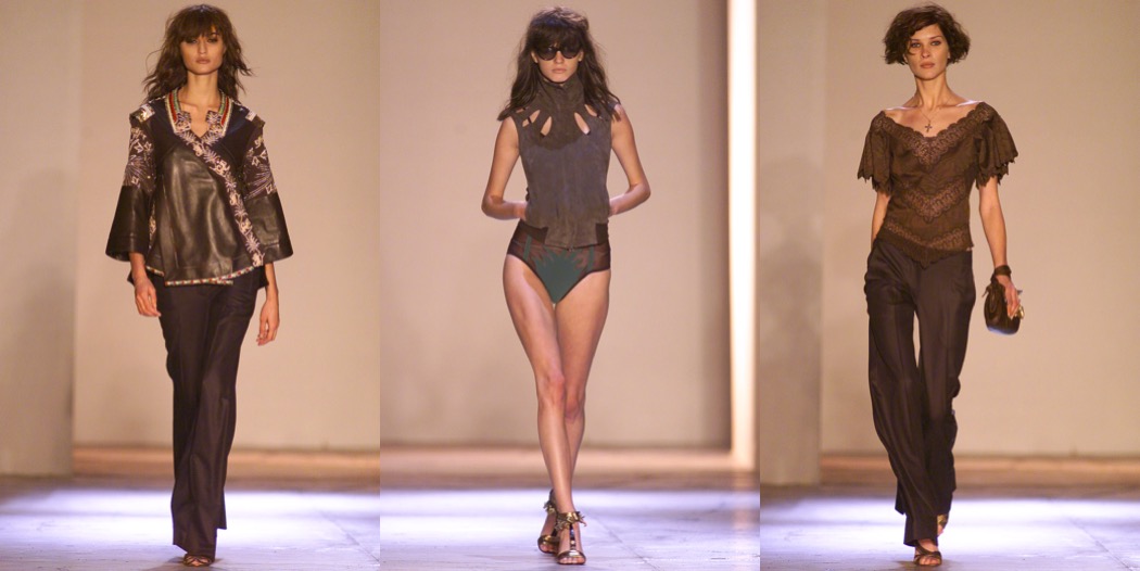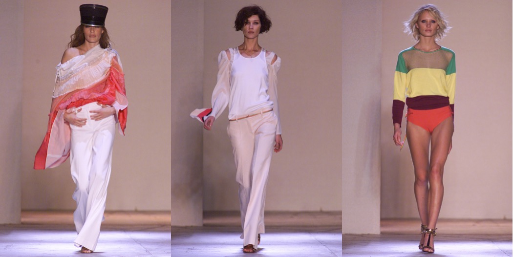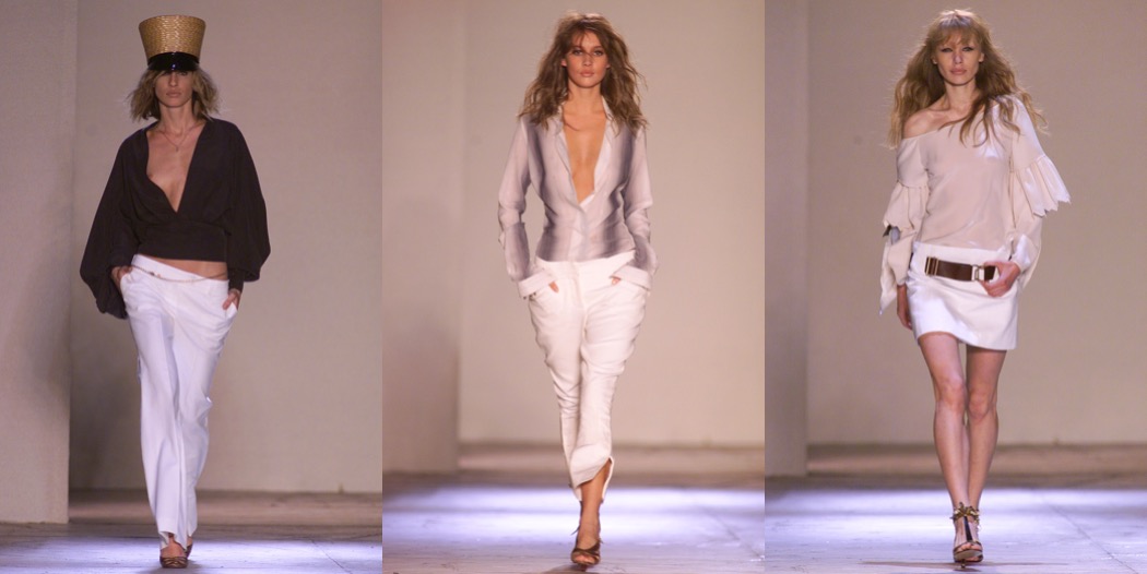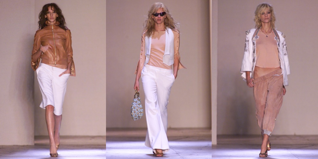 Since Phoebe Philo‘s big comeback that we’ve all experienced during the late autumn, I love digging into her work at Chloé – an underrated era from early 2000s, before reinventing Céline. What I find truly intriguing is that Philo subtly refers to her Chloé days in her new work. For her spring-summer 2002 debut , avoiding in-your-face rock ’n’ roll attitude, the British designer blurred the distinction between day and evening wear with breezy separates inspired by ’70s Saint Tropez, Brigitte Bardot, and Talitha Getty. A sense of easygoing elegance permeated everything from fitted tops with intricately worked sleeves to lace-trimmed camisoles and fabulous monkey-appliqué bathing suits. A long suede skirt with blush gray and black panels exuded earthy chic, as did the Moroccan-style beaded bags and sandal-boots in aged gold leather. There were also plenty of high-impact sexy staples, a category Philo and Stella McCartney introduced to the brand during the latter’s tenure (Phoebe was Stella’s right-hand at that time). The low-slung flared pants with flirty cutouts at the hips, pinafore shorts, summery minidresses and punchy T-shirts with net backs could easily pass in 2023 and look absolutely HOT.