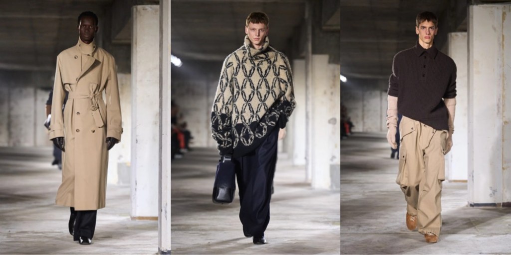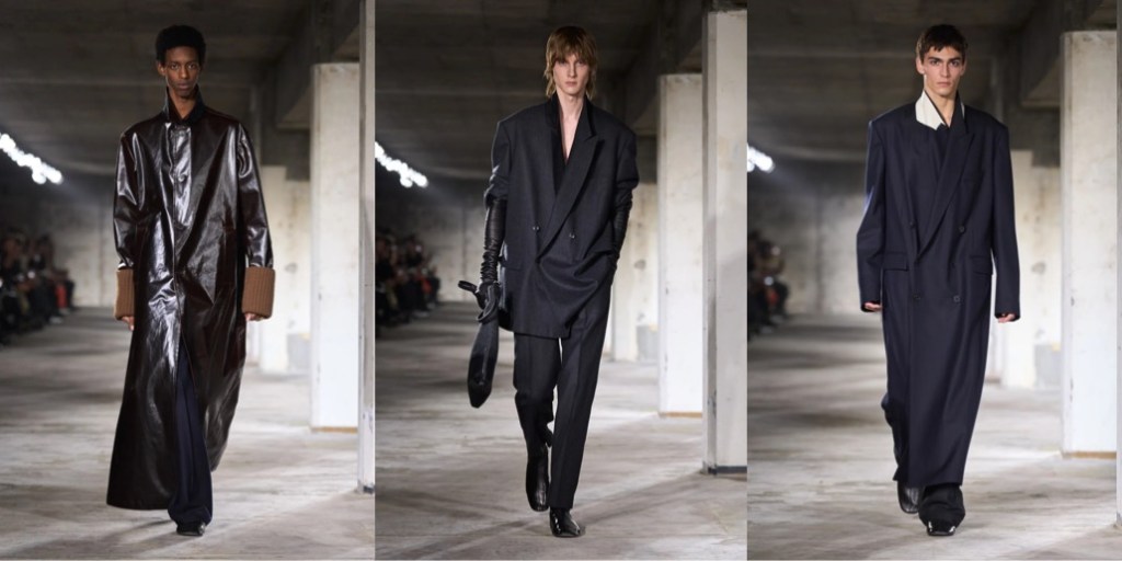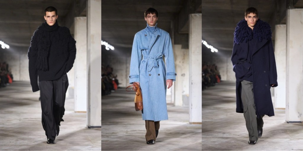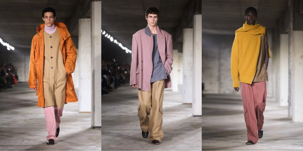 Dries Van Noten proves that the ultimate recipe for timeless, yet unexpected elegance consists of the following: classic, slightly over-sized clothes that you can make the most of styling-wise, a little play with textures, and a color palette consisting of black and a couple of surprises. “An elegant look for young guys, but combining things sometimes in a rather strange way,” is how the beloved Belgian designer described his intention backstage. There were oddities, mostly in the aforementioned styling: the way chunky ribbed-knit sweaters with an arching side zip were half worn: one sleeve filled, the other wound around the neck like a scarf. Ribbed knit details recurred as wide cuffs on all manner of coats. Denim shirts were bunched up and caught with big safety pins – a punk touch – and a camel polo shirt stretched to the fingertips. Striking but never jarring, Van Noten’s knack for combining colors and prints, and matching trouser volumes to a diverse array of tailored toppers, warrants closer study for anyone interested in pursuing great style.