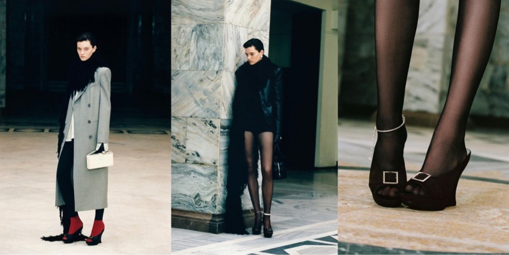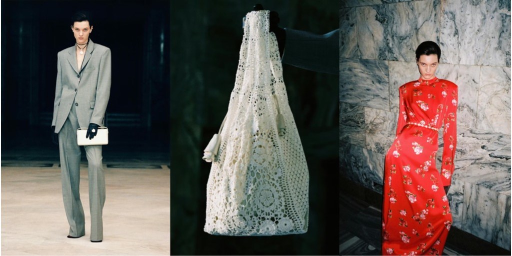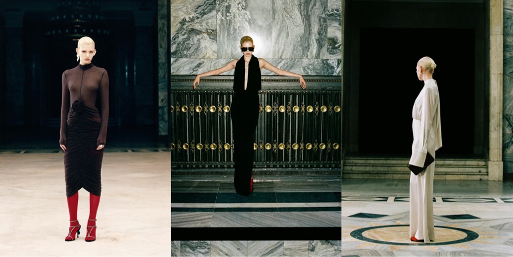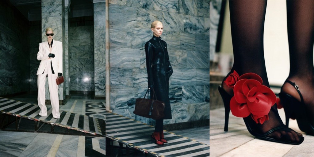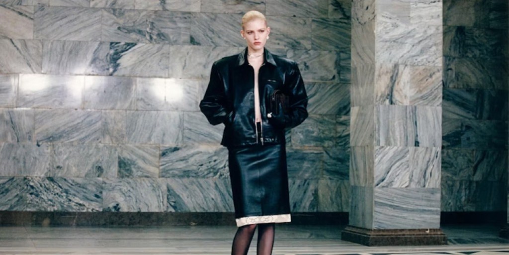 The latest Magda Butrym collection, photographed by Vitali Gelwich in the cinematic, soc-realist halls of Warsaw’s Palace of Science and Culture, is a sexy take on the designer’s sensual eveningwear and razor-sharp tailoring. Kept in the color palette of signature rose-red, white and black, the line-up, mood-wise, is somewhere between Wong Kar-Wai’s elusive “In The Mood For Love” (just take a look at the scarlet gown covered in bouquets of flowers) and David Leitch’s explosive “Atomic Blonde” (the black leather coat is giving badass secret agent). Butrym feels more and more confident in playing around with the feminine and masculine codes, and that shows. Her pre-fall 2024 heroine is both chic and “don’t cross me” in her all-black, all-leather looks. In case of accessories, the ultimate highlights are the maxi-length, ribbed scarves, nonchalantly worn like feather boas, and the hand-crocheted shopper bag: a nod to the brand’s Polish heritage and love for artisanship.